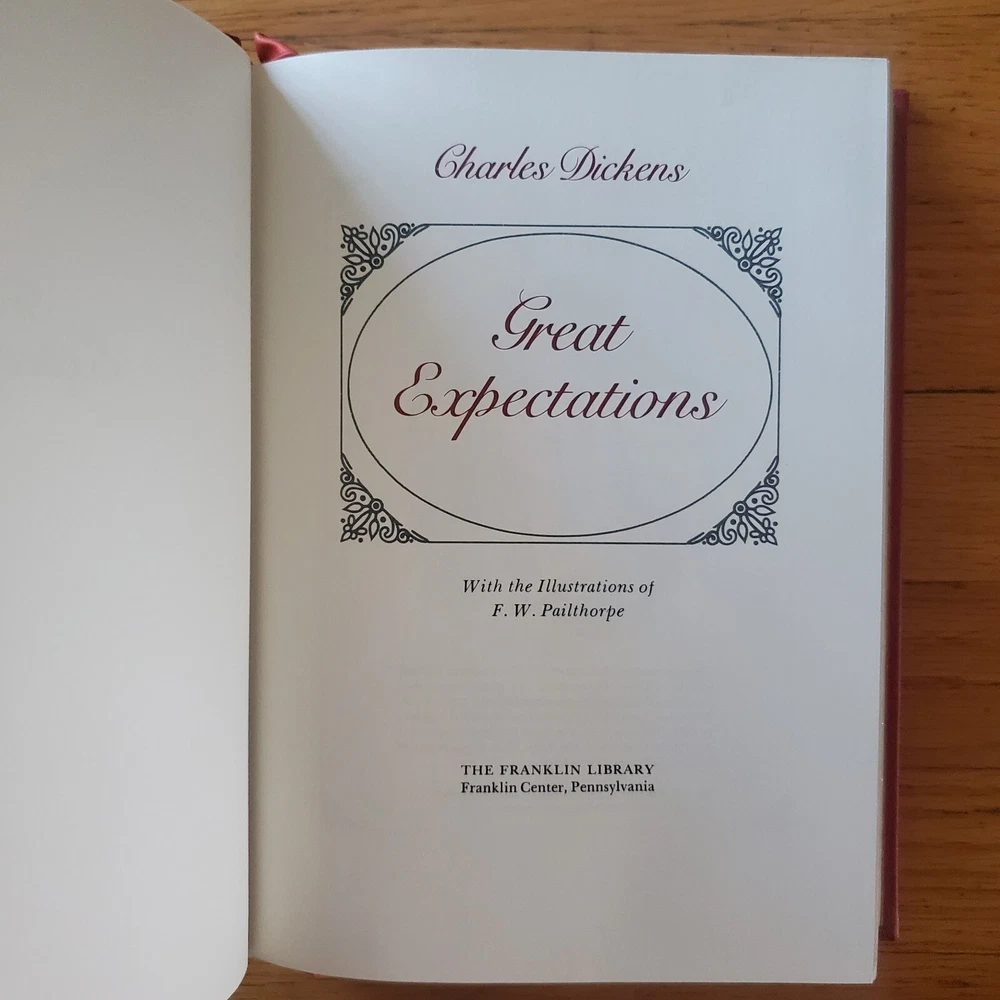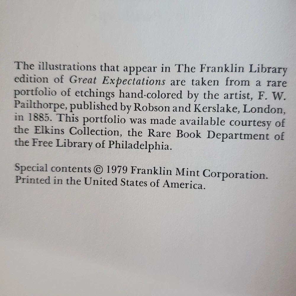 Up for sale is a hardcover leather copy with gold gilded edges of "Great Expectations", written by Charles Dickens and published by the Franklin Mint Library in 1979. As seen in the photos, the book is in very good overall condition. A great find for any literary buff. Shipping is $6.95 via US Postal Service Media Mail within the USA. Please take a look at my other listings of literary masterpieces published by the Franklin Library to add to your collection. Buy with confidence. 20+ year eBay member with 100% positive feedback. Please let me know if you have any questions.