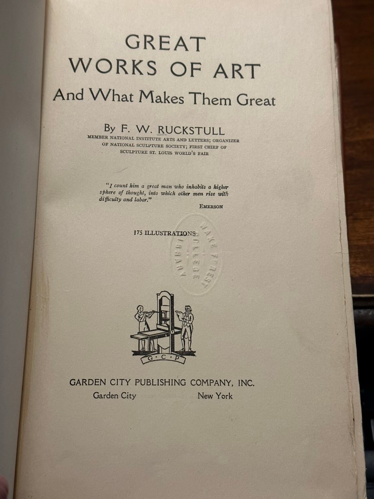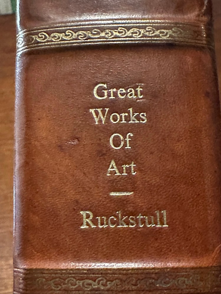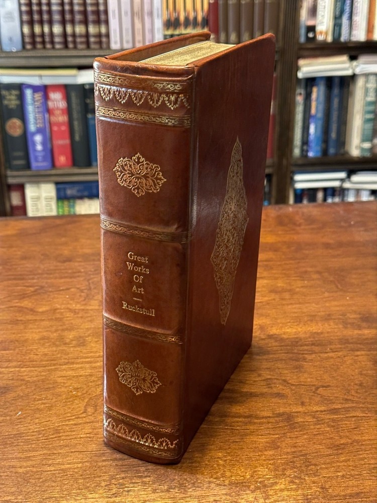 GREAT WORKS OF ART & WHAT MAKES THEM GREAT by: F. W. Ruckstull GOOD CONDITION - HARDCOVER - GENUINE LEATHER BOUND - 1925 1ST EDITION - ILLUSTRATED “Library Binding” - Item Pictured is the One You WILL Receive! (does have minor markings) About the Book: Title: Great Works of Art and What Makes Them Great Author: F. W. Ruckstull Publisher: Grand Central Publishing Special At tributes : Genuine Leather Bound - First Edition - Illustrated Format: Hardcover - No Dust Jacket - Leather Bound Copyright: 1925 Pages: 548 ISBN: not available Dimensions: 7.00 x 10.25 x 2.25 inches