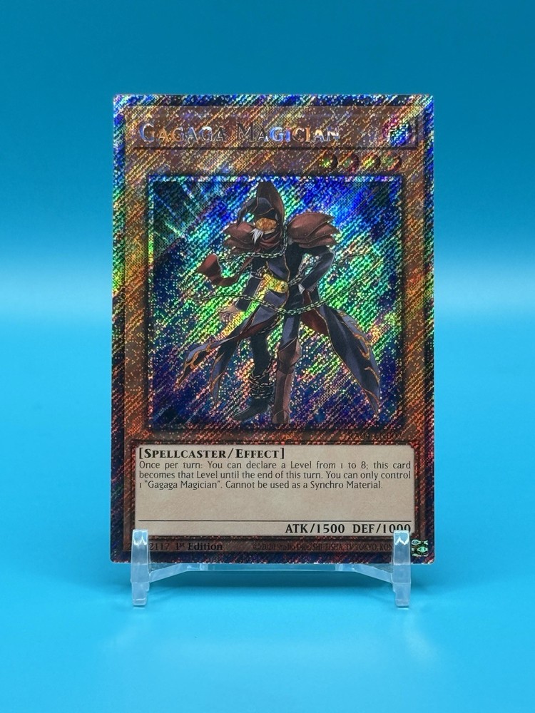 The Gagaga Magician card from the Quarter Century Stampede set is a highly sought-after Platinum Secret Rare card in the Yu-Gi-Oh! TCG. This Dark attribute monster features the character Gagaga Magician as an Effect Monster and Spellcaster. Manufactured by Konami, this 1st Edition card has a beautiful foil finish and is a valuable addition to any collector's deck. Its unique attributes and rarity make it a standout card for fans of the game.