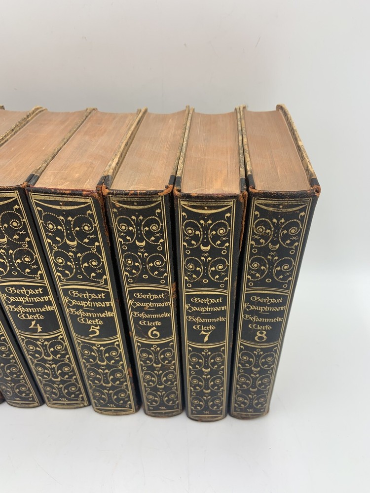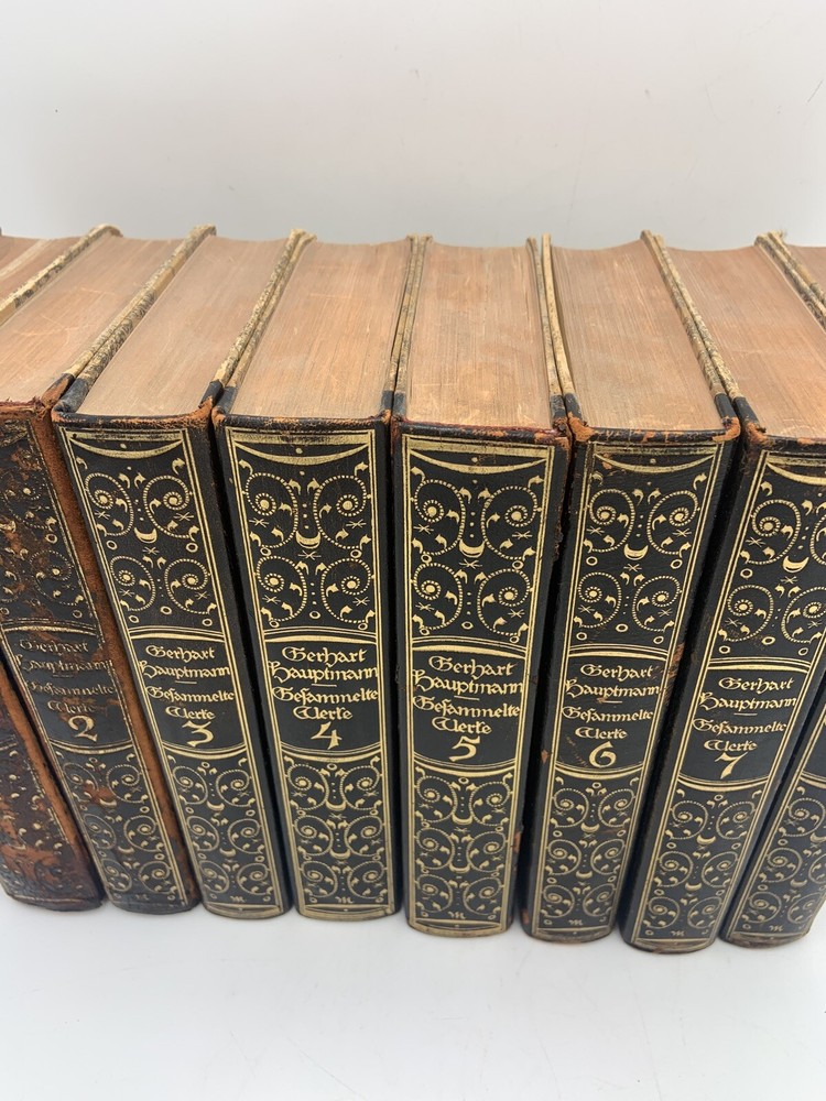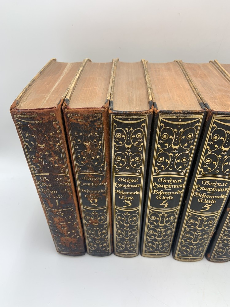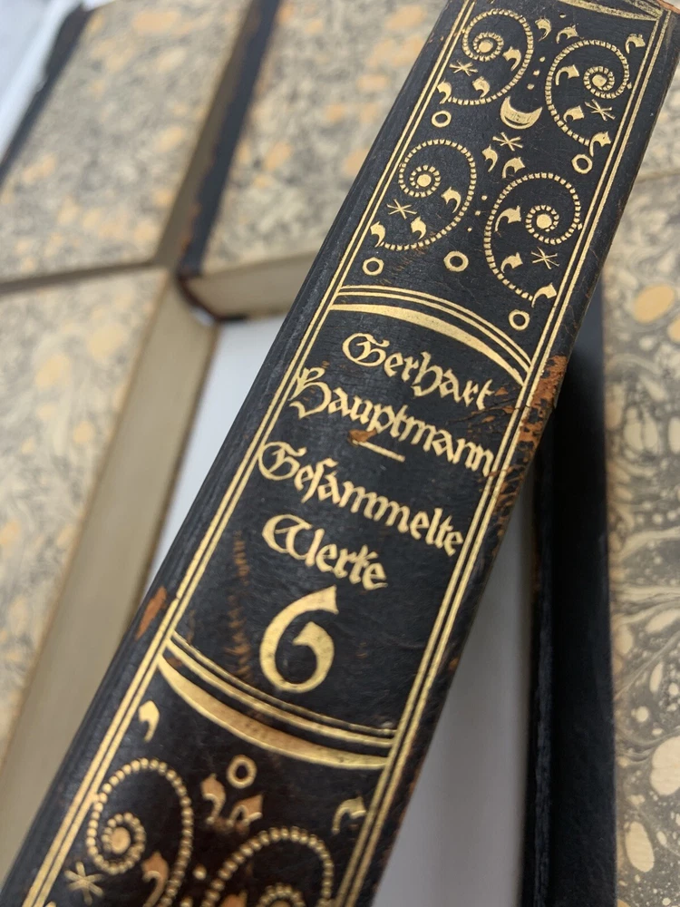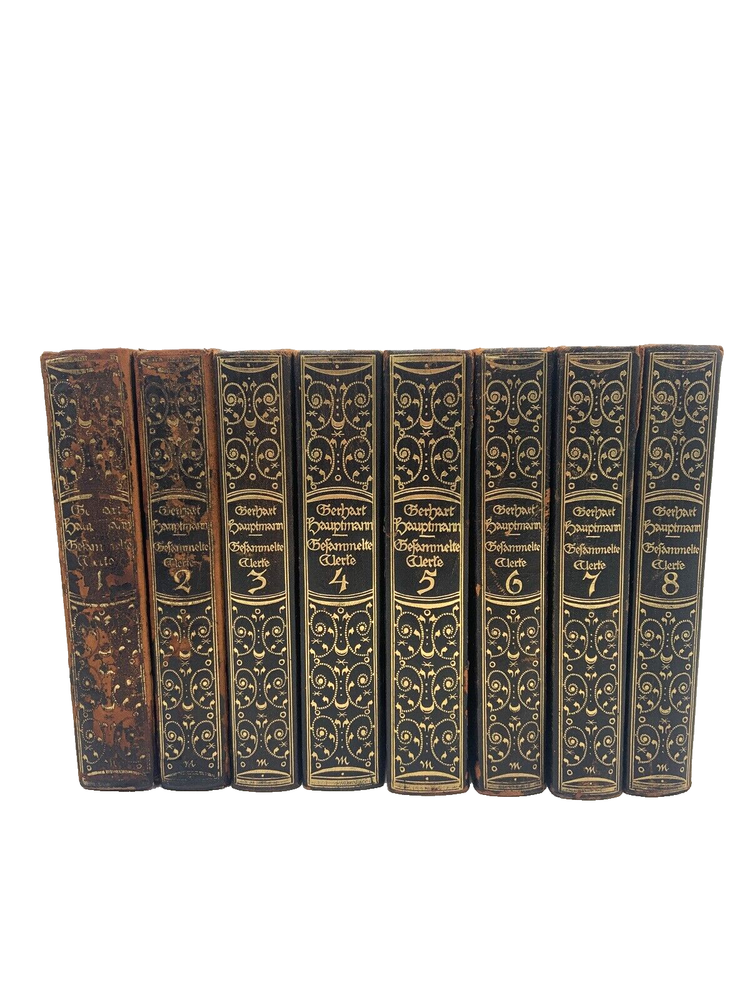 Old eight volume set by Gerhardt Hauptmann (1862-1946) German playwright, poet, novelist and recipient of Nobel Prize for Literature in 1912 "Gesammelte Werke In Acht Bänden" Collected works published in 1922 by Fisher, Berlin Text is in German in Gothic print Leather spines with gilt lettering, marbled front and back boards Some chips/wear to spines, all spines treated with 2 coats archival cellulose to treat red rot No odors, light pencil mark on front pages Interior pages are clean and intact, first page in vol 8 beginning to separate Sold as shown Estate sale find Visit our Cool Vintage Finds Store on eBay for more vintage books and other desirable collectibles