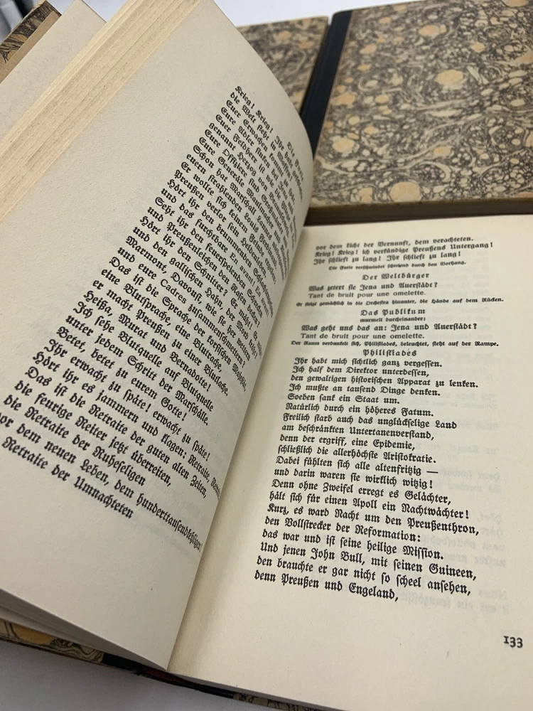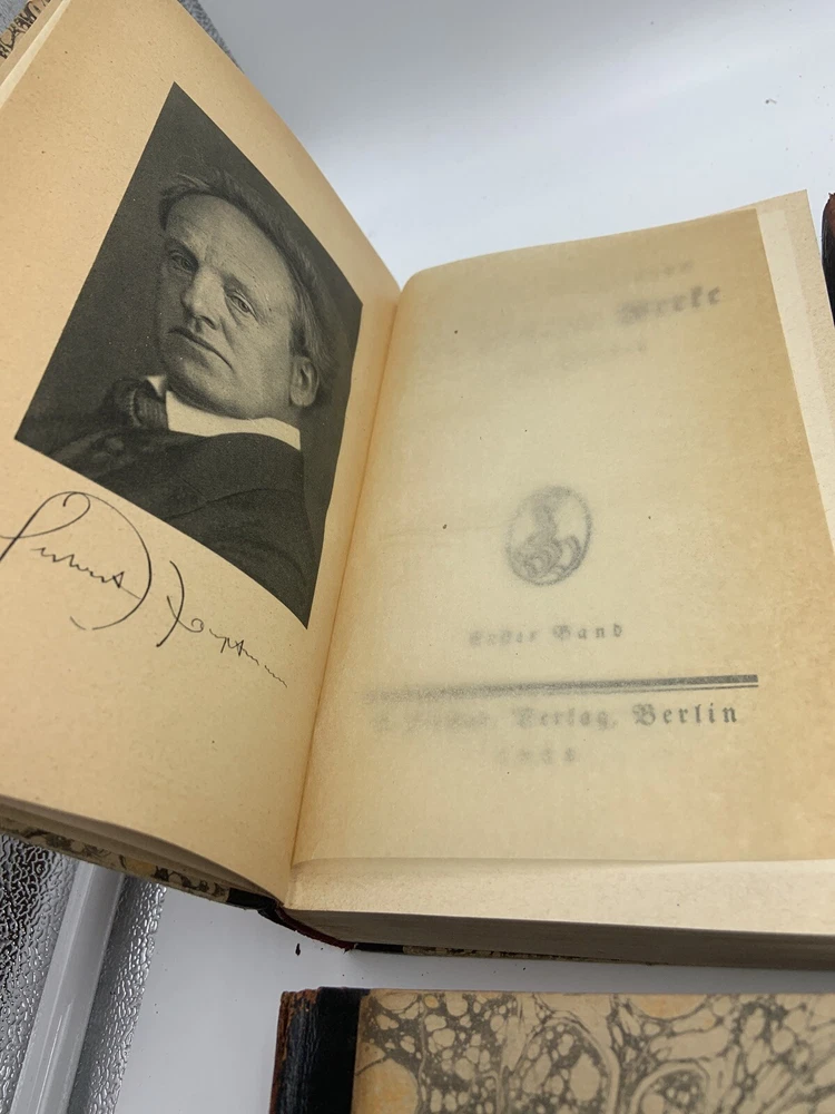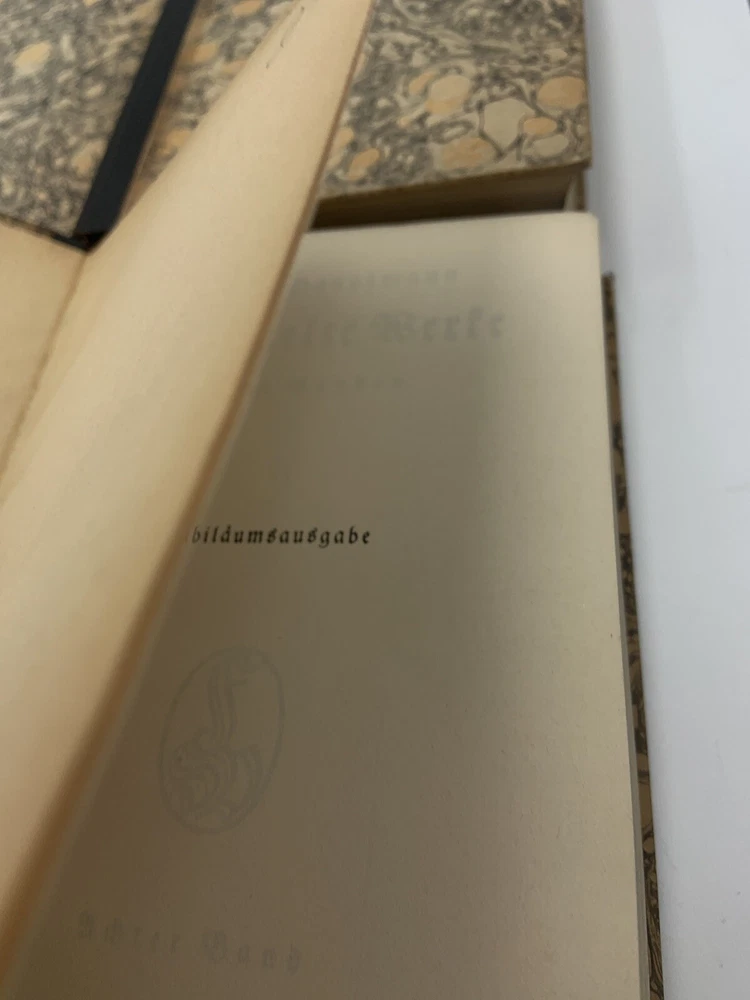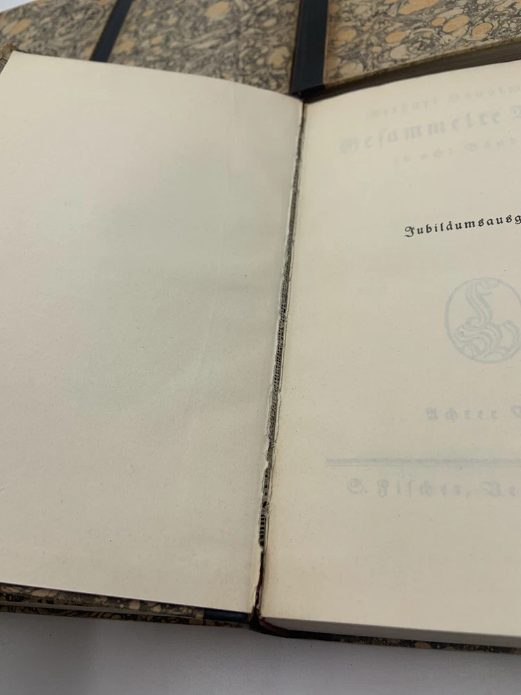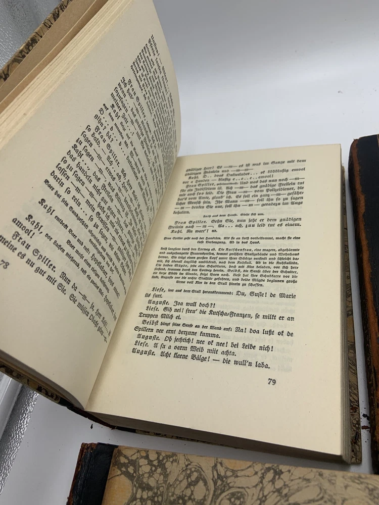 Old eight volume set by Gerhardt Hauptmann (1862-1946) German playwright, poet, novelist and recipient of Nobel Prize for Literature in 1912 "Gesammelte Werke In Acht Bänden" Collected works published in 1922 by Fisher, Berlin Text is in German in Gothic print Leather spines with gilt lettering, marbled front and back boards Some chips/wear to spines, all spines treated with 2 coats archival cellulose to treat red rot No odors, light pencil mark on front pages Interior pages are clean and intact, first page in vol 8 beginning to separate Sold as shown Estate sale find Visit our Cool Vintage Finds Store on eBay for more vintage books and other desirable collectibles
