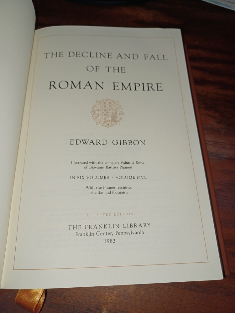 No reserve. The Decline and Fall of the Roman Empire, Volume 5 only (perhaps the scarcest in the set), written by Edward Gibbon. Full-sized volume published by The Franklin Library. Fully leather bound with gilding to both boards, all three text block edges, and spine (which also features raised bands). Silk end pages. Not a Book Club Edition or ex-library book. Book remains in very good or better condition. Cover shows mild wear. Spine square, binding solid, and interior appears writing-free. S/H $7.9 media mail in bubble pack envelope without cardboard inserts; $10.99 in box.
