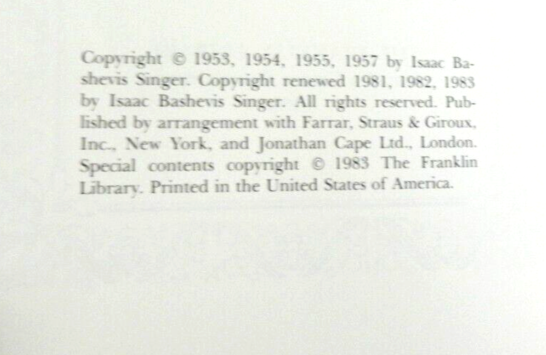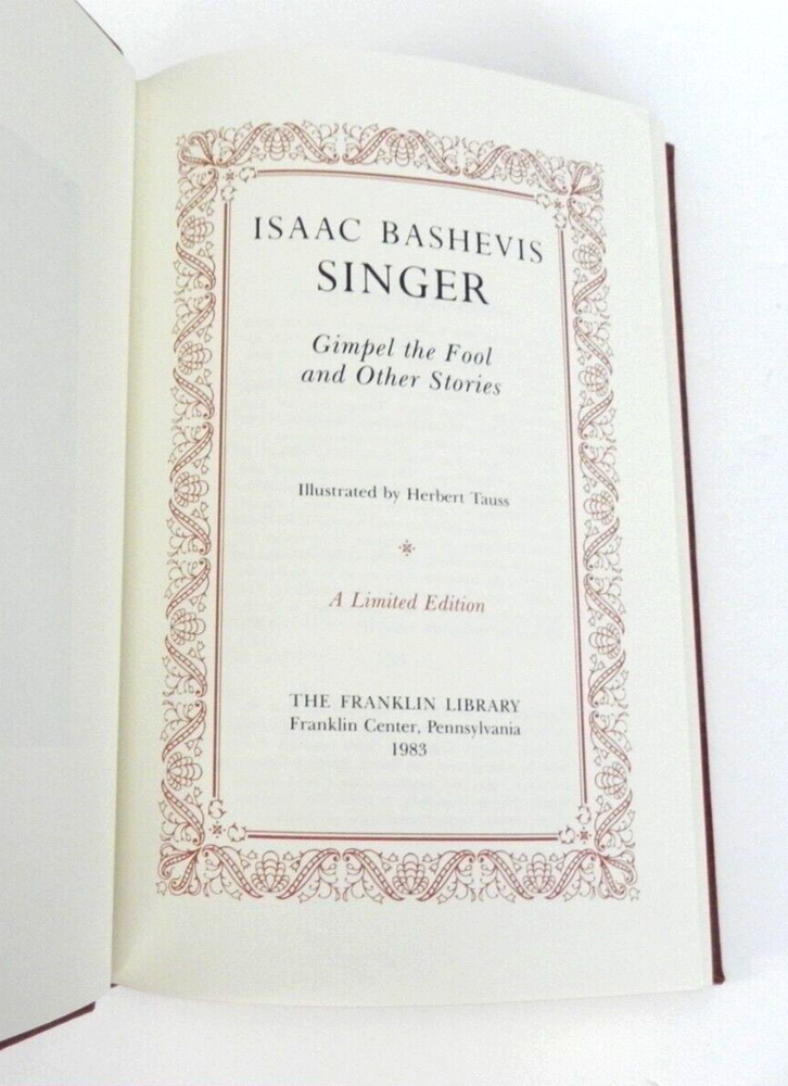 This stunning Franklin Library edition of *Gimbel the Fool* is a true collector's gem! The genuine leather binding, moiré endpapers, and gilt-edged pages give it a luxurious feel, while the raised bands and ribbon bookmark add elegant touches. It looks brand new—unopened, unread, and pristine. A must-have for fans of Singer or fine book collectors. The craftsmanship is impeccable, making it a standout piece for any library. Don't miss this rare find!