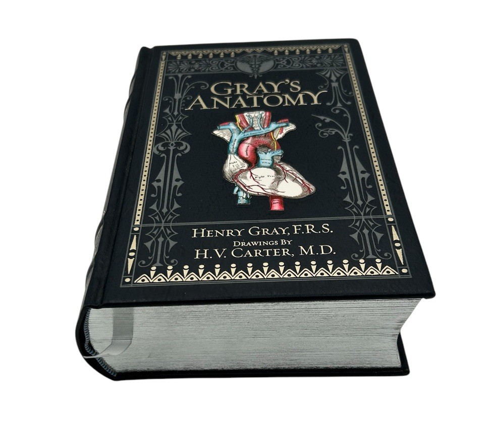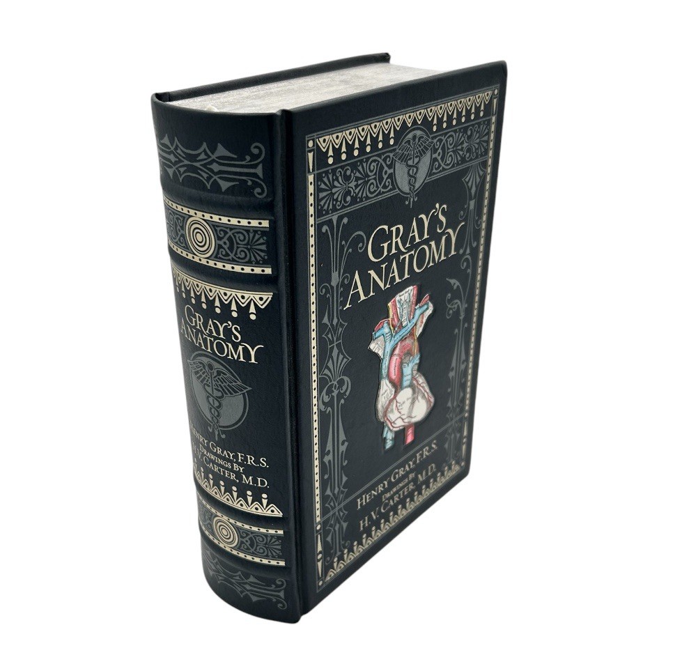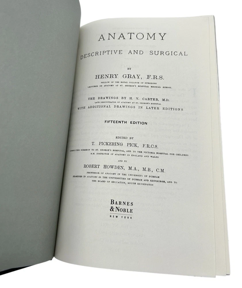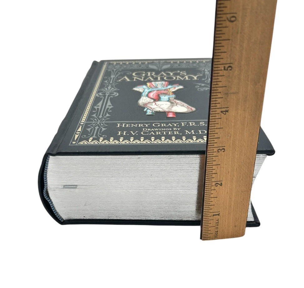 Very good pre-owned condition; complete pages and cover, secure binding, attached ribbon bookmark, silver tone gilt edges, patterned end sheets. No markings within the text / pages. Small bump on top corner edge ** SEE Photo details Gray's Anatomy by Henry Gray, Drawings by H.V. Carter M.D. Barnes and Noble Illustrated Collectible Edition Hardcover, bonded leather. Approx 9.25" x 6.25" x 2.5", 1096 pages (4lbs)