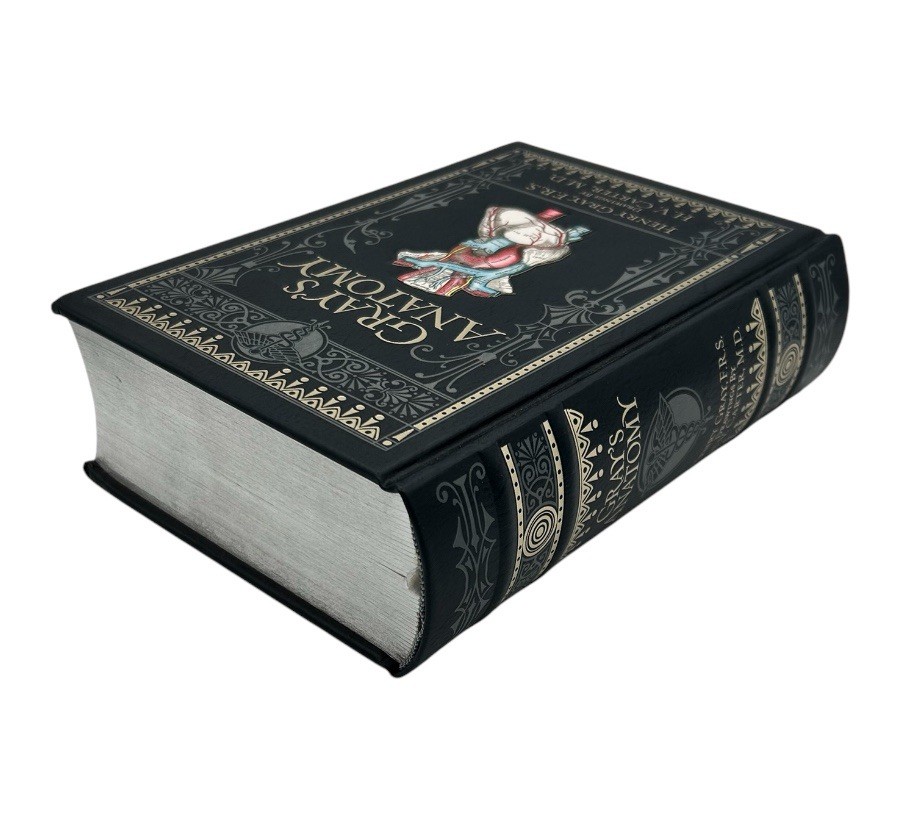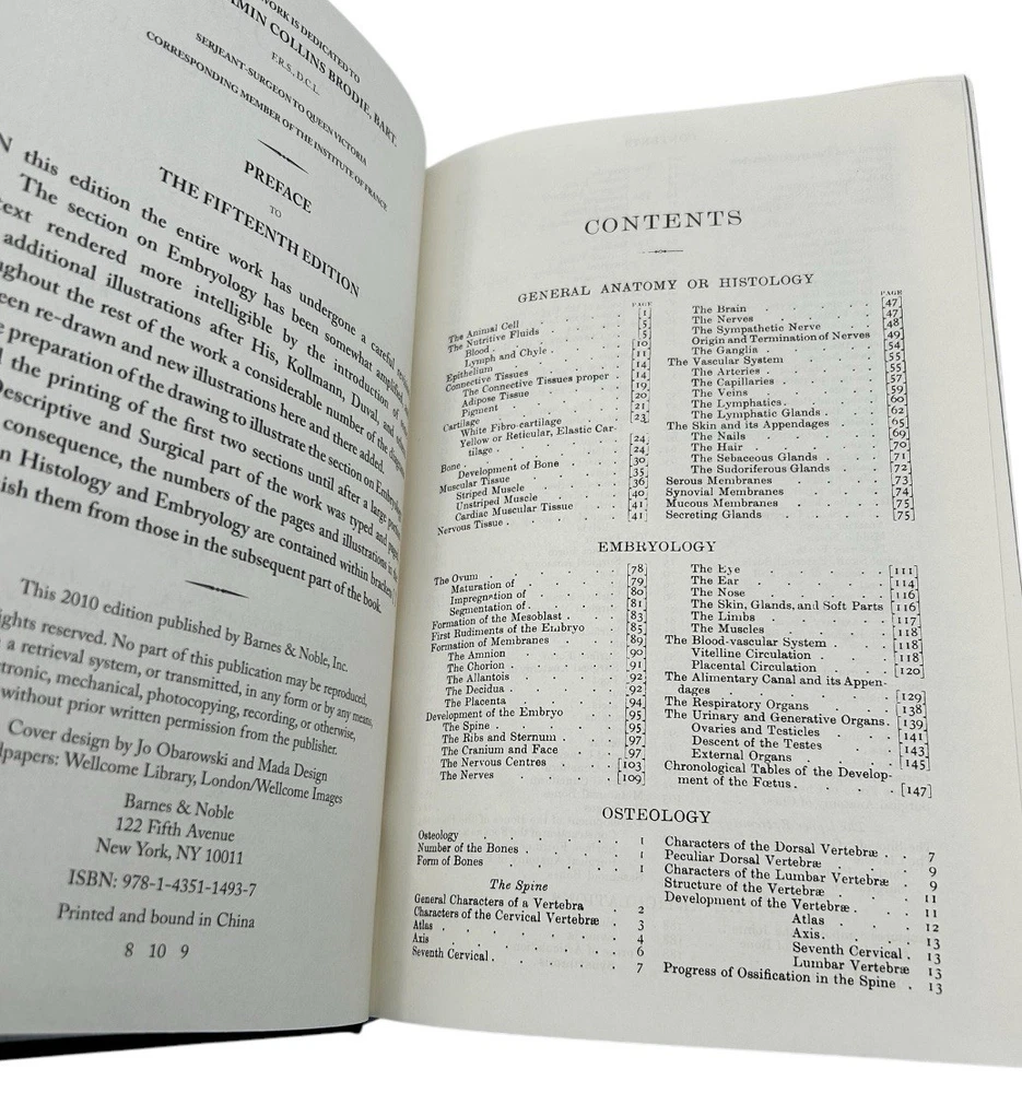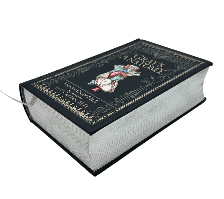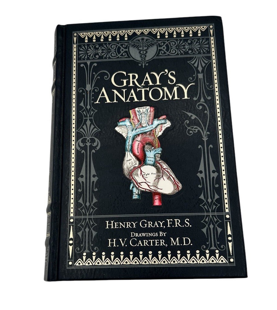 Very good pre-owned condition; complete pages and cover, secure binding, attached ribbon bookmark, silver tone gilt edges, patterned end sheets. No markings within the text / pages. Small bump on top corner edge ** SEE Photo details Gray's Anatomy by Henry Gray, Drawings by H.V. Carter M.D. Barnes and Noble Illustrated Collectible Edition Hardcover, bonded leather. Approx 9.25" x 6.25" x 2.5", 1096 pages (4lbs)