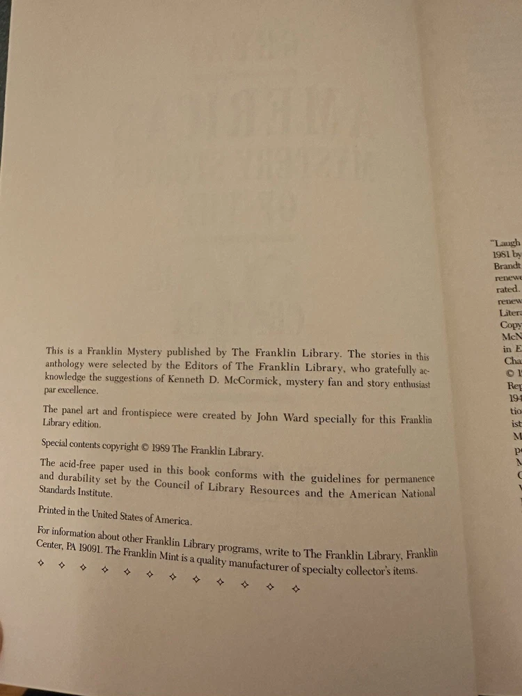 Immerse yourself in a world of suspense and intrigue with the Great American Mystery Stories Of The 20th Century, a collection of captivating short stories bound in faux leather and illustrated with stunning visuals. This Franklin Library Edition publication from 1989 is a must-have for mystery lovers, featuring various authors and classic literature topics that will keep you on the edge of your seat. Measuring about 6.25 inches in length and 9.5 inches in height, this hardcover book is suitable for young adults and adults alike. With 415 pages of gripping narratives, it's an excellent addition to any personal library or a thoughtful gift for a fellow bookworm.