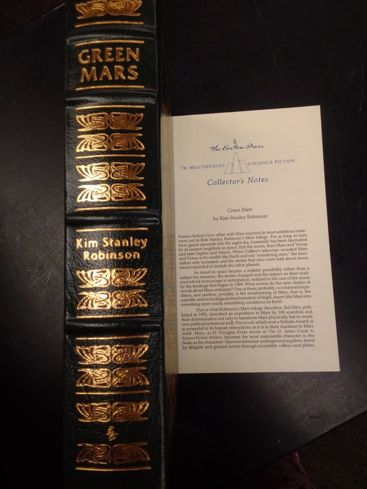 Green Mars is a significant science fiction novel, especially as the second book in Kim Stanley Robinson's acclaimed Mars Trilogy. Detailed Exploration of Terraforming: "Green Mars" continues the in-depth depiction of the terraforming of Mars, showcasing the process of making the planet habitable for humans, including increasing atmospheric pressure and introducing plant life. It delves into the scientific and technical challenges of transforming a barren planet into a habitable one. Political and Social Commentary: The novel explores the complex political ideologies and conflicts that emerge in the Martian colonization effort. The struggle for independence from Earth and the tensions between different factions, particularly between the "Reds" (who want to keep Mars in its untouched state) and the "Greens" (who favor terraforming), are central to the plot. Environmental Themes: "Green Mars" raises thought-provoking questions about environmentalism, the ethics of colonization, and the rights of native Martian life, including the introduction of genetically engineered animals. It tackles the debate between preserving a planet's natural state and transforming it for human habitation. Ecotopian Vision: Robinson explores the concept of "ecotopianism" – the idea of creating a utopian society based on ecological principles and harmony. "Green Mars" showcases a future where human imagination and technological innovation can work together to build a sustainable world. Award-Winning Recognition: The book won the Hugo Award for Best Novel in 1994, solidifying its place as a significant work in the science fiction genre and the larger Mars Trilogy. Continuation of the Mars Trilogy: "Green Mars" builds upon the foundations laid in "Red Mars", deepening the characters and the narrative, and setting the stage for the concluding volume, "Blue Mars". Easton Press specializes in producing high-quality, collectible editions of books. They use premium materials like genuine leather for the bindings, which adds a luxurious feel and ensures durability. Aesthetic Features: Their books feature attractive design elements such as: 22-karat gold embossing:Accents and lettering on the cover and spine are done with 22-karat gold. Gilded page edges:The page ends are gilded with gold for both beauty and protection. Hubbed spines: Traditional raised rings on the spine give the books a classic, antique look. Silk moir endpapers:These add a touch of sophistication. Satin ribbon page marker:A convenient and attractive addition. Durability and Quality: Easton Press books are printed on acid-neutral paper that is thread-sewn, ensuring the books are durable and can last for generations. Collectibility: Many Easton Press books are part of limited editions or signed series, making them highly sought after by collectors. These factors can contribute to their market va