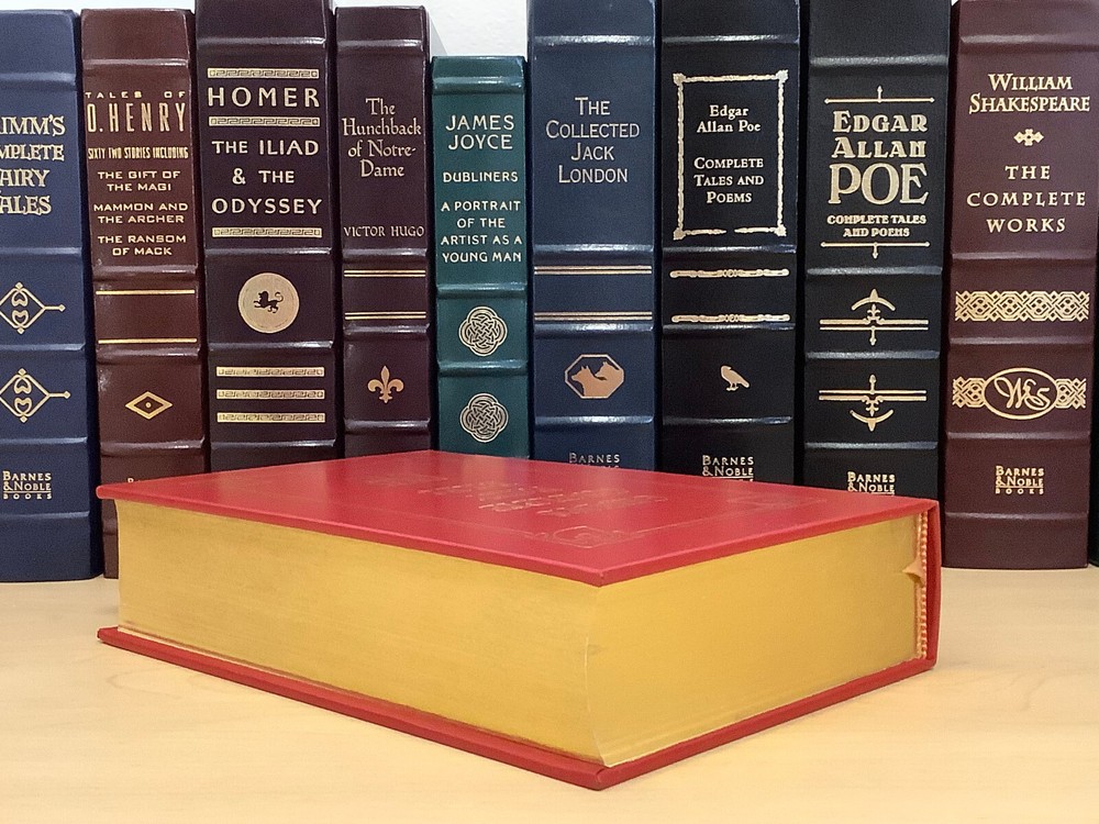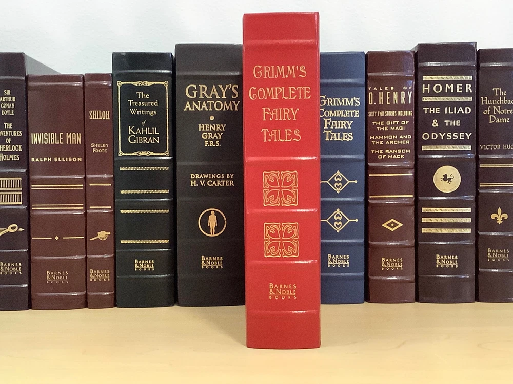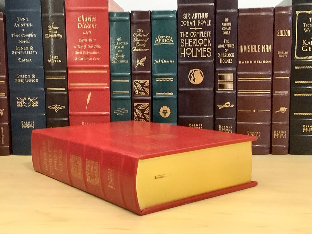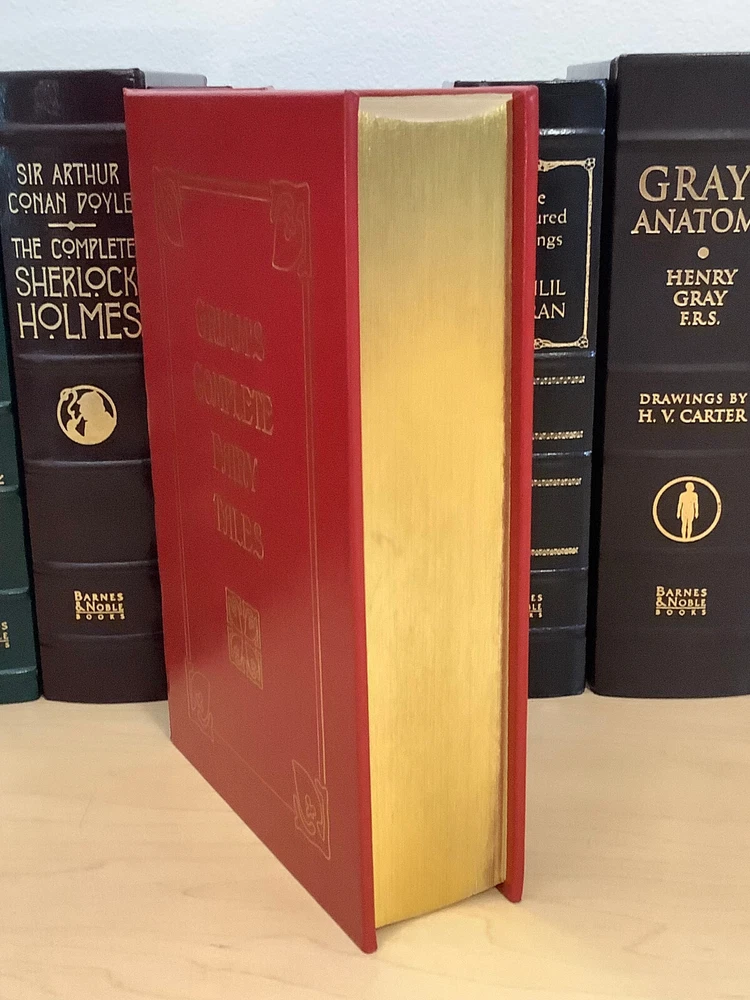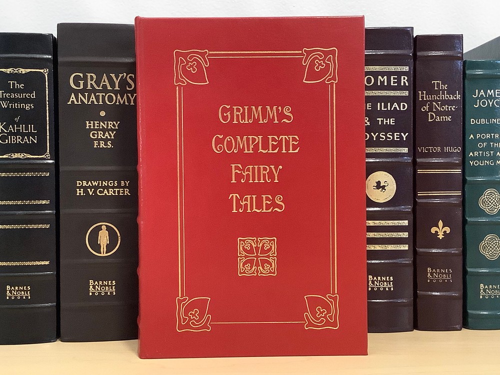 Grimm’s Complete Fairy Tales bound in leather, with gilt edged pages and a ribbon marker A collection of 211 tales Item Condition: This is a leatherbound hardcover in Very Good condition. There are no names, bookplates or stamps from previous owners inside. The binding is tight, and the pages are clean. The gilt page edging has some light wear including marks / dings. The leather is in nice condition, and the gilt accents are bright, there is some light rubbing to the corners and spine. Dimensions are approx: 9.25" x 6.25" x 2" This book will ship in a box with bubble wrap. Photos are of the actual book that will be shipped.