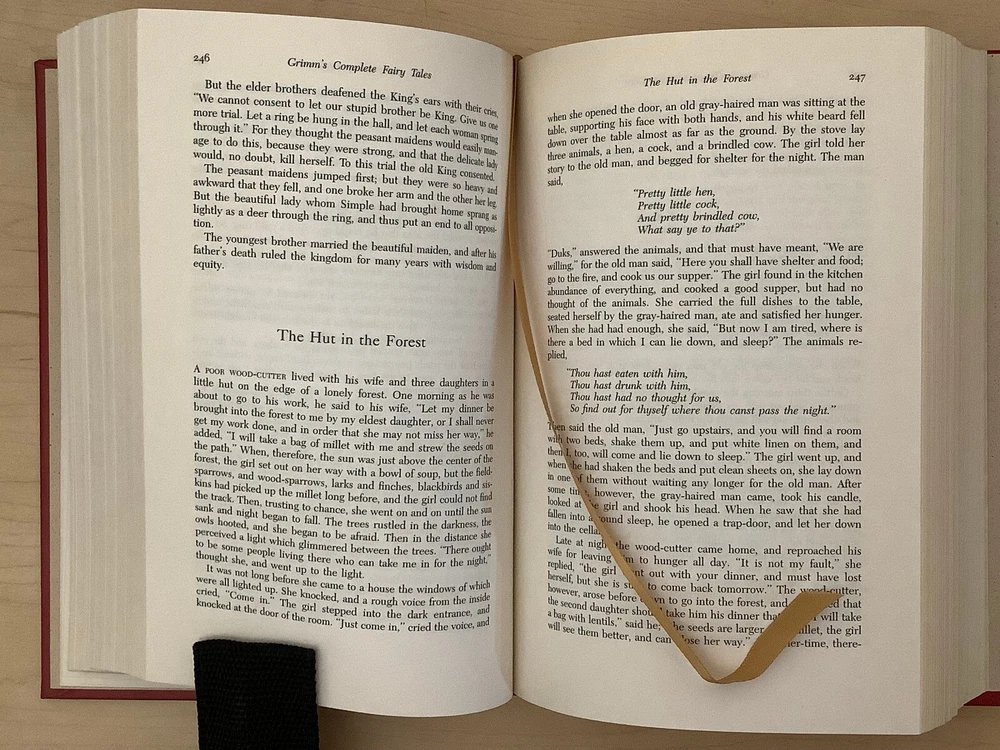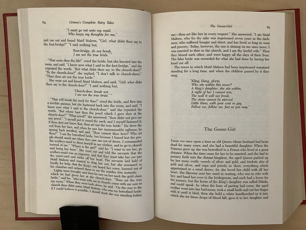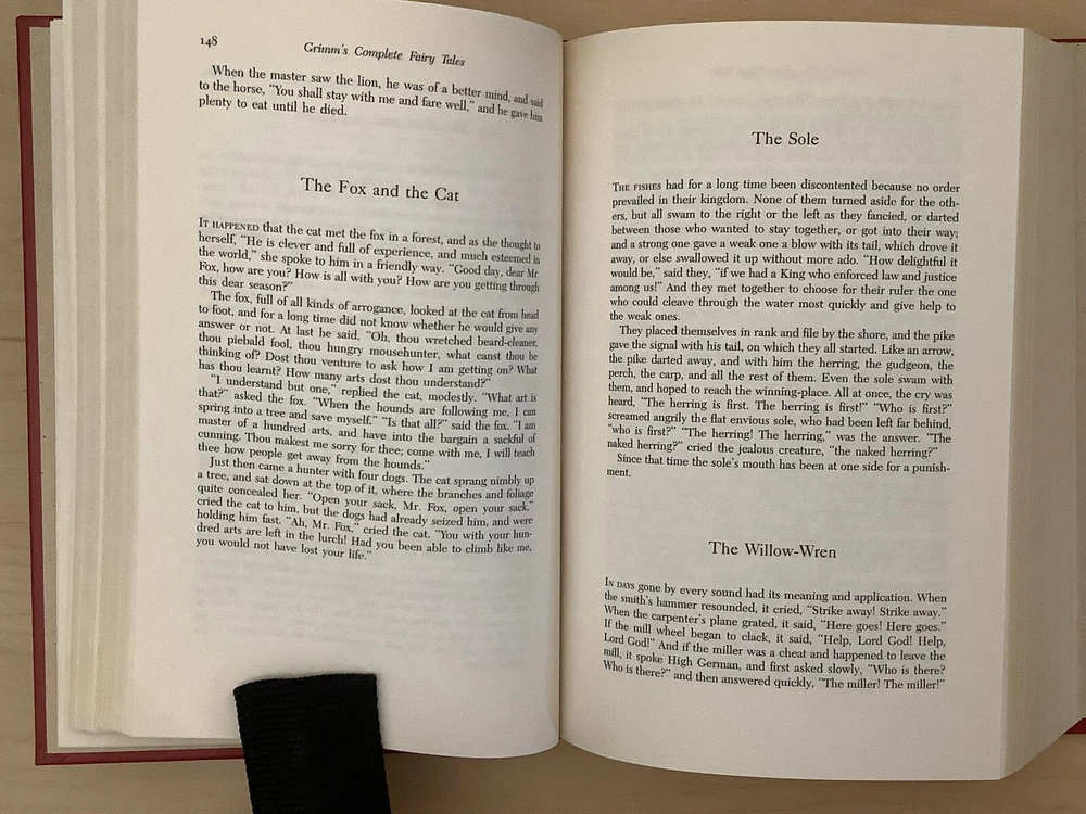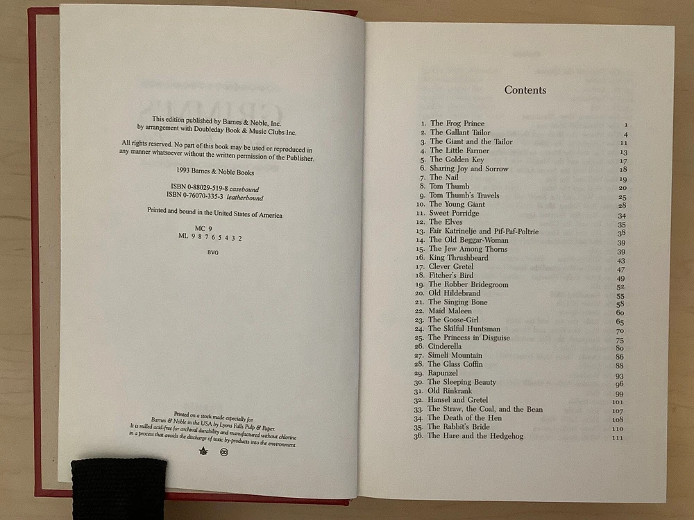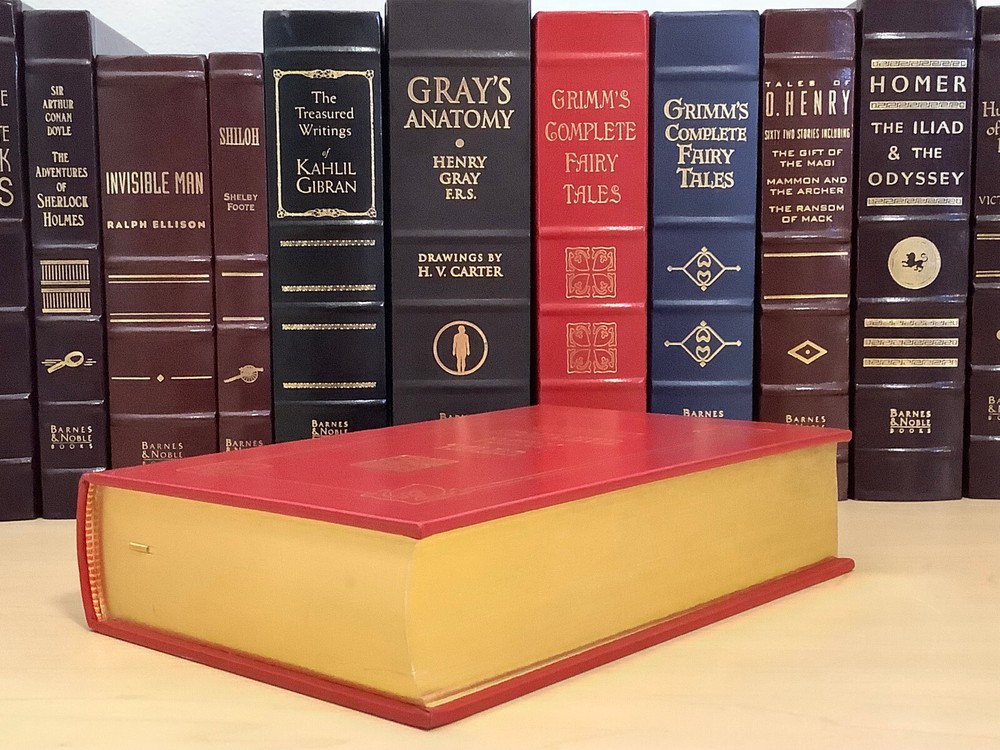 Grimm’s Complete Fairy Tales bound in leather, with gilt edged pages and a ribbon marker A collection of 211 tales Item Condition: This is a leatherbound hardcover in Very Good condition. There are no names, bookplates or stamps from previous owners inside. The binding is tight, and the pages are clean. The gilt page edging has some light wear including marks / dings. The leather is in nice condition, and the gilt accents are bright, there is some light rubbing to the corners and spine. Dimensions are approx: 9.25" x 6.25" x 2" This book will ship in a box with bubble wrap. Photos are of the actual book that will be shipped.