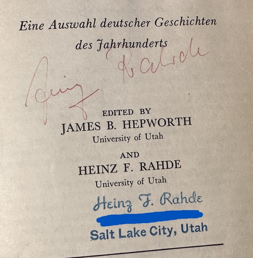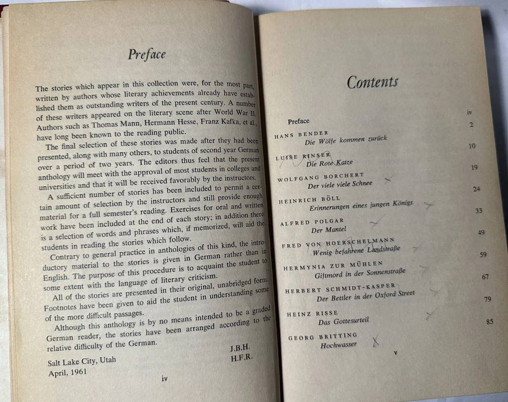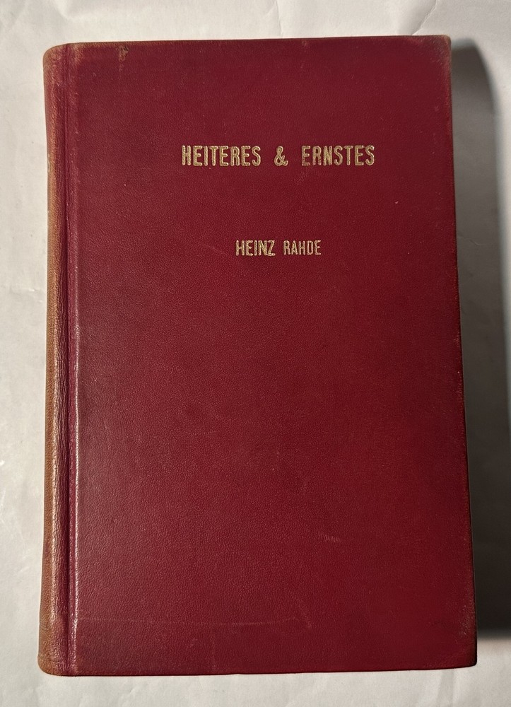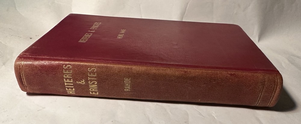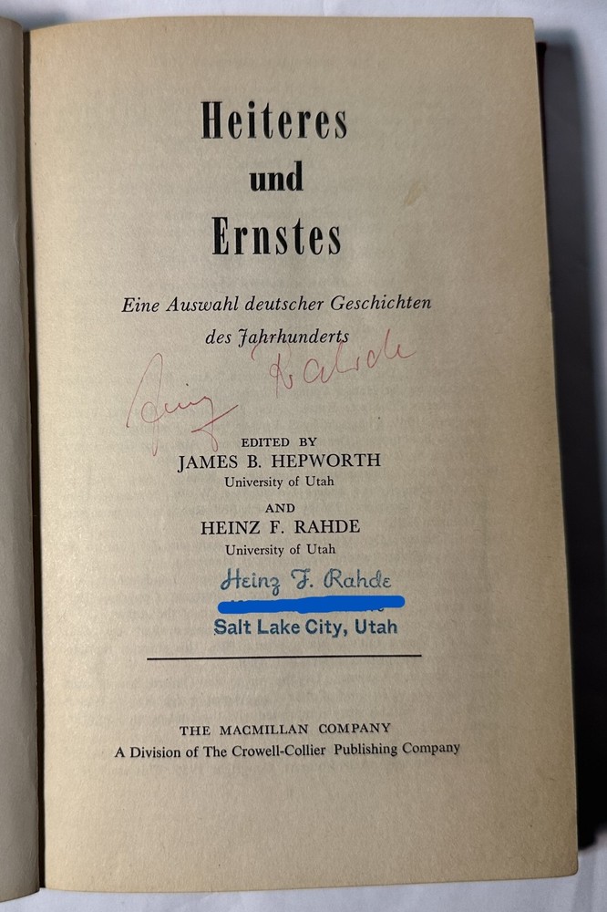 HEITERES & ERNSTESM Eine Auswahl deutscher Geschichten des Jahrhunderts..Cheerful and serious: a selection of German stories of the century...anthology for intermediate students presents short stories of the leading twentieth-century German authors..Edited by James B. Hepworth..by Heinz F. Rahde, both of the University of Utah...Handsigned copy of the author's own book..Published by Macmillan in 1962..First printing..Light rubs on leather exterior..more pronounced on spine..Gold embossed title..Binding good..complete with 330 pages..Lightest age yellowing..8.5 x 5.5"...