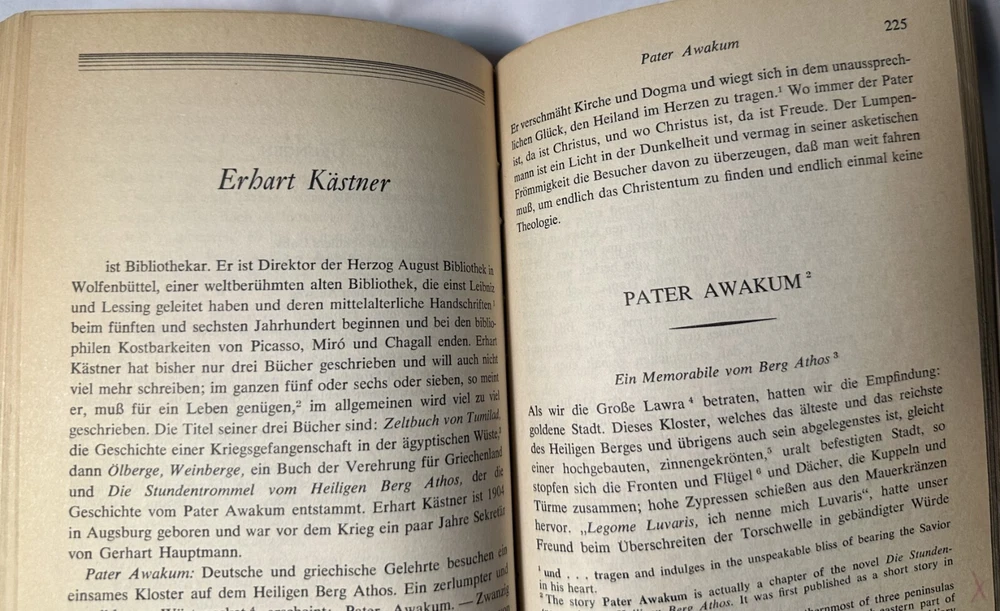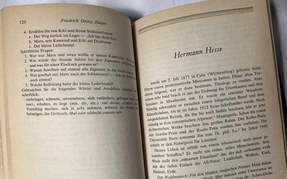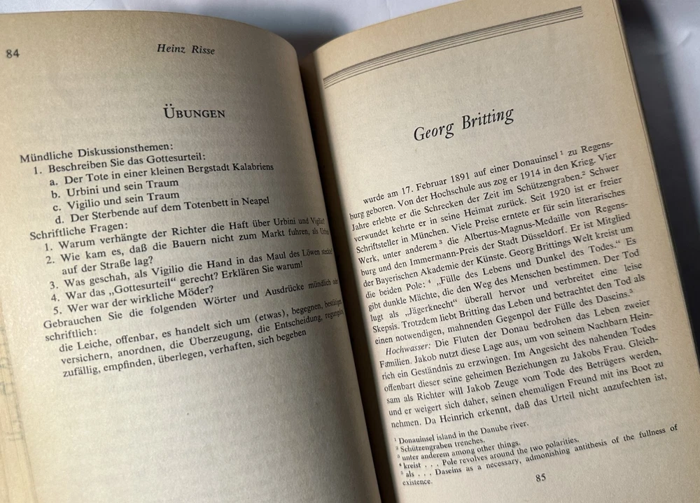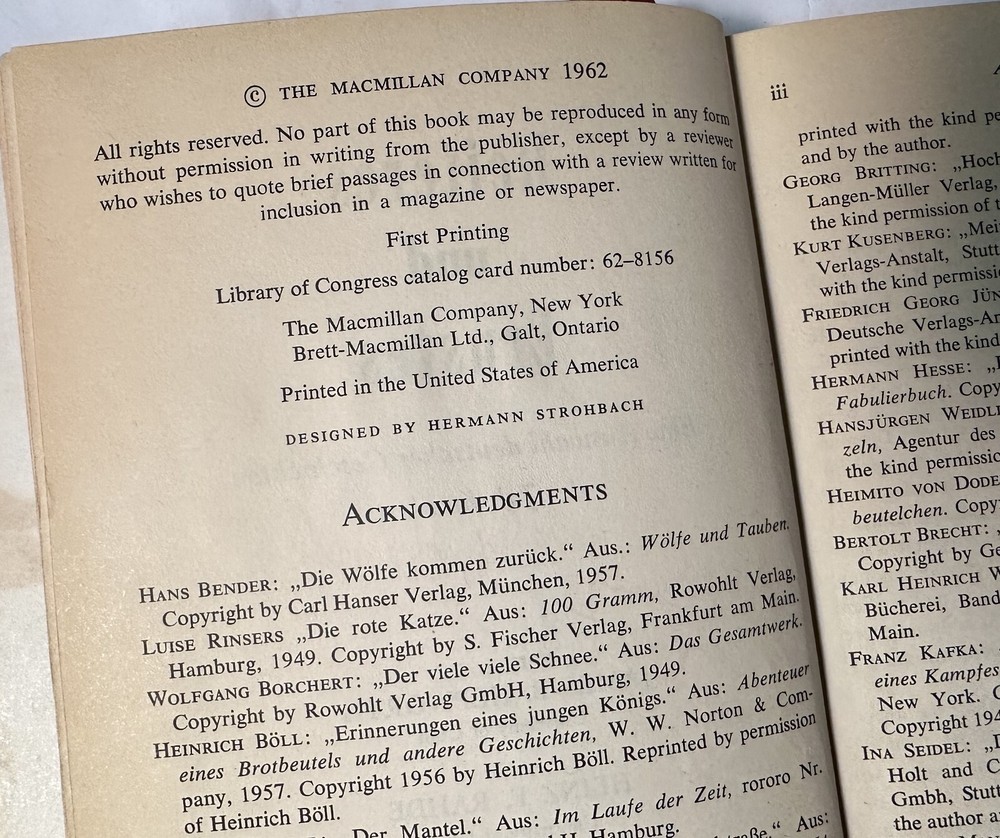 HEITERES & ERNSTESM Eine Auswahl deutscher Geschichten des Jahrhunderts..Cheerful and serious: a selection of German stories of the century...anthology for intermediate students presents short stories of the leading twentieth-century German authors..Edited by James B. Hepworth..by Heinz F. Rahde, both of the University of Utah...Handsigned copy of the author's own book..Published by Macmillan in 1962..First printing..Light rubs on leather exterior..more pronounced on spine..Gold embossed title..Binding good..complete with 330 pages..Lightest age yellowing..8.5 x 5.5"...