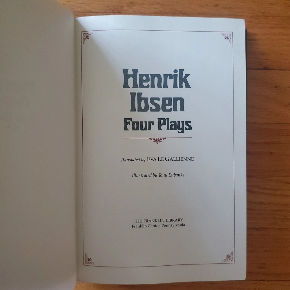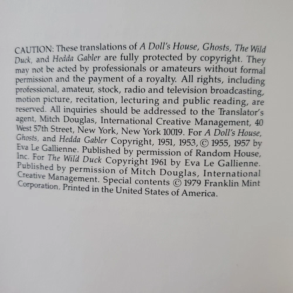 Up for sale is a hardcover copy with gold gilded edges of "Selected Four Plays", written by Henrik Ibsen and published by the Franklin Mint Library in 1979. As seen in the photos, the book is in very good overall condition. A great find for any literary buff. Shipping is $6.95 via US Postal Service Media Mail within the USA. Please take a look at my other listings of literary masterpieces published by the Franklin Library to add to your collection. Buy with confidence. 20+ year eBay member with 100% positive feedback. Please let me know if you have any questions.