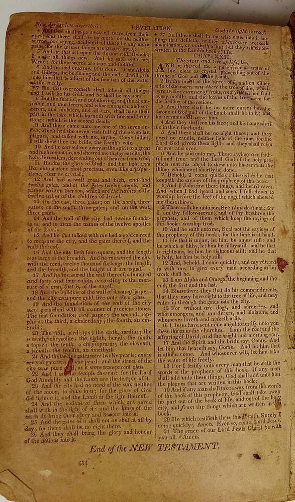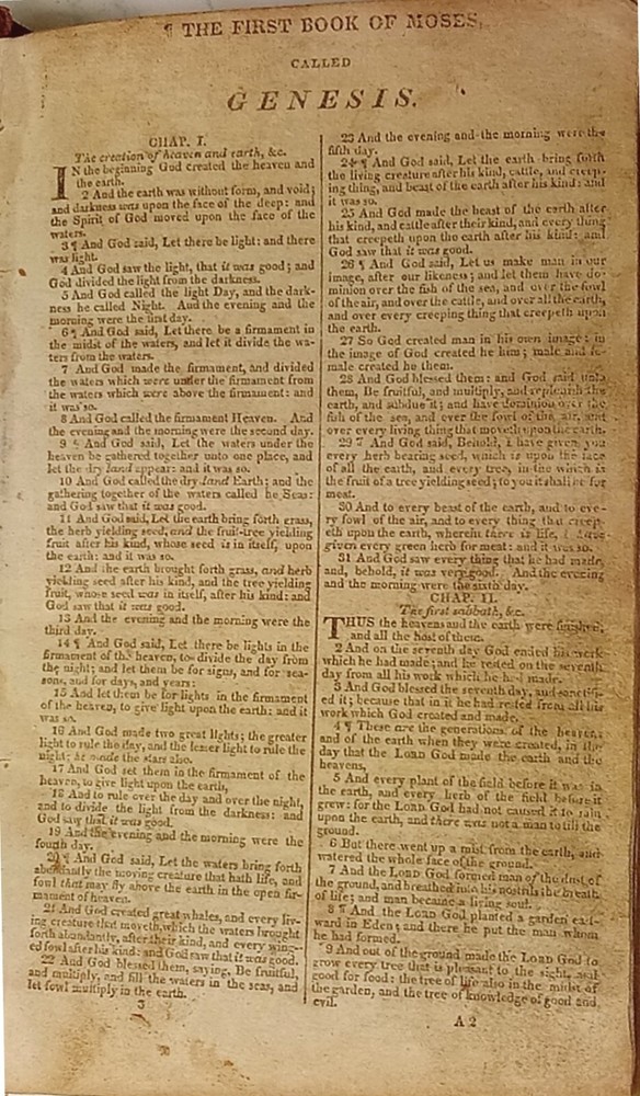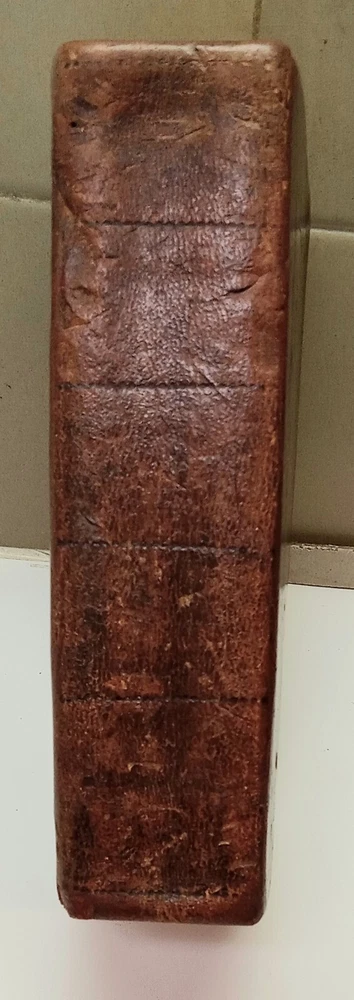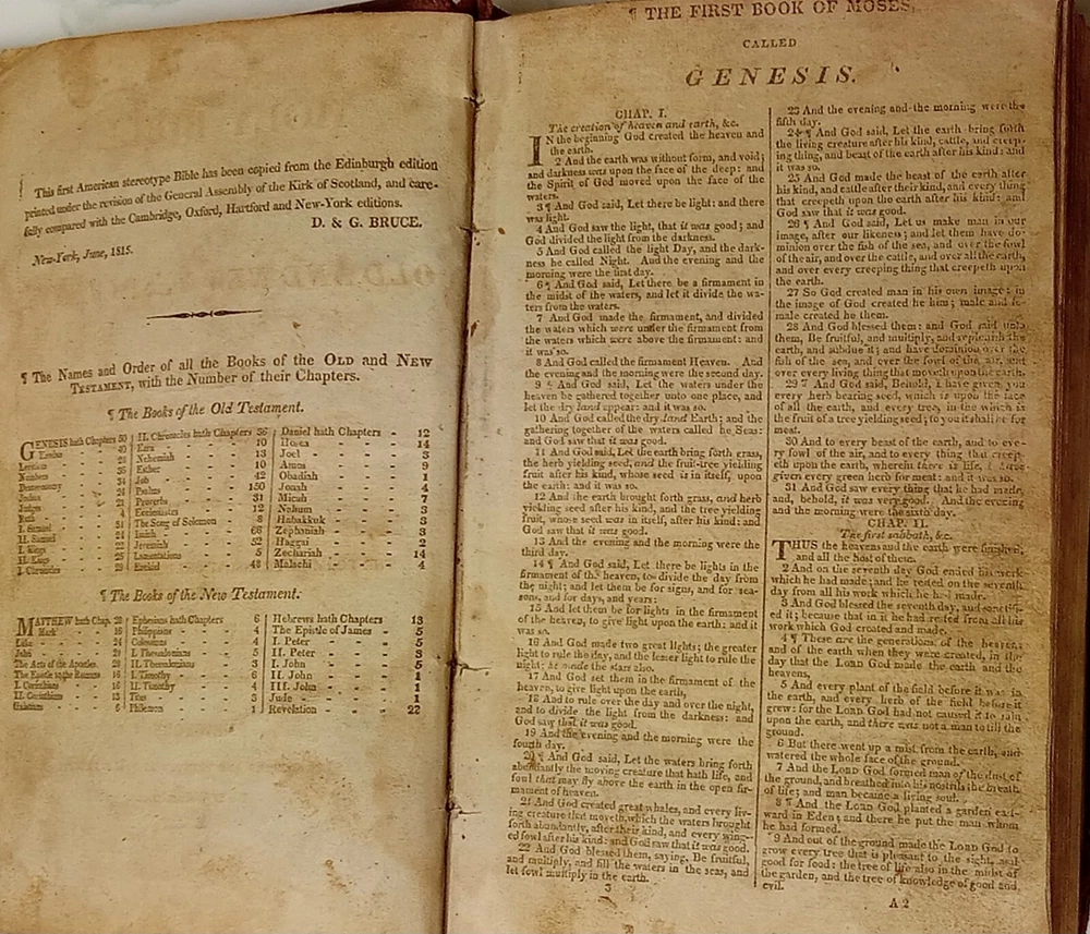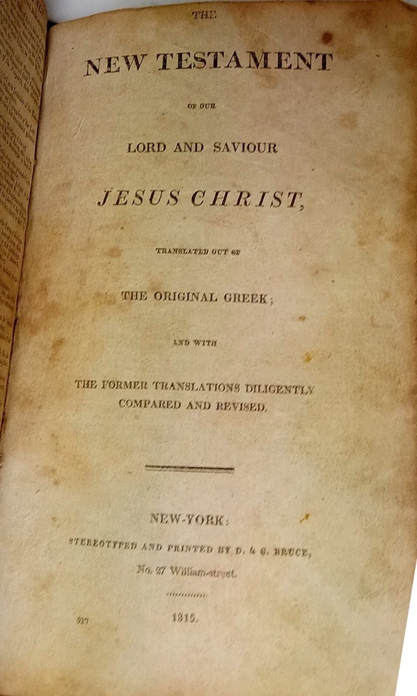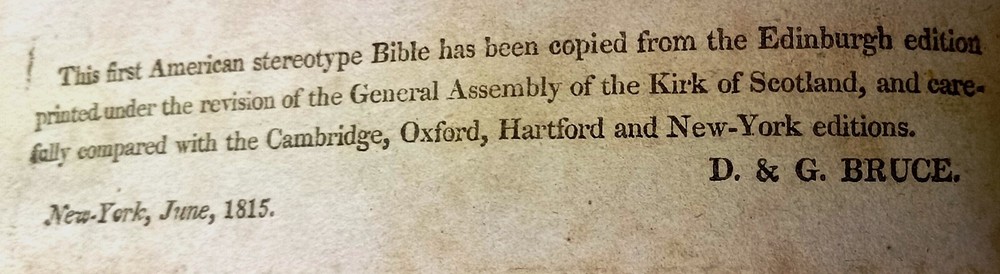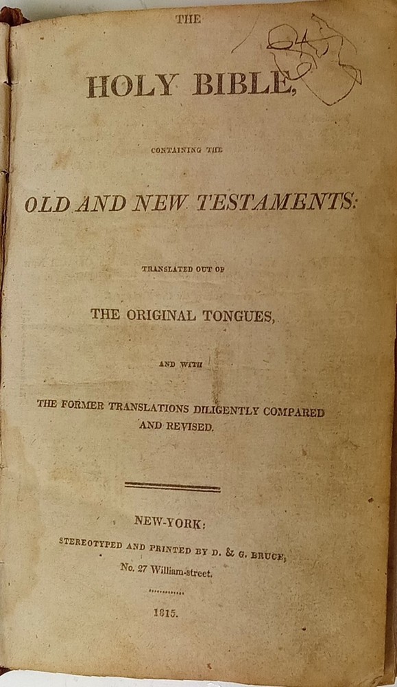 The / Holy Bible, / Containing the / Old and New Testaments: / Translated out of / The Original Tongues, / and with / The Former Translations Diligently Compared / and Revised. / New York: / Stereotyped and Printed by D. & G. Bruce, / No. 27 William-street. / 1815. This is the first Bible printed from stereotype plates cast in the United States. A more common previous stereotyped edition printed in 1812 had an American imprint, but was from stereotype plates cast in England. This edition was published by pioneering Scottish immigrant, David Bruce, who traveled to England to learn about the stereotype process and introduced several improvements. Original full blind-tooled leather with signs of wear but in overall good condition with covers holding firmly. Duodecimo (7" x 4") volume with hinges, head and tail caps intact. Textblock even with no pulled sections. Two preliminary blanks with inked inscriptions. No rear endpaper. Interior considerably browned with age. Title page and verso of NT title have ink scribbles. One leaf (Z2; pp.531-2) torn with loss of lower fourth; final NT Tables page lacking. All other leaves intact. Herbert 1614; Hills 279; O’Callaghan p. 125, No. 8. A rare historic find.