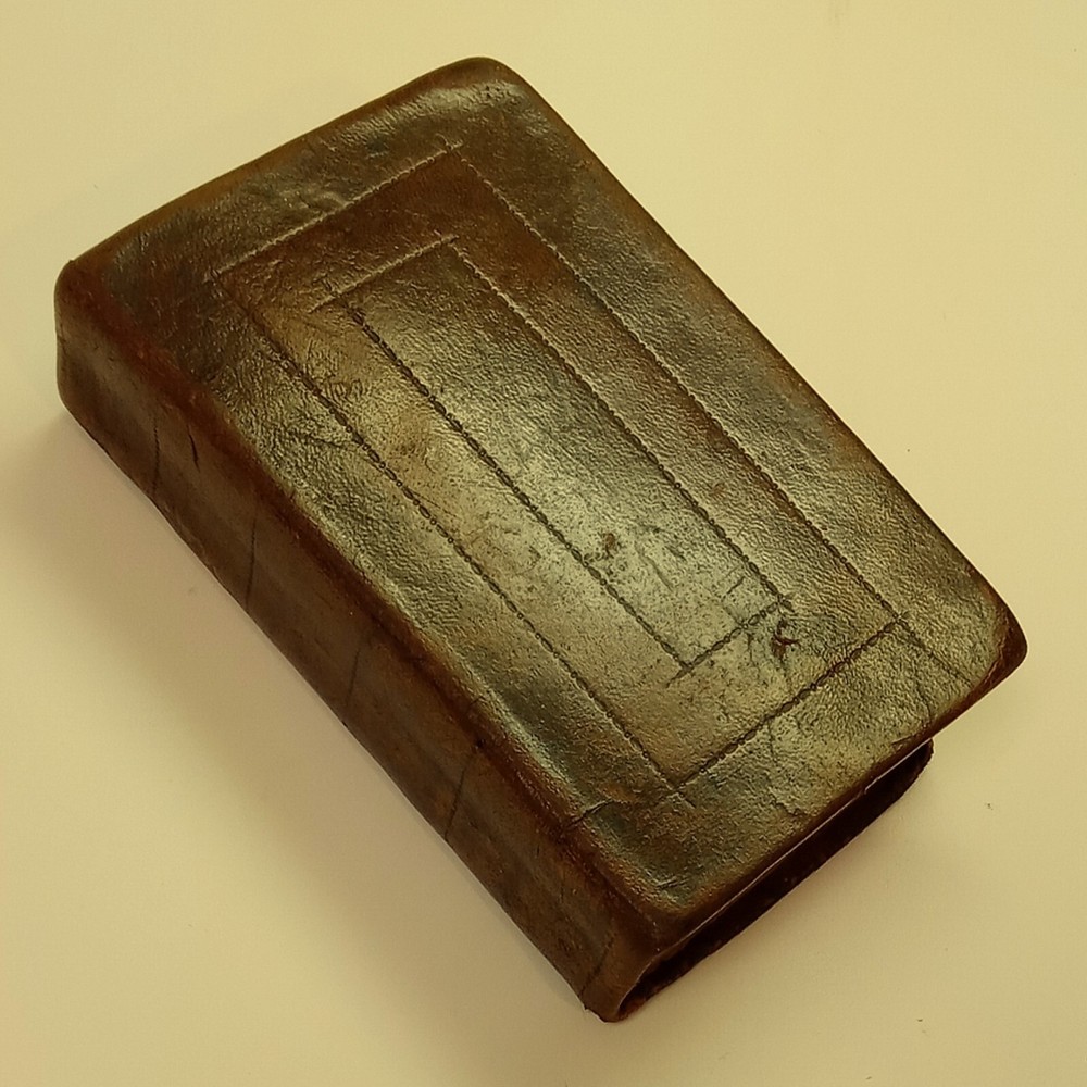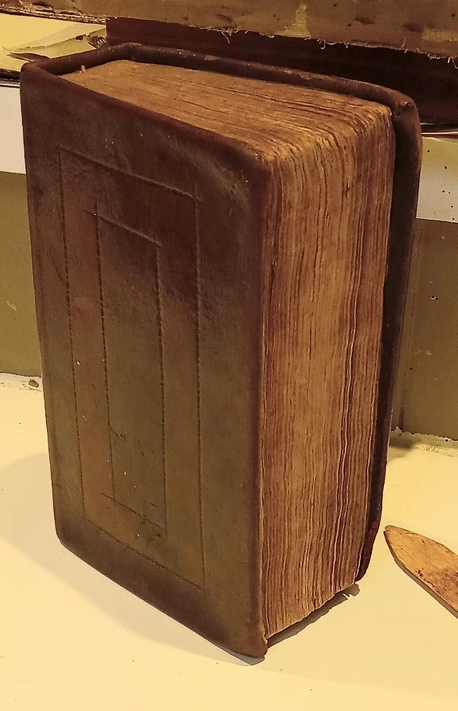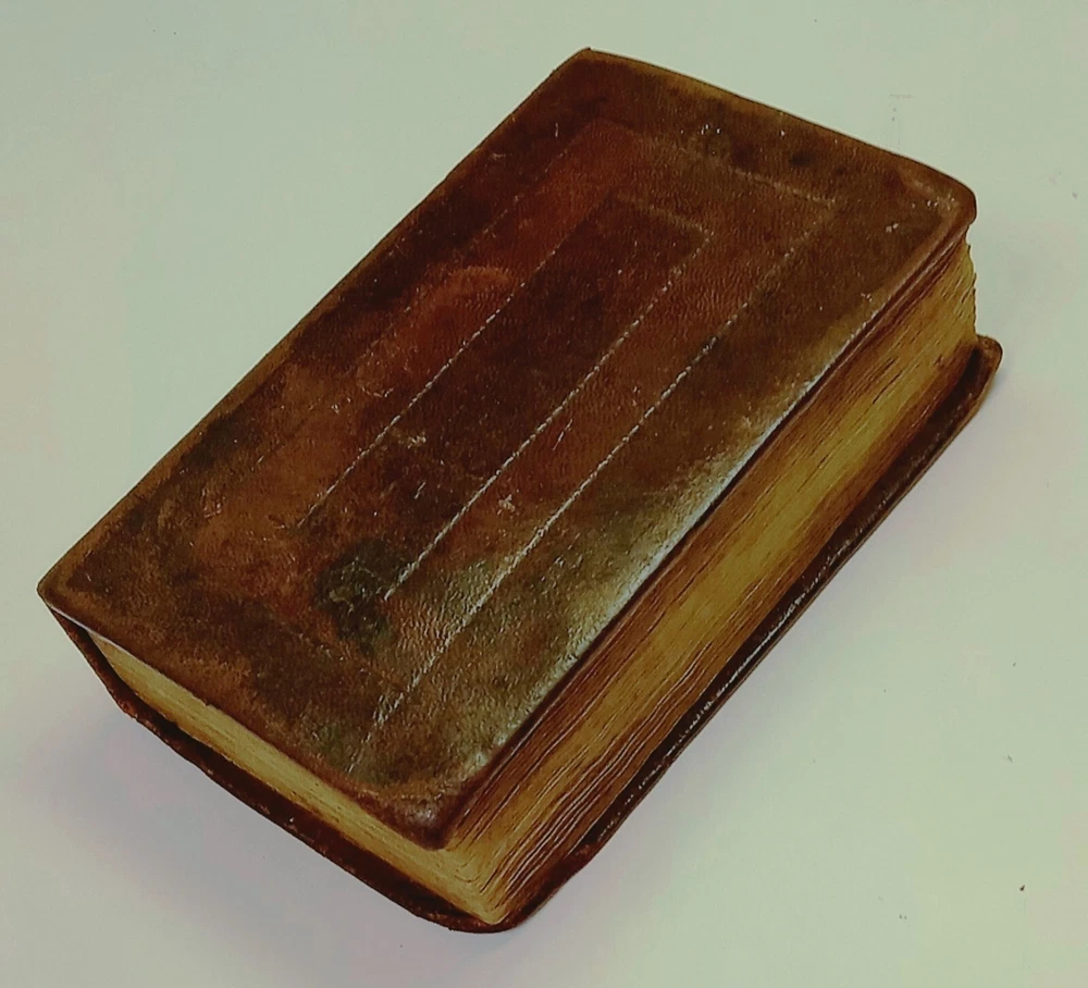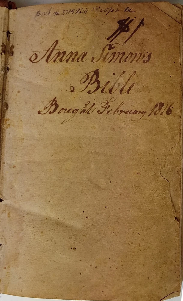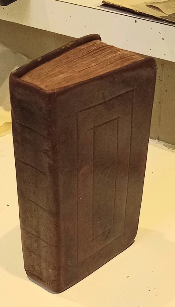 The / Holy Bible, / Containing the / Old and New Testaments: / Translated out of / The Original Tongues, / and with / The Former Translations Diligently Compared / and Revised. / New York: / Stereotyped and Printed by D. & G. Bruce, / No. 27 William-street. / 1815. This is the first Bible printed from stereotype plates cast in the United States. A more common previous stereotyped edition printed in 1812 had an American imprint, but was from stereotype plates cast in England. This edition was published by pioneering Scottish immigrant, David Bruce, who traveled to England to learn about the stereotype process and introduced several improvements. Original full blind-tooled leather with signs of wear but in overall good condition with covers holding firmly. Duodecimo (7" x 4") volume with hinges, head and tail caps intact. Textblock even with no pulled sections. Two preliminary blanks with inked inscriptions. No rear endpaper. Interior considerably browned with age. Title page and verso of NT title have ink scribbles. One leaf (Z2; pp.531-2) torn with loss of lower fourth; final NT Tables page lacking. All other leaves intact. Herbert 1614; Hills 279; O’Callaghan p. 125, No. 8. A rare historic find.