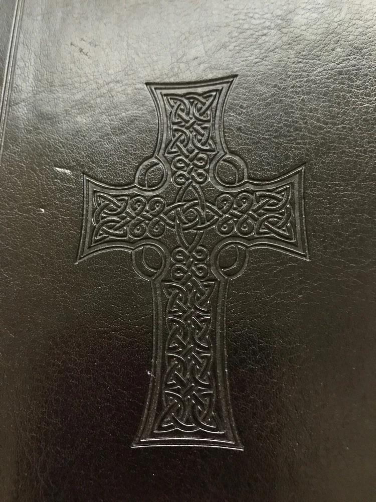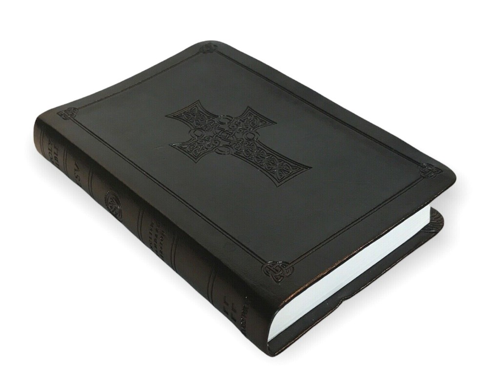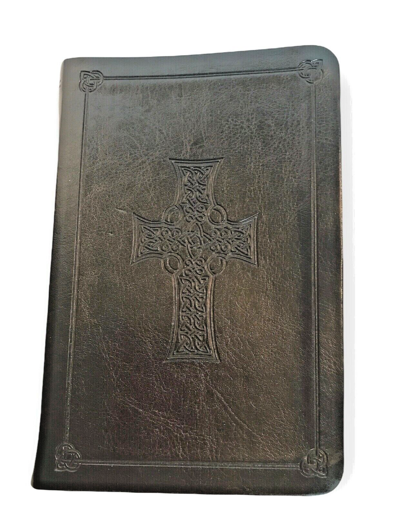 THE HOLY BIBLE Black Leather Cover / Back Soft Glove Leather Contains Old & New Testament Celtic Cross Embossed on Front Cover Gift-Giving Condition Perfect Personal Size Bible to Keep With You at all...