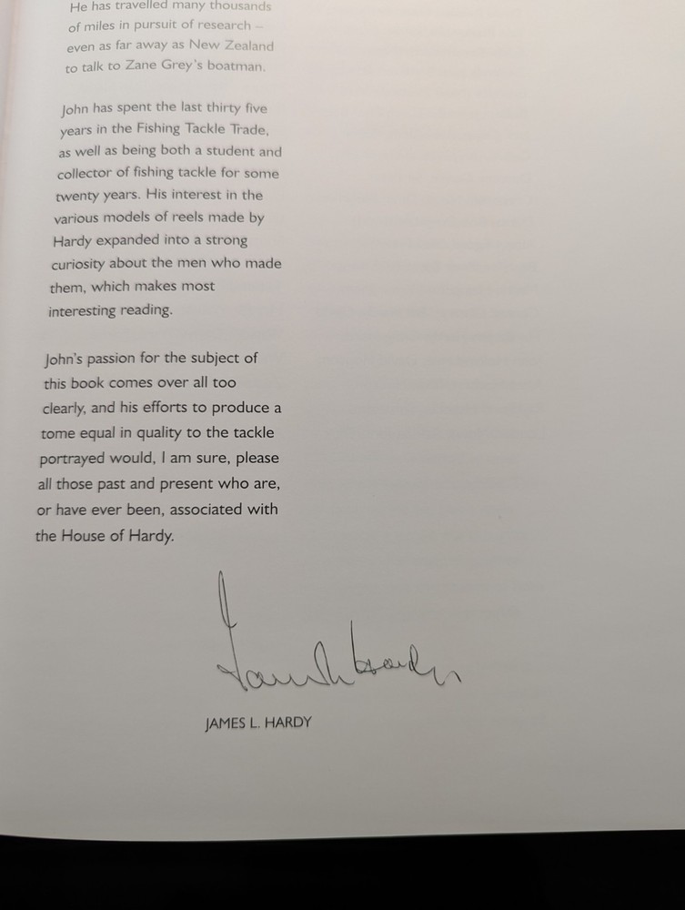 " Hardy Brothers The Masters the Men and Their Reels 1873-1939" book is a hardcover with a dust jacket written by John Drewett and published by J & J Publishing in 1998. The book charts in chronological order the reels Hardy offered for sale from 1873 to1939. It has 800 pictures of Hardy Reels making this the most comprehesnsive and accurate collectors book and is signed by James Hardy. The book is in mint condition and still in the orginal book.