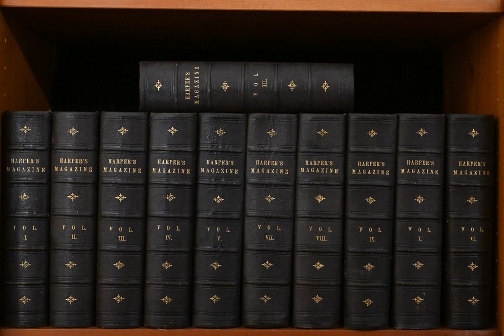 The first 12 volumes of Harper's New Monthly Magazine (missing volume VI) bound in 3/4 leather, with marbled boards and gilt spine lettering. Vol. 1 is dated 1850; vol. 12 goes through May 1856. Significant literary contributions to these volumes includes the serialization of works by Dickens, such as "Little Dorritt" and "Bleak House," and the first appearance in print of what would become Herman Melville's epic "Moby Dick," here titled "The Town-Ho's Story" in Vol. III. This is the only portion of the story to be published prior to the book issue and the first portion to be published.