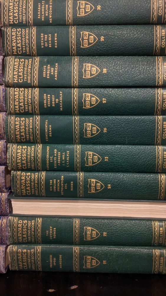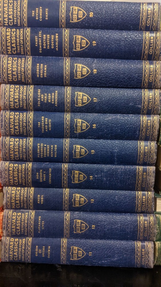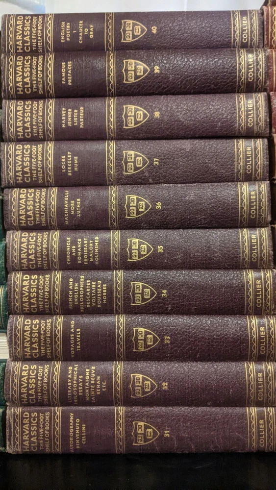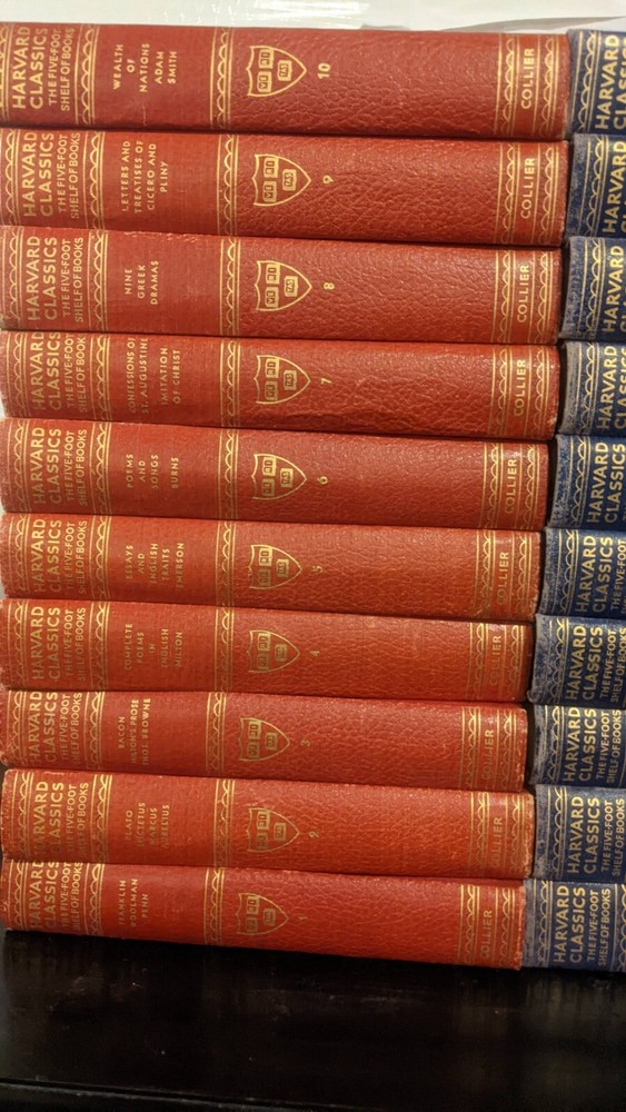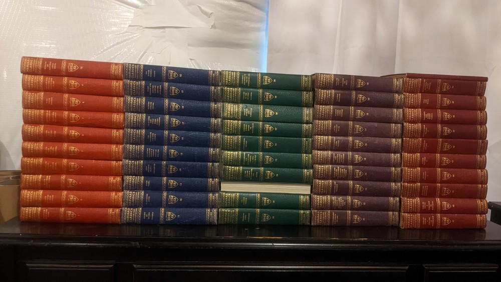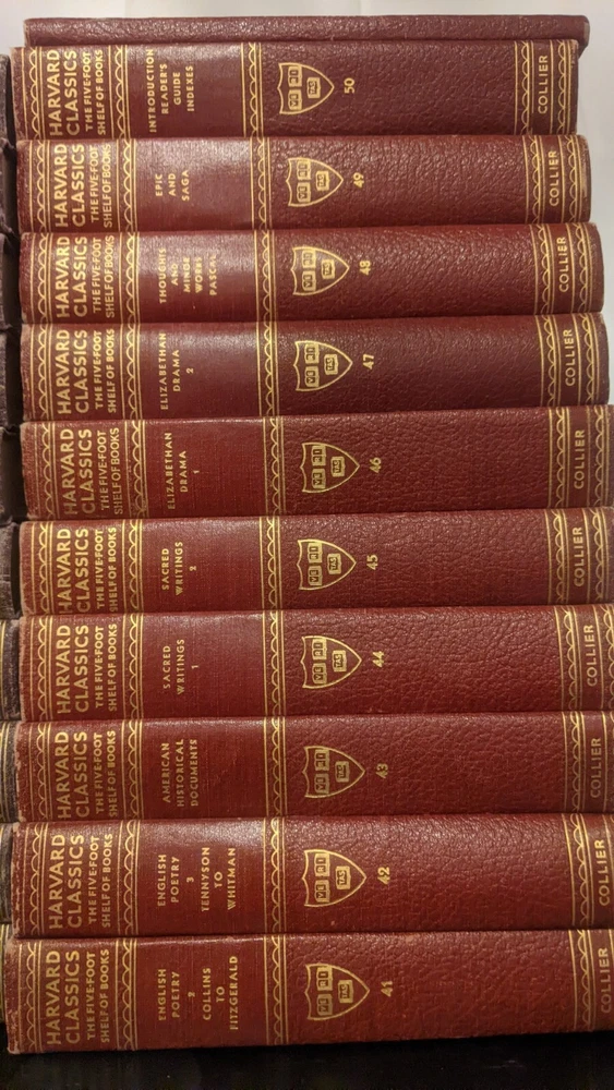 Dive into the literary treasure trove of the Harvard Classics Five Foot Shelf of Books set, an epic collection that condenses thousands of years of remarkable writing into a manageable, yet substantial, five-foot shelf. This particular set includes 49 volumes, beautifully leather-bound and illustrated, with one bonus book, offering an extensive journey through historical fiction that has shaped the narrative landscape of both education and entertainment.Published by P. F. Collier & Son in 1937, each book in this collector's edition boasts the craftsmanship of a bygone era. The titles encompass a variety of stories from multiple authors, all presented in the original English language. A must-have for antiquarian enthusiasts and collectors alike, this set is a testament to the enduring power of literature. Beautiful Rainbow colors Volumes 1-10 are Red; 11-20 are Blue; 21-30(missing book 23) are Green; 31-40 are Purple; 41-50, and the Reading Guide is Maroon. I moved, if volume 23 is found will send to you for free I tems shipped from a smoke free home. We only ship to confirmed addresses. We are not responsible for duties or taxes, no APO/FPO.