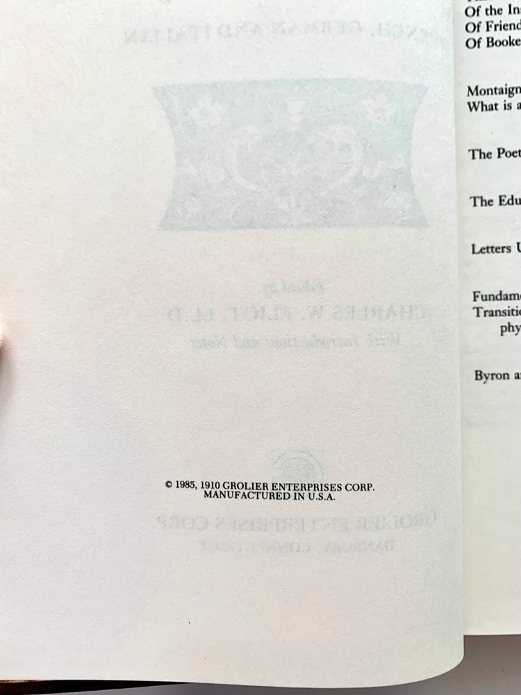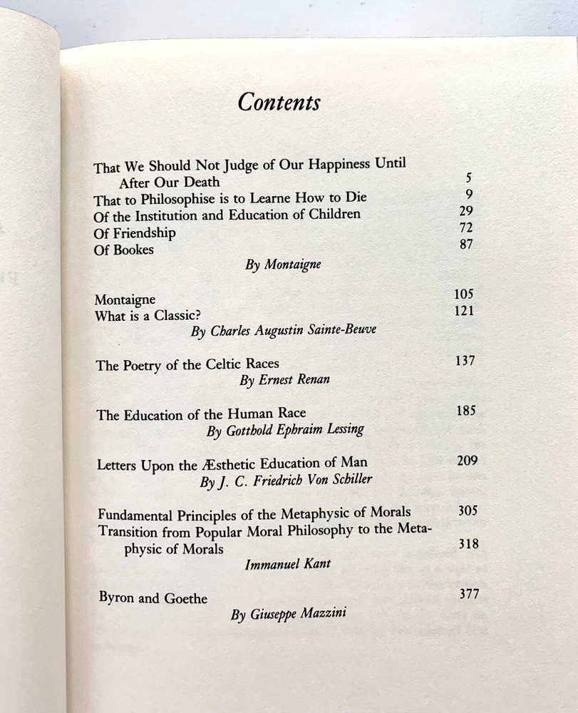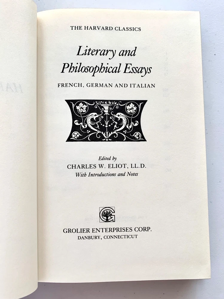 This deluxe edition of The Harvard Classics is bound in full leather with raised bands on the spine and 22kt gold gilt design on covers and spine. All edges gold. Marbleized end papers. Satin ribbon place holder. LITERARY AND PHILOSOPHICAL ESSAYS FROM THE FRENCH, GERMAN, AND ITALIAN make up Volume 32 of the famous 50-volume anthology, THE HARVARD CLASSICS, first published in 1909 under the supervision of Harvard president Charles W. Eliot. The set consists of classic works of world literature, important essays and speeches, and historical documents. It was designed as a program of self education. Eliot argued that 15 minutes a day spent reading these classic works could give anyone the elements of a liberal education. We are selling 36 volumes of this beautiful full leather edition, so look for our other listings. Discounts for multiple purchases.