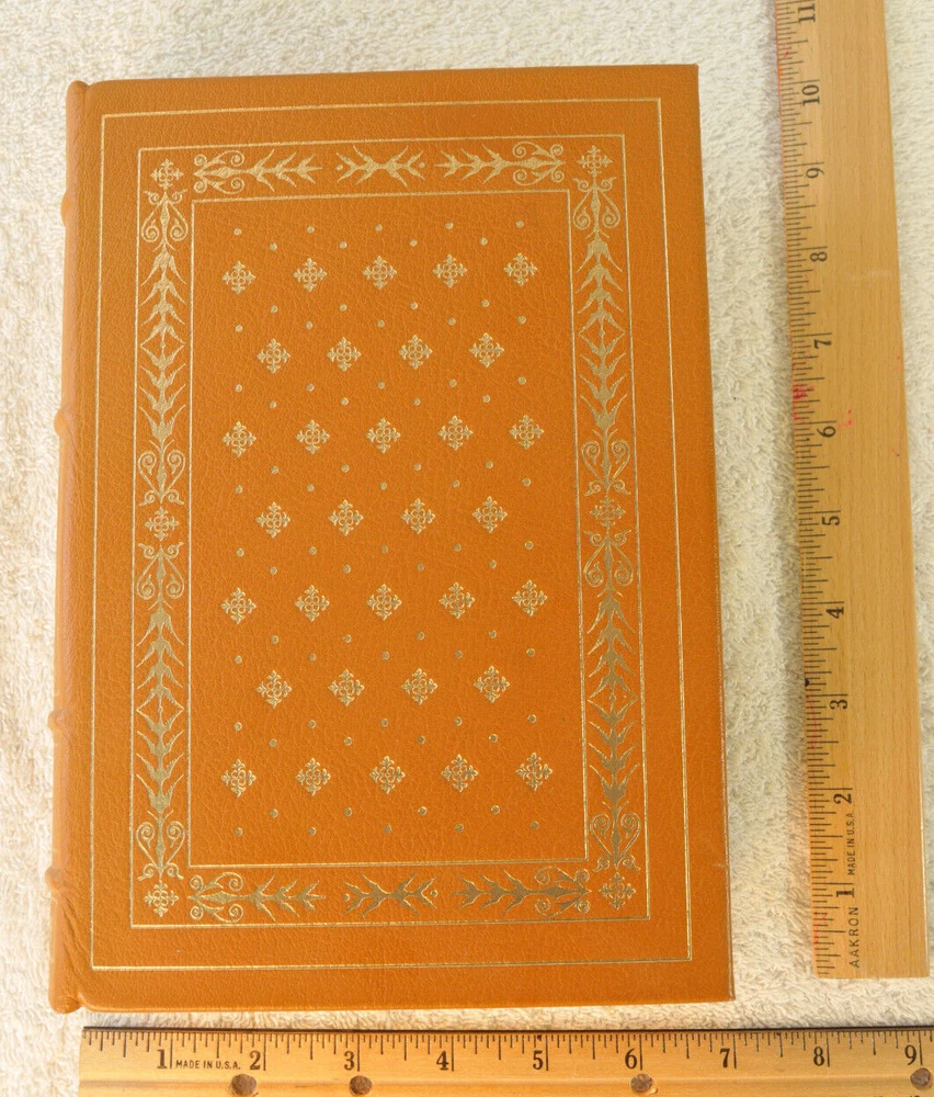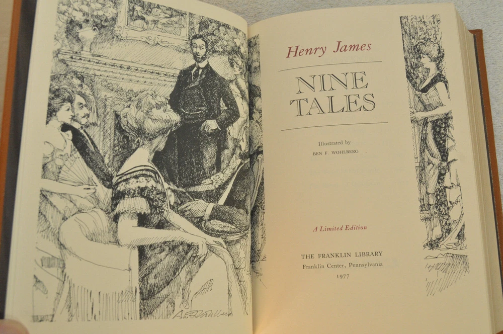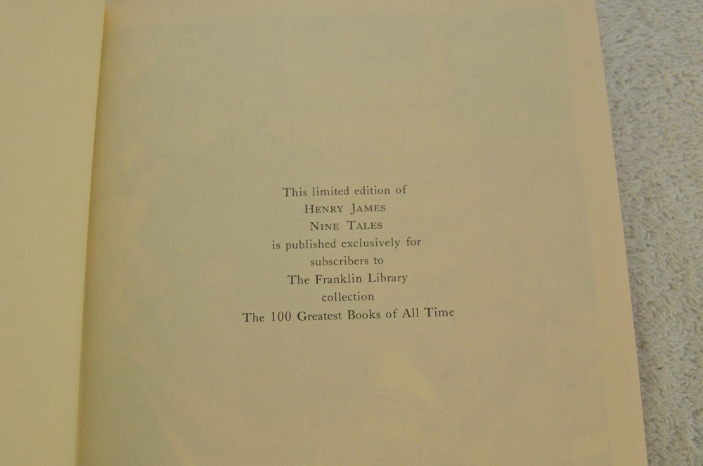 Henry James NineTales Leather Bound Limited Edition Franklin Library 1977 USA. This book contains Nine Tales by Henry James. It was printed in the USA. It was published exclusively for subscribers to the Franklin Library Collection: The 100 Greatest Books of All Time. 678 pages. It is a gorgeous looking leather bound limited edition which would make an attractive edition to any home library. The book features 22 kt fold lettering and embellishments of the spine and covers; moir endpapers; raised spine bands; sewn binding; acid fee paper and gilt page edges. Franklin Library was the publishing arm of Franklin Mint. These handsome Limited Edition books are no longer being produced by the Franklin library. Very good Like New unread pre-owned condition. No handwriting nor marks in this clean copy. Please see all photos for details and condition.