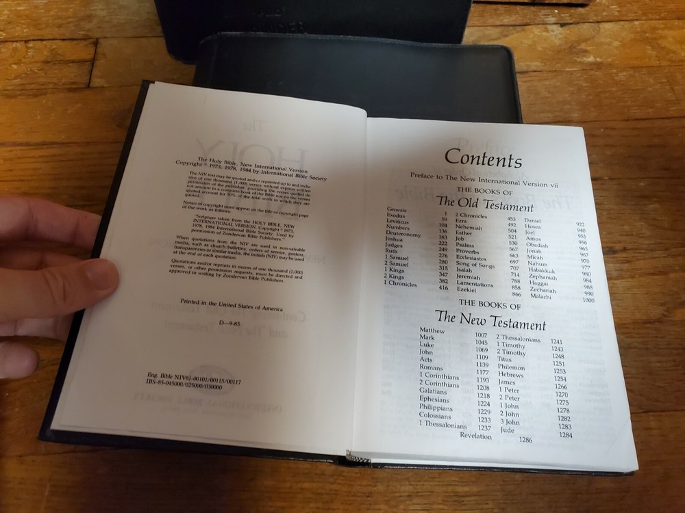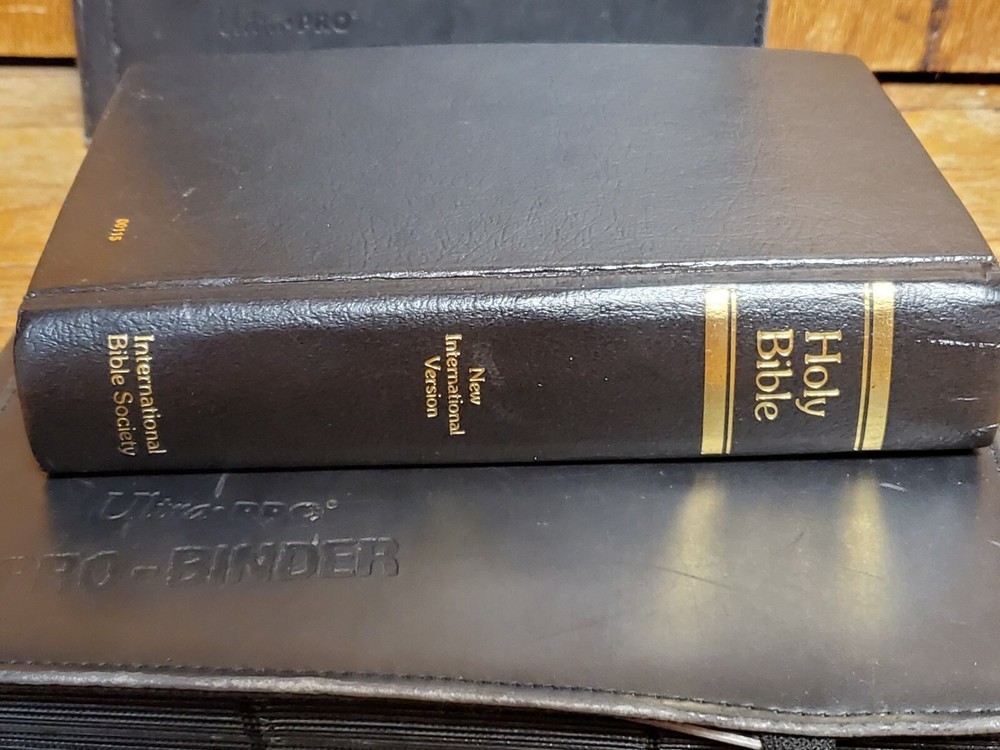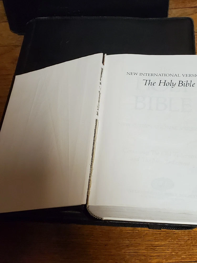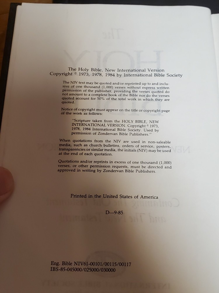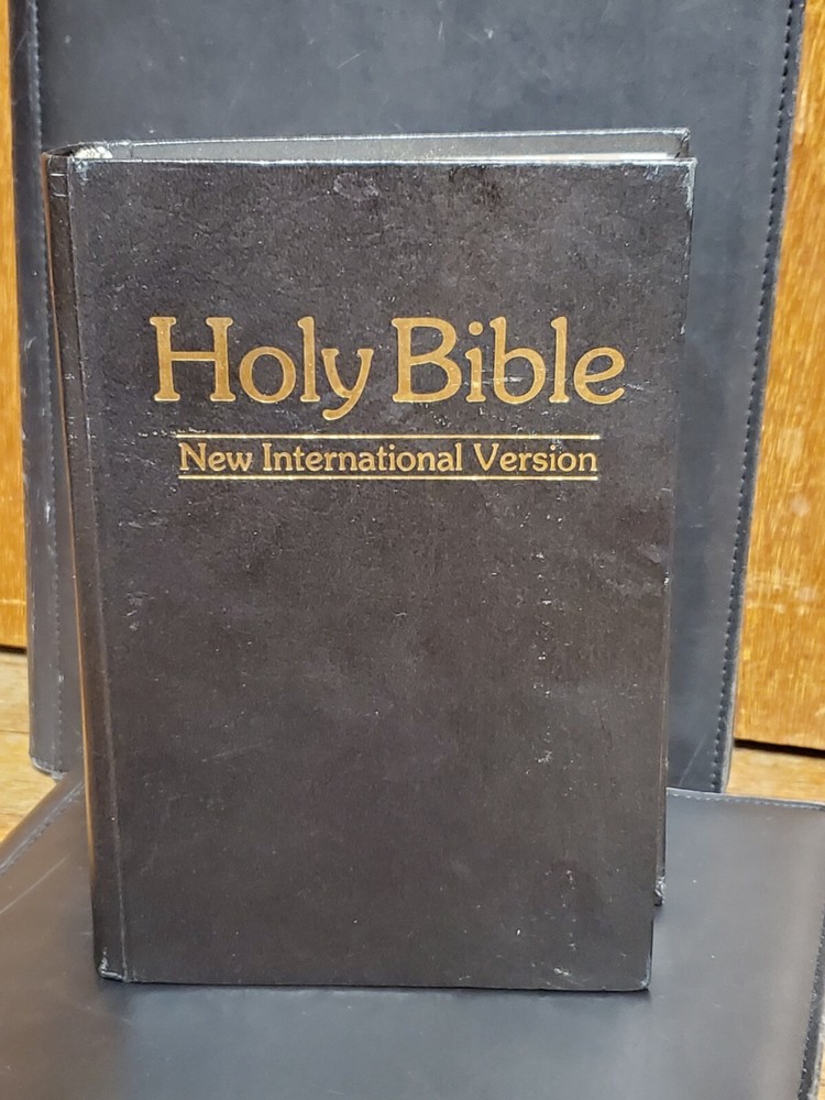 This listing is for a Holy Bible New international version made by the international bible society in 1984. It is pre owned in good read condition. Imperfections seen in pictures. Mainly on the inner spine & cover. A few pages with Imperfections or writing. Beautiful vintage Bible with a black leather hardback cover. What you see is what you get. Priced to sell. Buy it before someone else does!!!