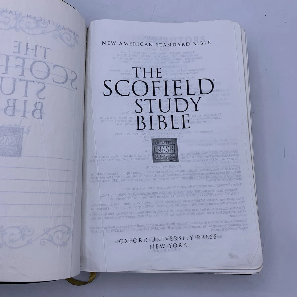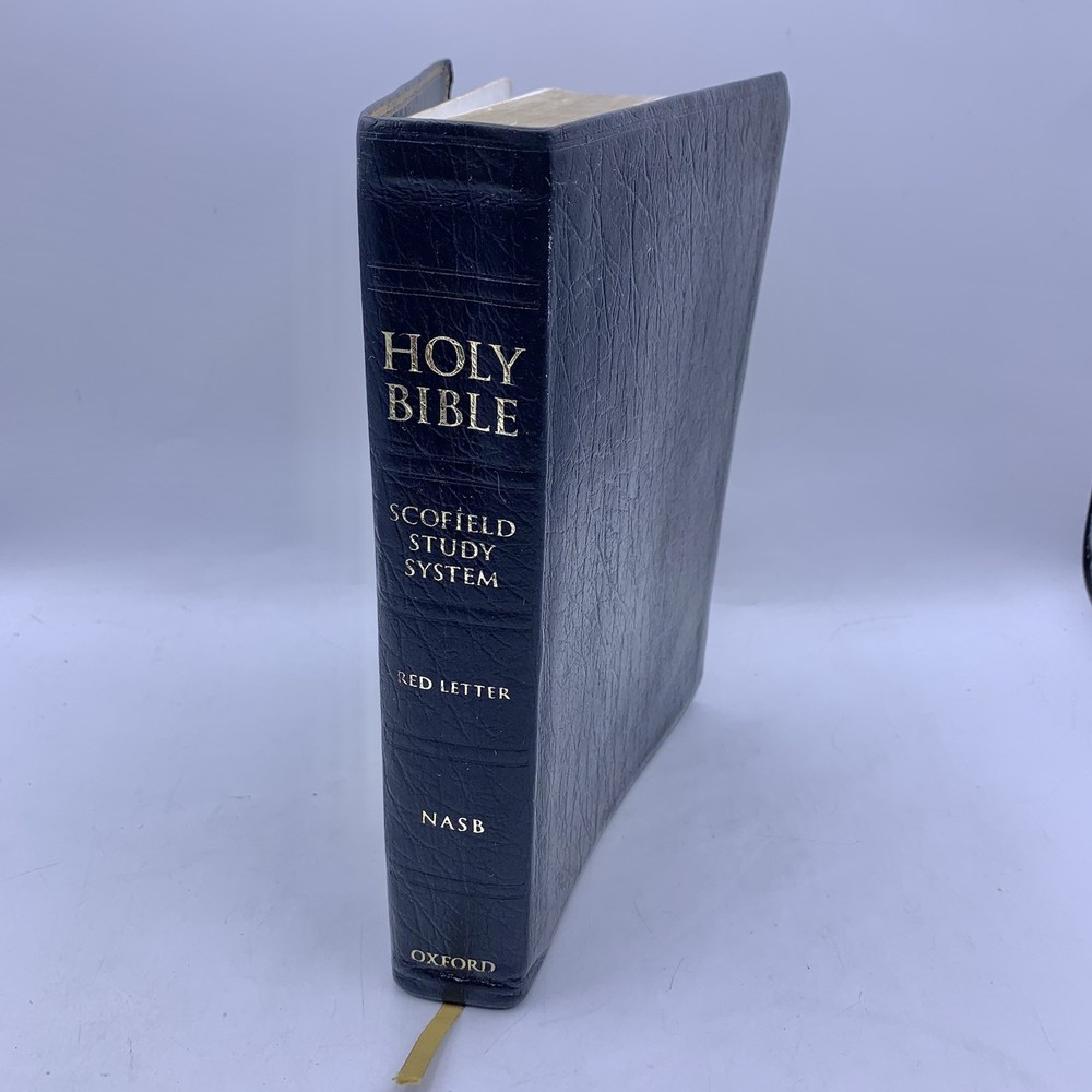 Holy Bible Scofield Study System NASB 5514RRL RARE Leather NASB Red Letter 2005. Has wear, some pages are wrinkled, at back the leather cover has become separated from the binding - Please see pictures for details.
