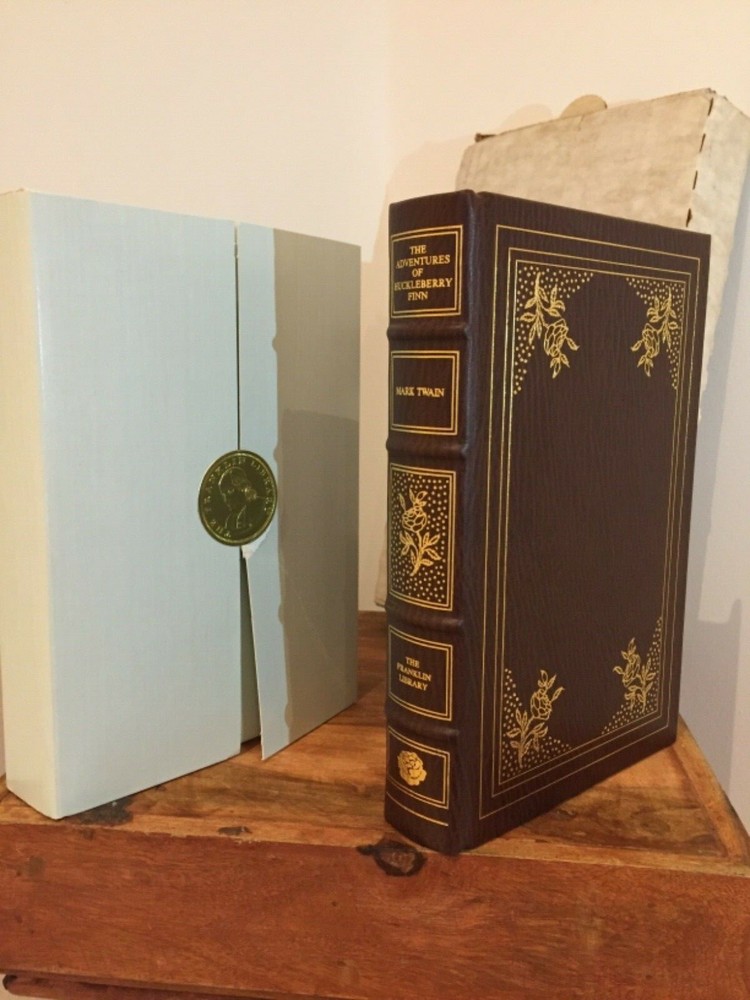 This is full genuine leather bound in new and sealed condition, never opened or read. The first photo includes my own copy shown here for exemplification only. For the ultimate historical immersive experience I shall be using the original shipping box, just as you would have received it from the Franklin Library itself. This is a treat of the rarest kind! This book is the perfect find, perhaps the last one to be found in original wrapping. It laid in waiting for nearly 40 years to find its unique loving owner. Note (condition check): addressing concerns from some buyers, I can confirm the book's condition by opening the box, upon commitment to buying it, should the book reveals itself to be as pristine as I expect it to be. 'Huckleberry Finn' by Mark Twain is one of Franklin Library's ‘ Collector's Library of The World's Best-Loved Book ’, with wonderful attributes: •Fully and tightly bound in genuine leather. •22kt gold accents deeply inlaid on the "hubbed" spine and covers. •Heavy duty binding boards enhance the book’s durability. •Superbly printed on acid-neutral paper that lasts for generations. •Sewn pages – not just glued like ordinary books. •Handsome moiré end pages and a satin-ribbon page marker. •Gold gilded page ends. •Rigorous inspection at every stage ensured adherence to exacting standards and the highest quality. •Superb craftsmanship and commitment to quality. The appeal for collecting Franklin Library comes from having these attributes taken way further into the exquisite quality, durability and craftmanship, than Easton Press and Folio Society managed with their productions. This book is the perfect companion out on a park bench with a hot cup of coffee or snuggled up in front of the fireplace. Despite its all-inclusive nature it still feels very light and compact at a size of 4 x 16 x 22cm. Wonderful to hold and excellent reading experience.
