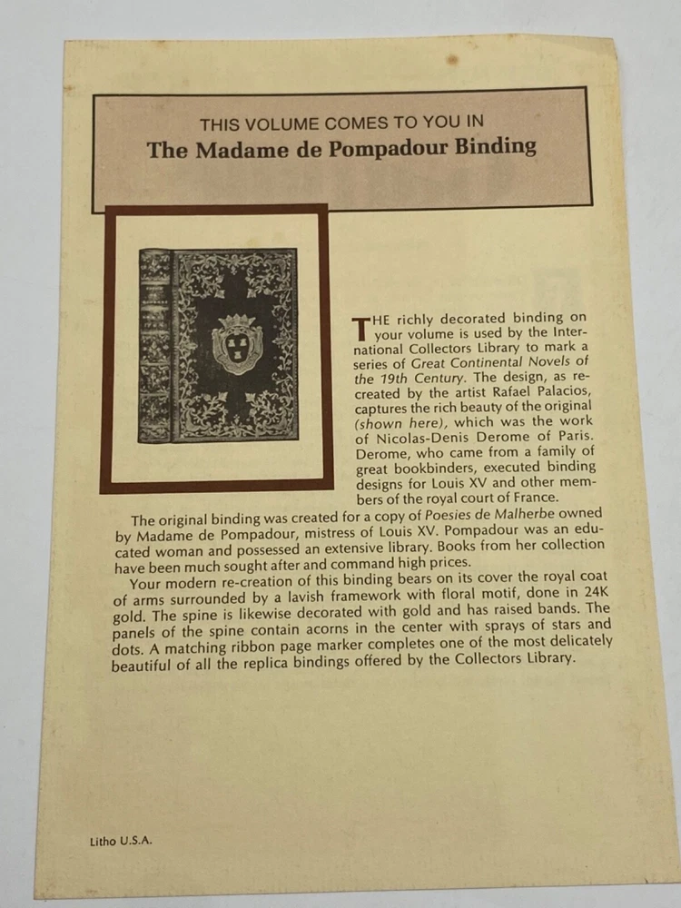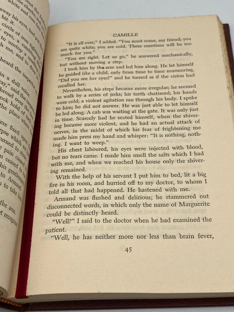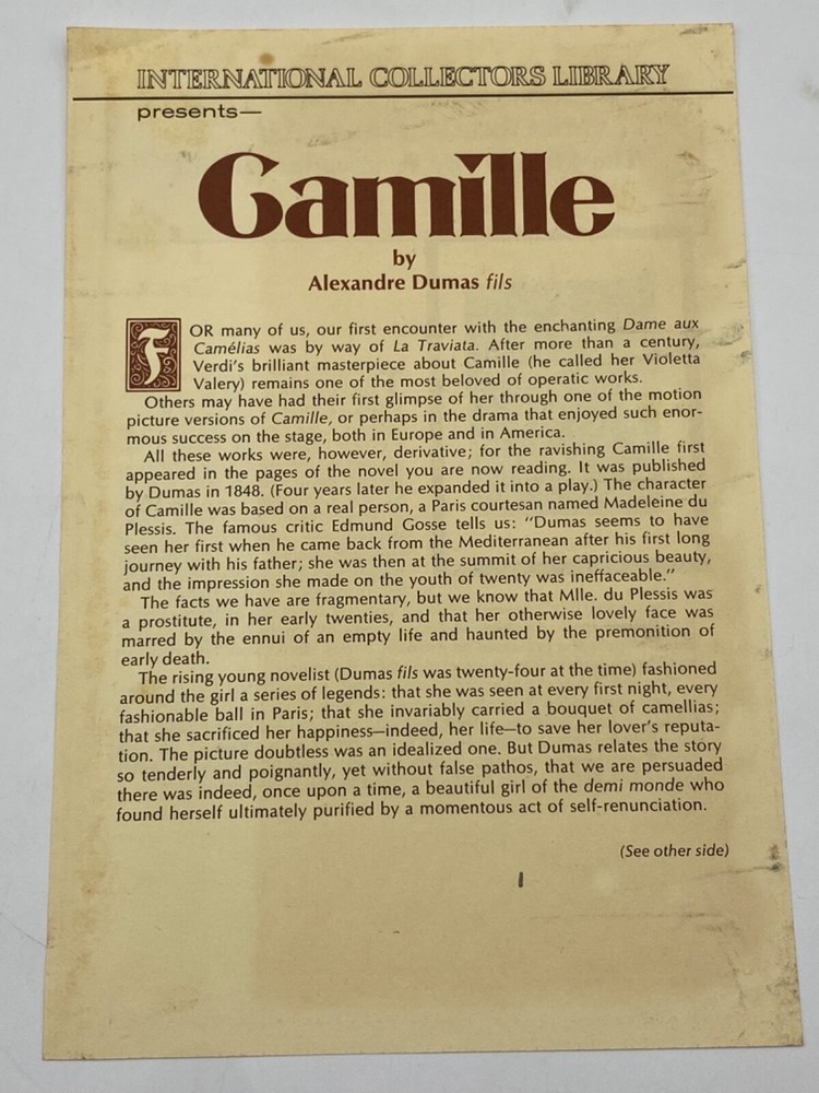 MAKES THE PERFECT GIFT FOR ANY FAN OF THE CLASSICS / VINTAGE ROMANCE BOOKS / ALEXANDRE DUMAS ** PLEASE READ : Mahalo for taking the time to look at our listing. We truly appreciate it. We always do our BEST to give you the most accurate description of these beautiful books. If, however, you have any SPECIFIC questions about the SIZE of the book, NUMBER of pages, TYPE of leather, SMELL or FEEL of the book, PLEASE email us through EBay’s mail system BEFORE you bid, and we will be HAPPY to give you more information. We want you to be completely happy with your purchase and keep you as our customers for years to come!** DESCRIPTION: INTERNATIONAL COLLECTORS LIBRARY’s fine leatherette binding, LONG OUT OF PRINT edition of CAMILLE by ALEXANDRE DUMAS. THIS IS A VINTAGE HEIRLOOM ICL EDITION WITH LAVISH GILT IMPRESSIONS TO THE BOARDS AND SPINE, DONE IN REAL 24K GOLD . IT IS ONE OF THE MOST HIGHLY-PRIZED & MOST BEAUTIFUL EDITIONS OF THIS GREAT TWAIN CLASSIC YOU CAN FIND. COVETED COLLECTOR’S NOTES ARE INCLUDED . 🍍 NOT INCLUDED 😊 The International Collectors Library was a book club series published by Doubleday Book & Music Clubs, Inc. from the late 1940’s through the late 1980’s. Generally, the books followed the 8-1/2″ x 5-3/4″ book size format. The binding designs were adapted based on old “Golden Age of Bookmaking” bindings, and made to look like leather-bound copies (leatherette). The bindings were embossed with 24K gold embellishments, and some copies had gilt edges (thin layer of gold leaf) applied. A sewn in satin ribbon marker was also added in most books. There were over 400 editions published in a variety of bindings. Some editions came with loose-leaf inserts that described the book club, the bindings and design styles, and a story synopsis of the book-in-hand. ABOUT THE BOOK: In Camille , Marguerite Gautier is the most beautiful, brazen—and expensive—courtesan in all of Paris. Despite being ill with consumption, she lives a glittering, moneyed life of nonstop parties and aristocratic balls and savors every day as if it were her last. Into her life comes Armand Duval. Young, handsome, and recklessly headstrong, he is hopelessly in love with Marguerite, but not nearly rich enough. Yet Armand is Marguerite’s first true love, and against her better judgment, she throws away her upper-class lifestyle for him. But as intense as their love for each other is, it challenges a reality that cannot be denied.… CONDITION: Book is in AMAZING condition for its age with the normal shelfwear to the tips of the boards and age spots to the page ends and a few of the pages in the book, something very common in these very old editions (SEE PICS FOR BETTER DETAILS). NO ATTACHED BOOKPLATES, WRITING FROM PREVIOUS OWNER, ETC. It is a BEAUTIFUL edition. THIS MAKES A GREAT VINTAGE READING COPY! SHIPPING: FREE TO US ADDRESSES ONLY. INTERNATIONAL $ based on location. WE SHIP PRIORITY MAIL & PACK VERY WELL. Please check out our other listings of Easton Press, Franklin Library, Limited Editions Club, First Edition Library, Folio Society, Heritage Press, and International Collectors Library editions. WE DO COMBINE SHIPPING IF YOU PURCHASE MORE THAN ONE COPY. Mahalo for looking at our listings! By bidding/purchasing this item, you are helping a very grateful family who sends you our WARMEST ALOHA & MAHALO!