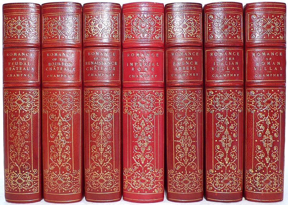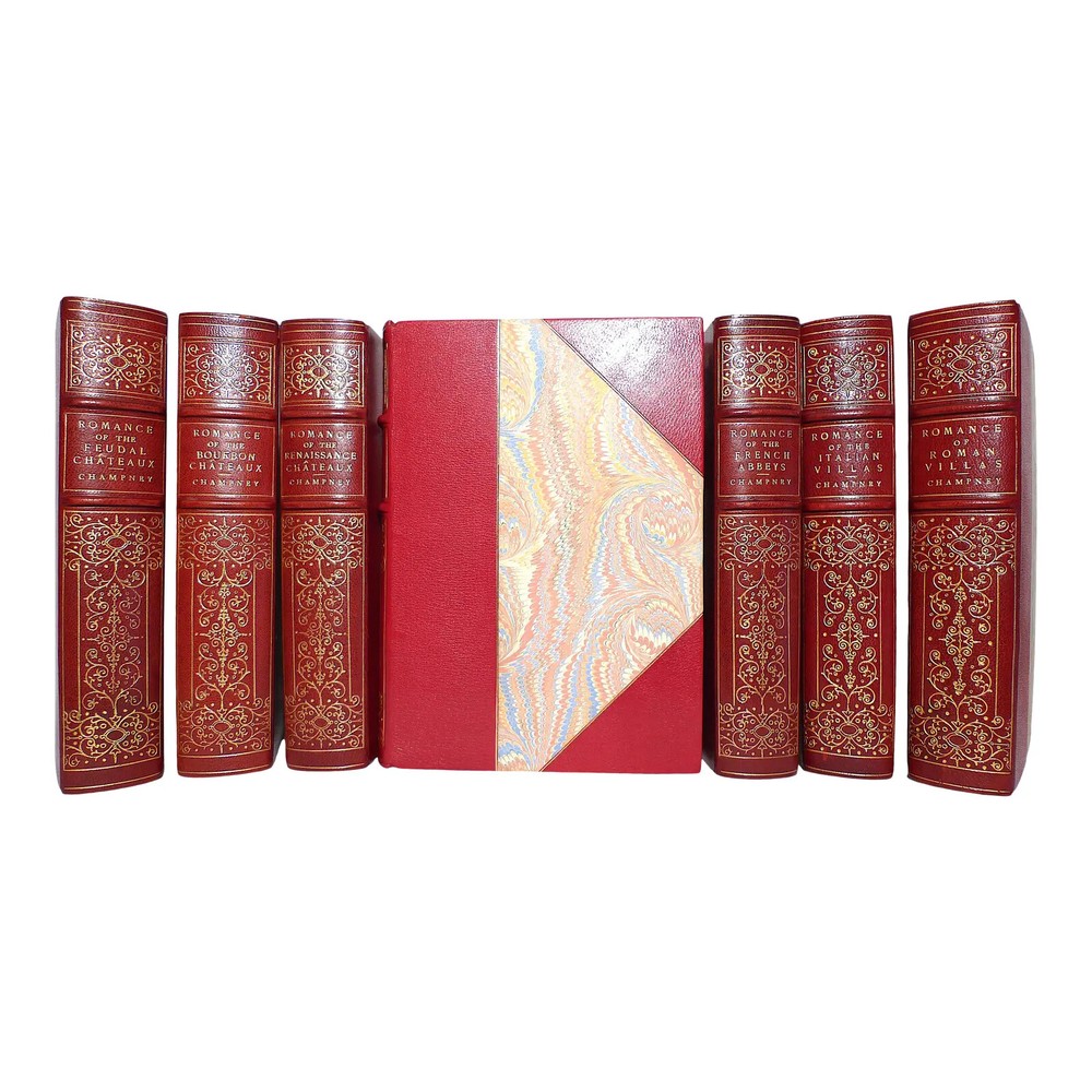 Early 20th Century Illustrated Leather Volume Set, Elizabeth W. Champney's Romance Series - 7 Books. The Series explores romantic, semi-fictional descriptions and stories of foreign locations. Author: Elizabeth Williams Champney Illustrator: James Wells Champney Publisher: G.P. Putnam's Sons, New York, Knickerbocker Press Description: 3/4 Leather-bound hardcovers, spines gilt with title/embellishment, marble boards and endpapers, gilt upper leaf edge, profusely illustrated text, 7 of a 9 book series. Titles/Publication Year: Romance of the Feudal Chateaux 1905 Romance of the Bourbon Chateaux 1904 Romance of the Renaissance Chateaux 1905 Romance of Imperial Rome 1910 Romance of the French Abbeys 1905 Romance of the Italian Villas 1906 Romance of the Roman Villas 1909
