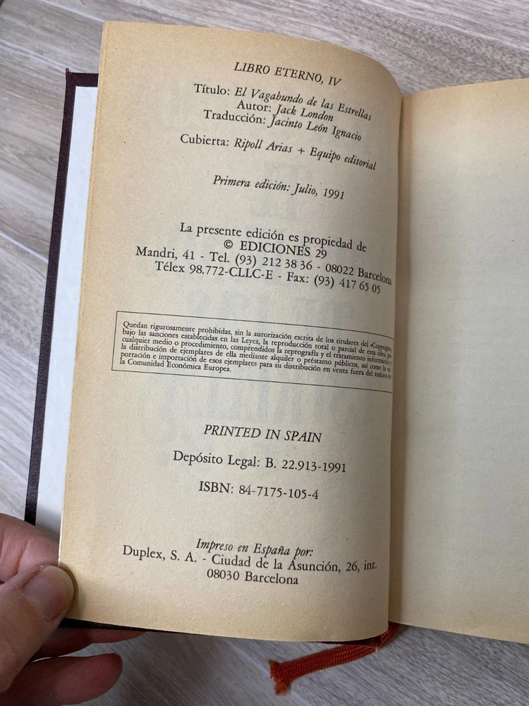 VINTAGE SPANISH LANGUAGE HARDCOVER BOOK: EL VAGABUNDO DE LAS ESTRELLAS (THE STAR ROVER) BY JACK LONDON Published by Ediciones 29, Spain -- First Edition 1991 280 pages Condition -- See Photos Hardcover is tearing away from binding at top inside front cover Leather binding on the spine is torn in places Shows age-appropriate wear Pages in good condition - Only writing is a neatly written inscription inside front cover Please Read: This is a Vintage item which shows signs of wear and may have flaws. It may require repair, mending, cleaning, and polishing. I have tried my best to describe it accurately and photograph all issues. Kindly ZOOM IN on all photos and feel free to ask questions . All Sales Final. Thanks for stopping by Rocky Road Trading Post ~ We appreciate your business!