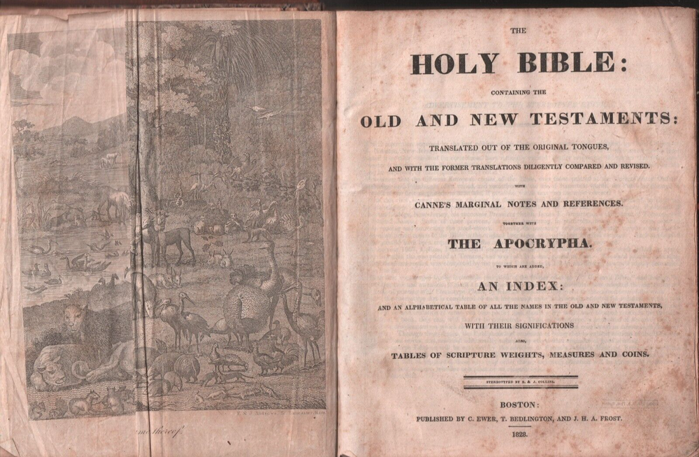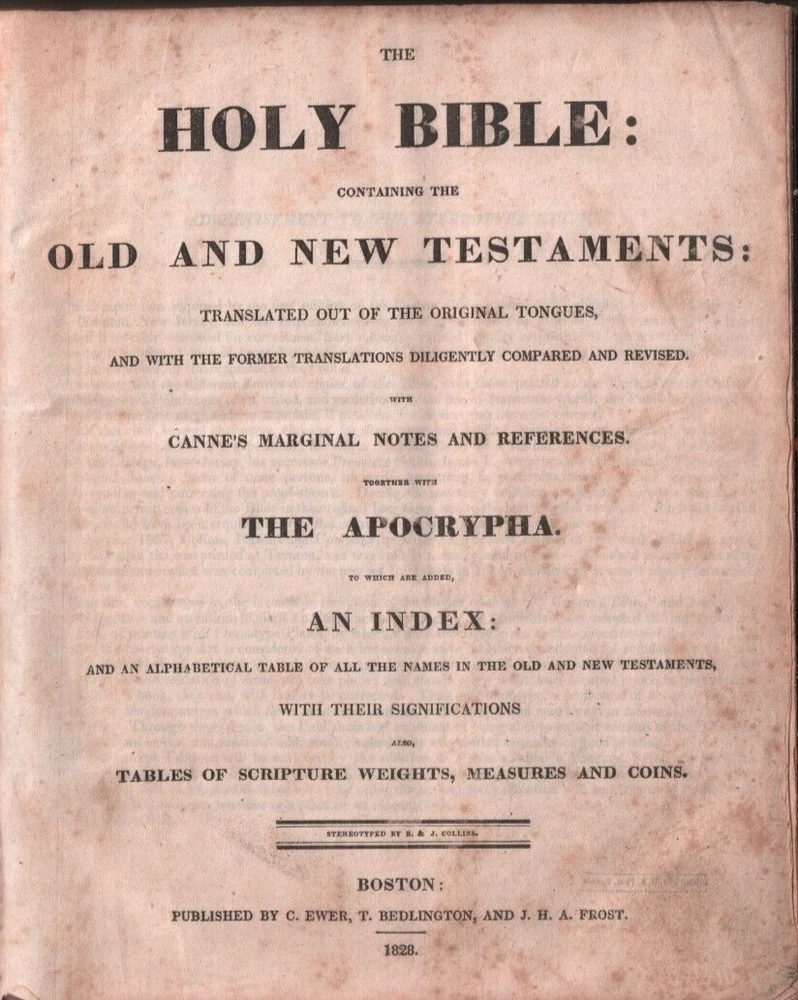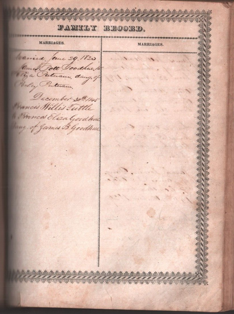 This Bible was owned by Captain James Bott Goodhue and his wife Eliza Putnam. They were married June 29th, 1823 in Essex county Massachusetts. It does list their offspring and dates of birth and or passing. There is some foxing and creased corners throughout. the covers are attached, although the front cover is held on by the twine it is bound with. There are several engravings throughout the Bible, and there is a fold out in the front that depicts Adam naming the creation. It was published by C. Ewer, T. Bedlington, and J. H. A. Frost. If you need more information or photos, please don't hesitate to ask. Thank you For Visiting My Ebay Store, Schoolhouse Trading Post of Wilton, Maine! If you have any concern about your order, please contact me. I specialize in Historic Items - Yearbooks, Ephemera, Maine Books, Historical and Genealogical Books, Old Sermons, Postcards, Railroad Books and Paper, Catalogs, Maps, and Old Magazines. Etc.!