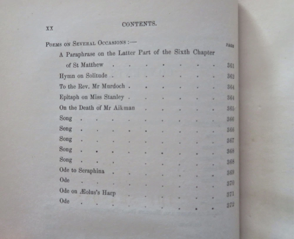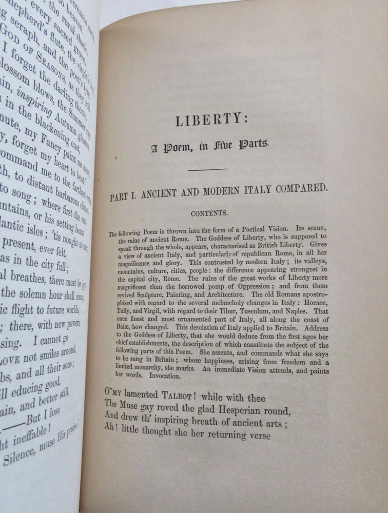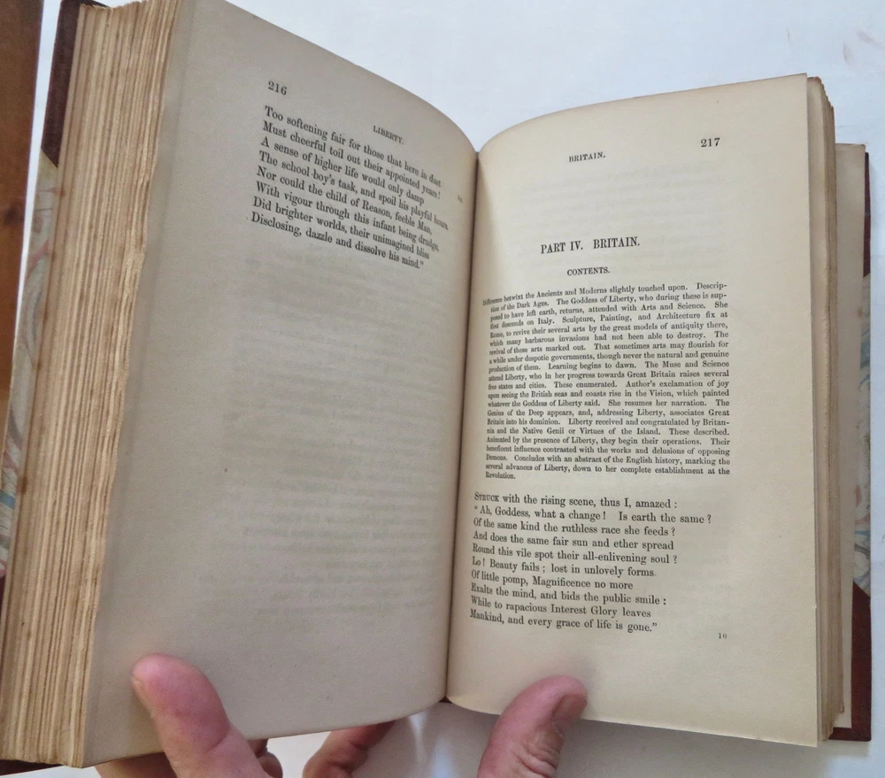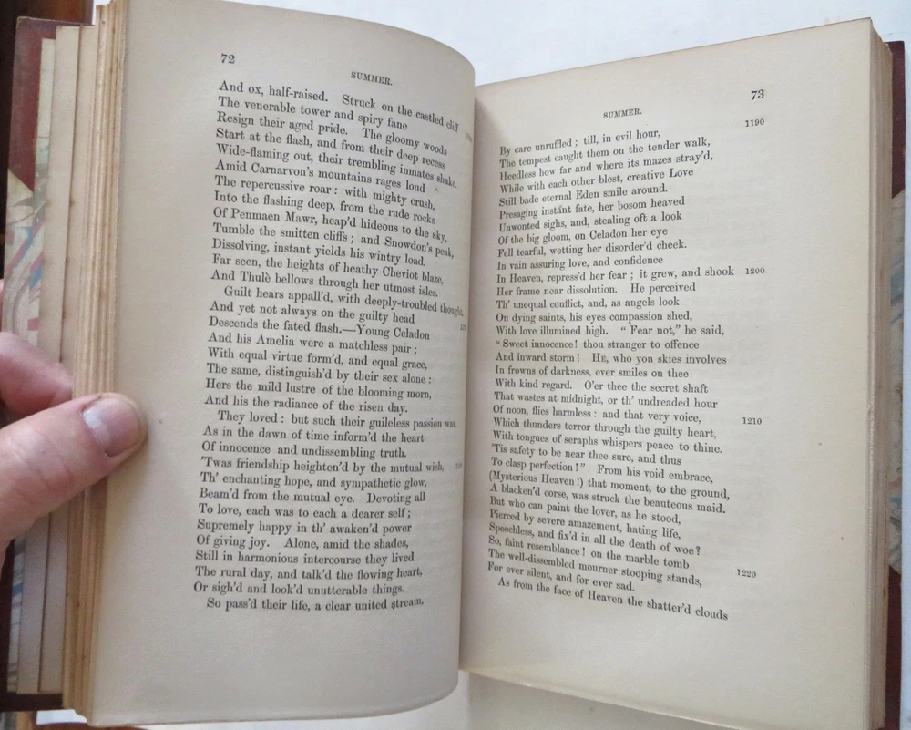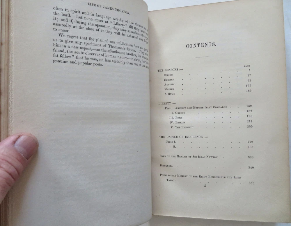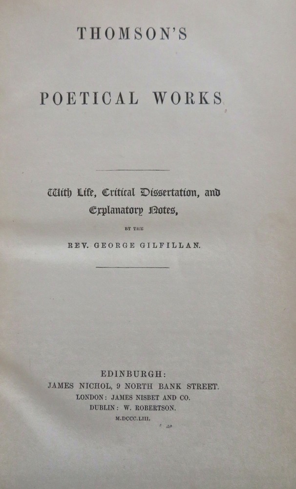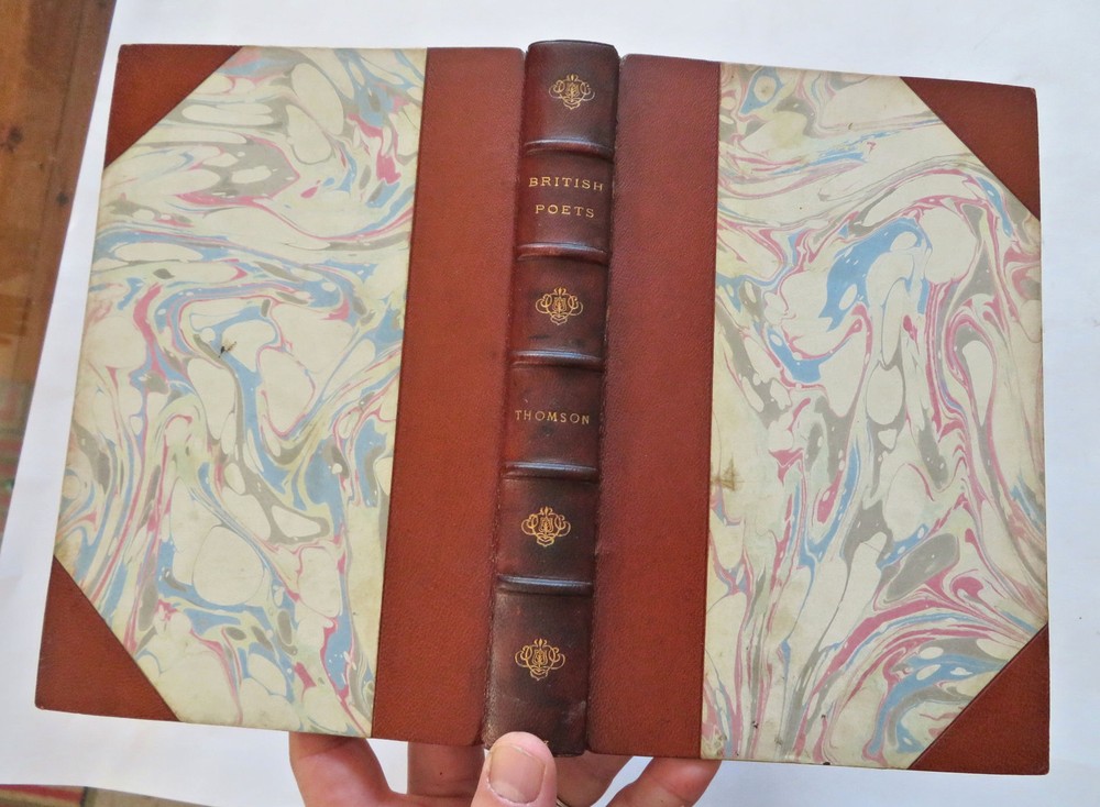 James Thomson Collected Poems English Poets 1853 lovely leather book James Thomson Collected Poems English Poets 1853 lovely leather book (Old Books, 19th Century Books, Leather Books, Poetry, English Poets, James Thomson, Collected Poems). Thomson's Poetical Works: with Life, Critical Dissertation, and Explanatory Notes by the Rev. George Gilfillan. Published 1853, Edinburgh by James Nichol. 372 pages. Text in English. Attractive antiquarian 1/2 leather binding, raised bands, gilt title lettering, gilt compartment decorations, marbled covers. Book is over 150 years old and shows some signs of handling and time. Binding gently age worn but still appealing, leather and joints rubbed and scuffed in spots hairline crack at head of front joint, small chipping to spine head, leather still supple, remains overall very attractive as an object. Text block paper is gently age toned as typical, internally book remains mostly clean, tight and sound. A book which has been taken care of but may/ does not look like new. Still attractive on the shelf. Book displays a pleasing and unique age patina and is in rather nice antiquarian condition, any age flaws seem easy to overlook or forgive. Please review photos for more detailed attempt to present this book as it survives. We often over-describe any flaws that many sellers would not even bother to mention since most people would overlook them as minor and unworthy of comment. Many people tell us the books they receive from us are nicer in person than they appears on the screen. We want you to be clear about what you are buying, so we take numerous photos and try to describe it openly and honestly. Book Measures c. 9" H x 6" W. [B11548].