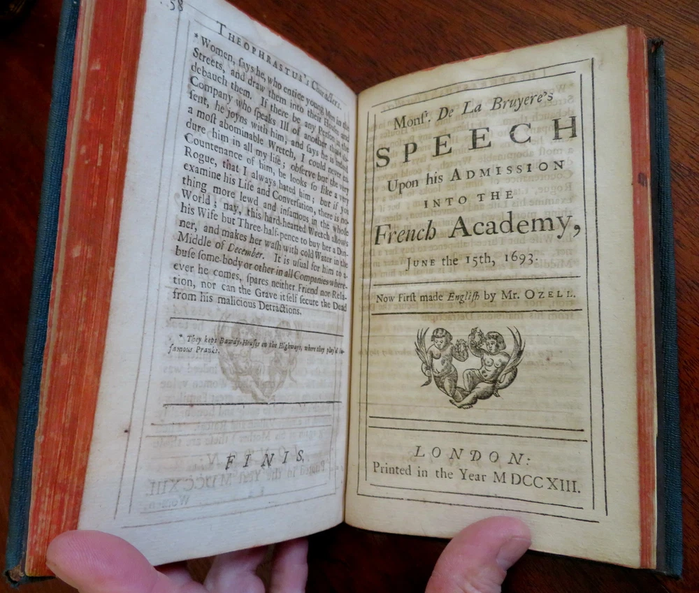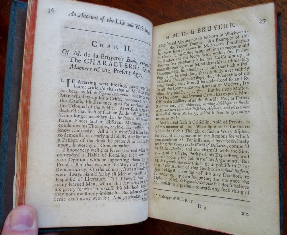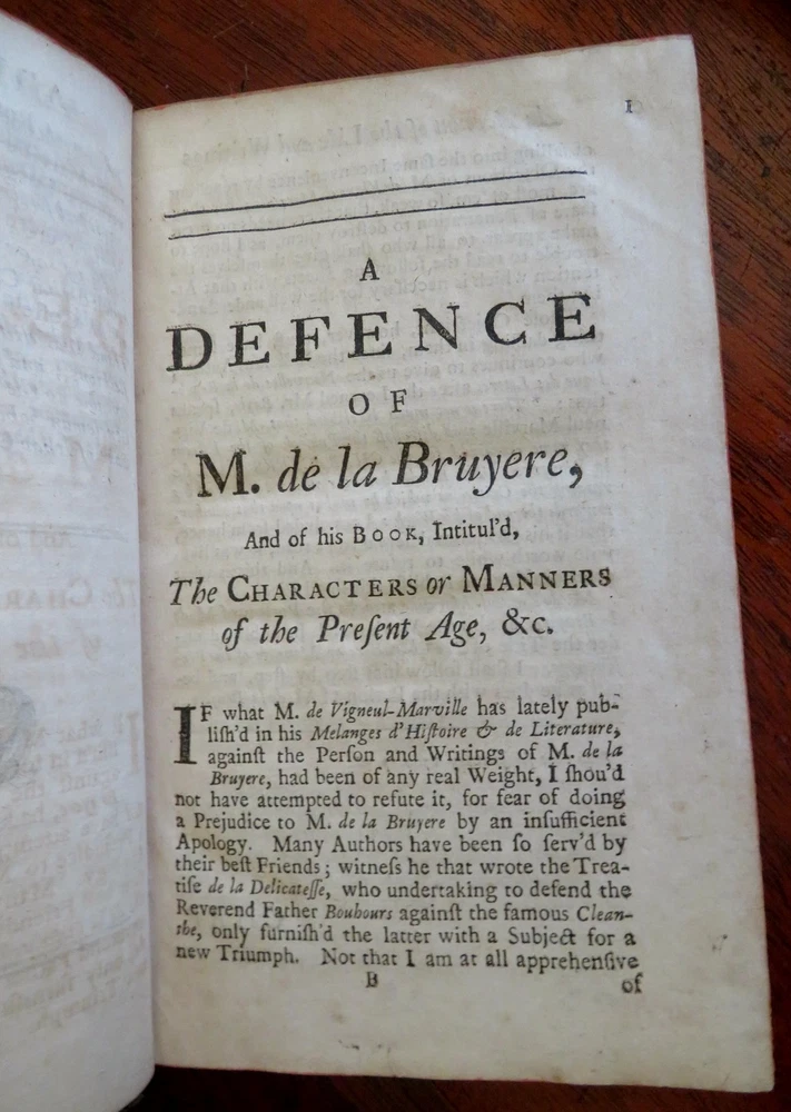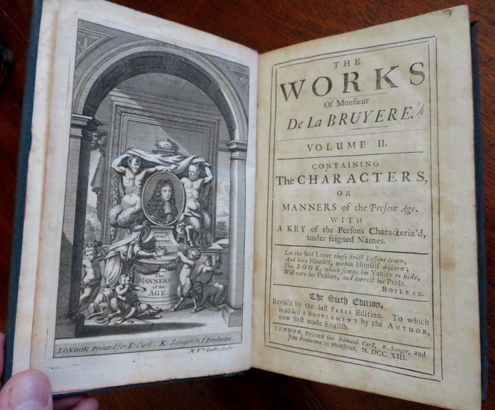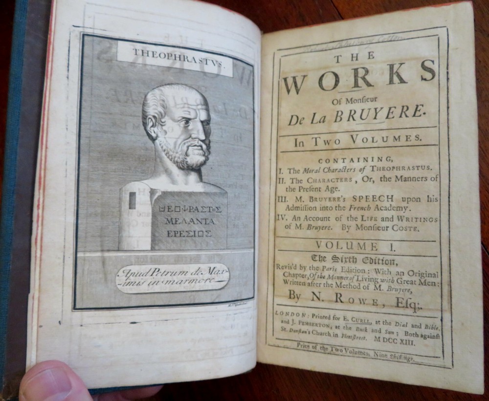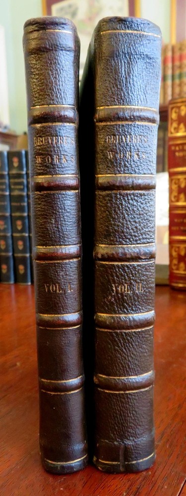 Jean de la Bruyere French Philosopher Collected Works 1713 Rowe leather 2 v. set Jean de la Bruyere French Philosopher Collected Works 1713 Rowe leather 2 v. set (Old Books, 18th Century Books, Leather Books, Morals, Theophrastus, Manners, Customs). The Works of Monsieur de la Bruyere in Two Volumes. Containing the Moral Characters of Theophrastus; The Characters, or Manners, of the Present Age; M. Bruyere's Speech Upon His Admission into the French Academy; An Account of the Life and Writings of M. Bruyere by Monsieur Coste. Sixth Edition by N. Rowe. 6th edition published 1713, London for E. Curll & J. Pemberton. 2 volumes, 119, 58, xviii, 18, 8; 400, Index at rear of vol. 2. Text in English. Copper engraved frontis plates in each volume [by van der Gucht]. First volume resembles a sammelband, first volume has title pages for "The Moral Characters of Theophrastus" (58 pp.), then "Speech Upon his Admission into the French French Academy" (18 pp.), Of the Manner of Living with Great Men." (8 pp.). Attractive antiquarian 1/4 leather bindings, raised & gilt bands, gilt title lettering, cloth covers. Set is physically old and shows some signs of handling and time. Binding gently age worn but still appealing, leather and joints slightly rubbed but still supple, remains overall very attractive as an object. Text block paper is gently age toned as typical, evidence of light old damp staining to paper, internally each book remains mostly clean, tight and sound. A book which has been taken care of but may/ does not look like new. Still attractive on the shelf. Set displays a pleasing and unique age patina and is in rather nice antiquarian condition, any age flaws seem easy to overlook or forgive. Please review photos for more detailed attempt to present this set as it survives. We often over-describe any flaws that many sellers would not even bother to mention since most people would overlook them as minor and unworthy of comment. Many people tell us the books they receive from us are nicer in person than they appears on the screen. We want you to be clear about what you are buying, so we take numerous photos and try to describe it openly and honestly. Book Measures c. 7 3/4" H x 5" W. [B8519].