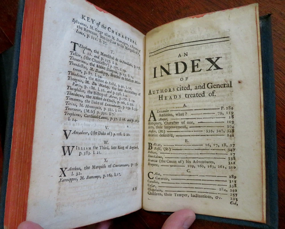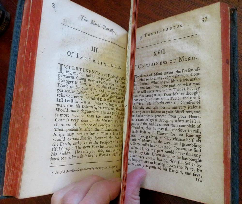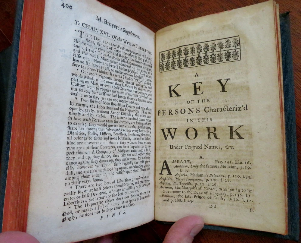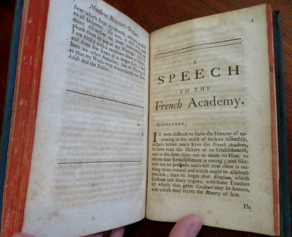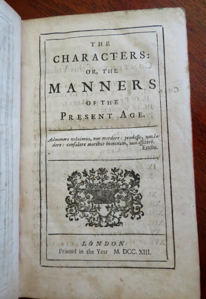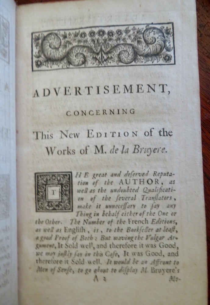 Jean de la Bruyere French Philosopher Collected Works 1713 Rowe leather 2 v. set Jean de la Bruyere French Philosopher Collected Works 1713 Rowe leather 2 v. set (Old Books, 18th Century Books, Leather Books, Morals, Theophrastus, Manners, Customs). The Works of Monsieur de la Bruyere in Two Volumes. Containing the Moral Characters of Theophrastus; The Characters, or Manners, of the Present Age; M. Bruyere's Speech Upon His Admission into the French Academy; An Account of the Life and Writings of M. Bruyere by Monsieur Coste. Sixth Edition by N. Rowe. 6th edition published 1713, London for E. Curll & J. Pemberton. 2 volumes, 119, 58, xviii, 18, 8; 400, Index at rear of vol. 2. Text in English. Copper engraved frontis plates in each volume [by van der Gucht]. First volume resembles a sammelband, first volume has title pages for "The Moral Characters of Theophrastus" (58 pp.), then "Speech Upon his Admission into the French French Academy" (18 pp.), Of the Manner of Living with Great Men." (8 pp.). Attractive antiquarian 1/4 leather bindings, raised & gilt bands, gilt title lettering, cloth covers. Set is physically old and shows some signs of handling and time. Binding gently age worn but still appealing, leather and joints slightly rubbed but still supple, remains overall very attractive as an object. Text block paper is gently age toned as typical, evidence of light old damp staining to paper, internally each book remains mostly clean, tight and sound. A book which has been taken care of but may/ does not look like new. Still attractive on the shelf. Set displays a pleasing and unique age patina and is in rather nice antiquarian condition, any age flaws seem easy to overlook or forgive. Please review photos for more detailed attempt to present this set as it survives. We often over-describe any flaws that many sellers would not even bother to mention since most people would overlook them as minor and unworthy of comment. Many people tell us the books they receive from us are nicer in person than they appears on the screen. We want you to be clear about what you are buying, so we take numerous photos and try to describe it openly and honestly. Book Measures c. 7 3/4" H x 5" W. [B8519].