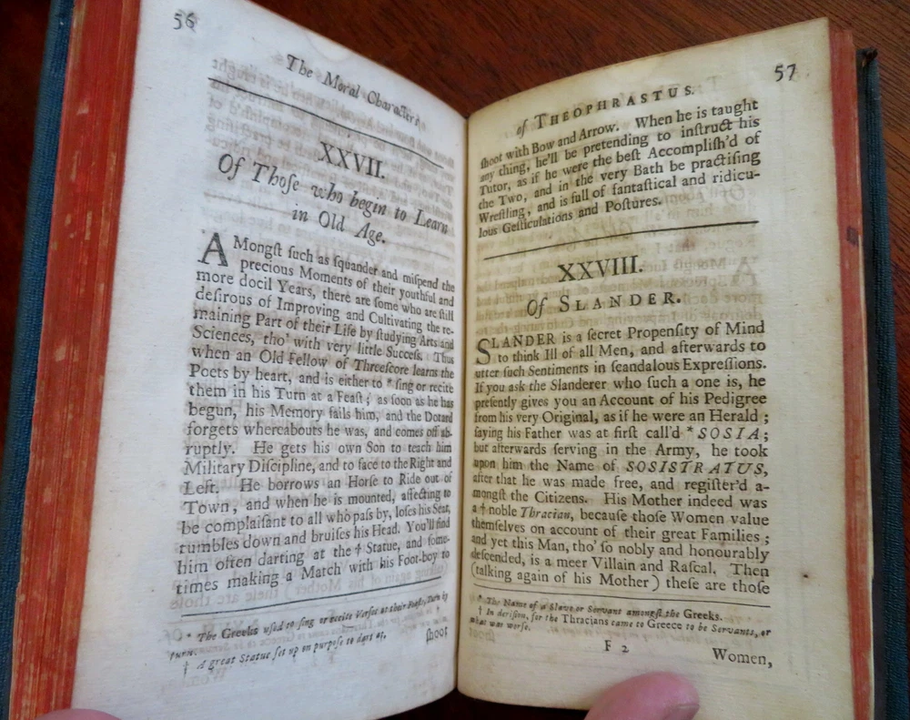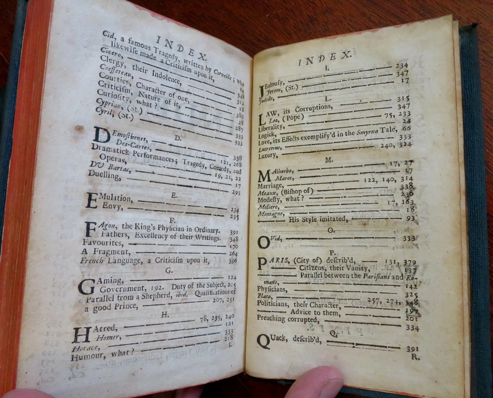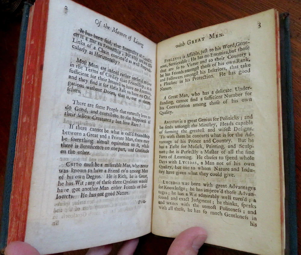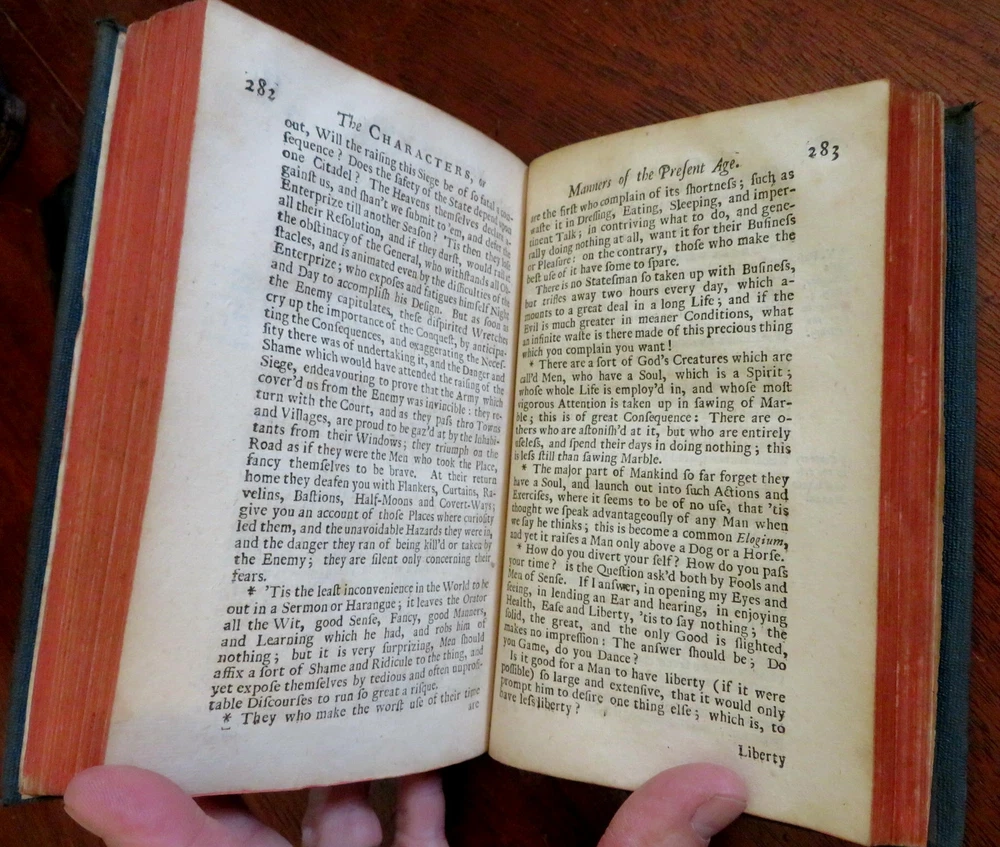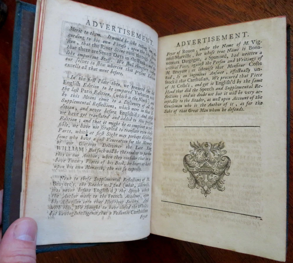Jean de la Bruyere French Philosopher Collected Works 1713 Rowe leather 2 v. set Jean de la Bruyere French Philosopher Collected Works 1713 Rowe leather 2 v. set (Old Books, 18th Century Books, Leather Books, Morals, Theophrastus, Manners, Customs). The Works of Monsieur de la Bruyere in Two Volumes. Containing the Moral Characters of Theophrastus; The Characters, or Manners, of the Present Age; M. Bruyere's Speech Upon His Admission into the French Academy; An Account of the Life and Writings of M. Bruyere by Monsieur Coste. Sixth Edition by N. Rowe. 6th edition published 1713, London for E. Curll & J. Pemberton. 2 volumes, 119, 58, xviii, 18, 8; 400, Index at rear of vol. 2. Text in English. Copper engraved frontis plates in each volume [by van der Gucht]. First volume resembles a sammelband, first volume has title pages for "The Moral Characters of Theophrastus" (58 pp.), then "Speech Upon his Admission into the French French Academy" (18 pp.), Of the Manner of Living with Great Men." (8 pp.). Attractive antiquarian 1/4 leather bindings, raised & gilt bands, gilt title lettering, cloth covers. Set is physically old and shows some signs of handling and time. Binding gently age worn but still appealing, leather and joints slightly rubbed but still supple, remains overall very attractive as an object. Text block paper is gently age toned as typical, evidence of light old damp staining to paper, internally each book remains mostly clean, tight and sound. A book which has been taken care of but may/ does not look like new. Still attractive on the shelf. Set displays a pleasing and unique age patina and is in rather nice antiquarian condition, any age flaws seem easy to overlook or forgive. Please review photos for more detailed attempt to present this set as it survives. We often over-describe any flaws that many sellers would not even bother to mention since most people would overlook them as minor and unworthy of comment. Many people tell us the books they receive from us are nicer in person than they appears on the screen. We want you to be clear about what you are buying, so we take numerous photos and try to describe it openly and honestly. Book Measures c. 7 3/4" H x 5" W. [B8519].