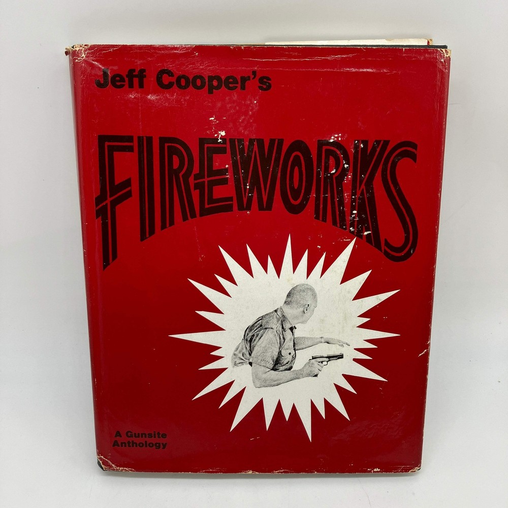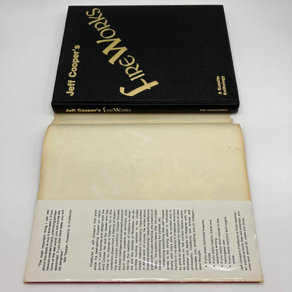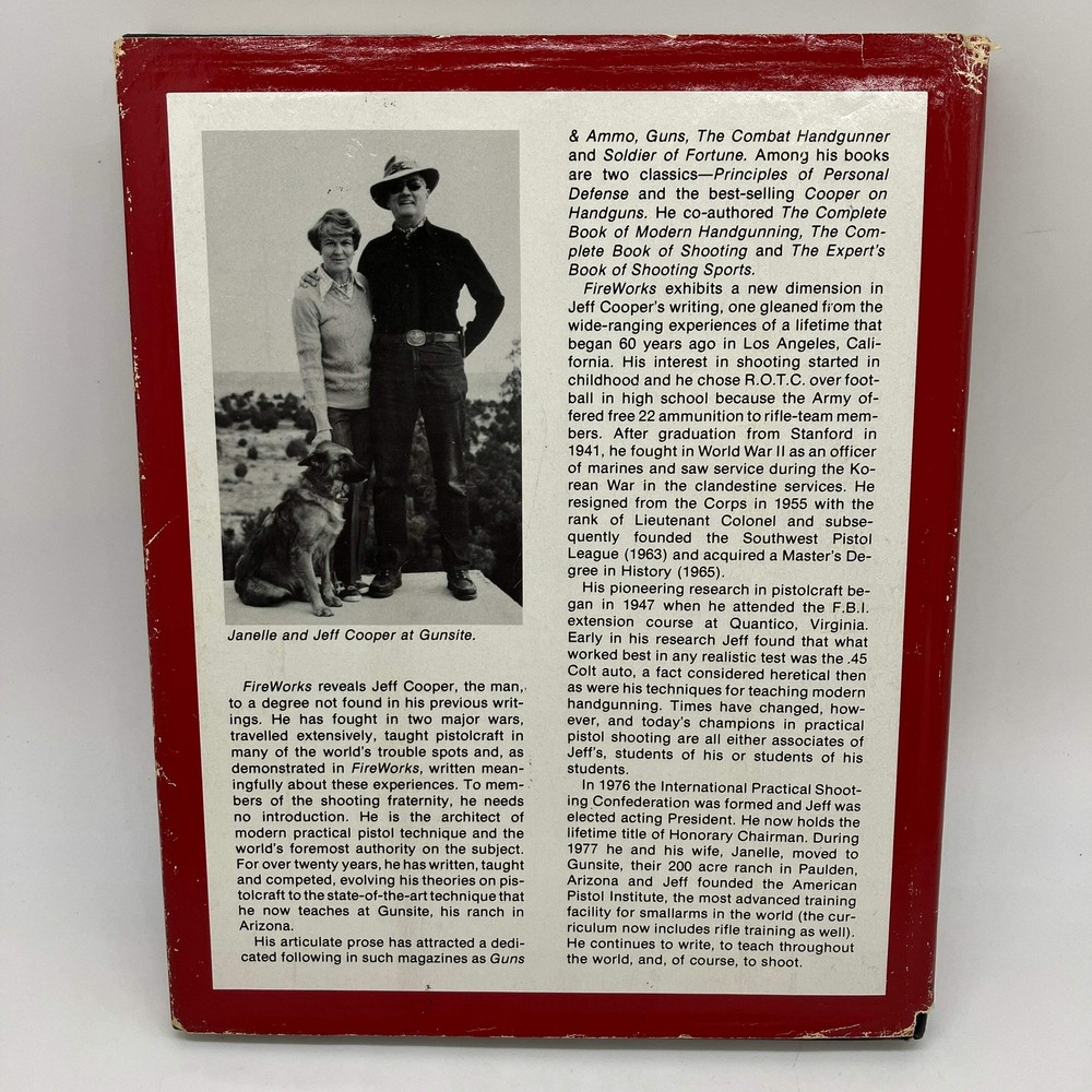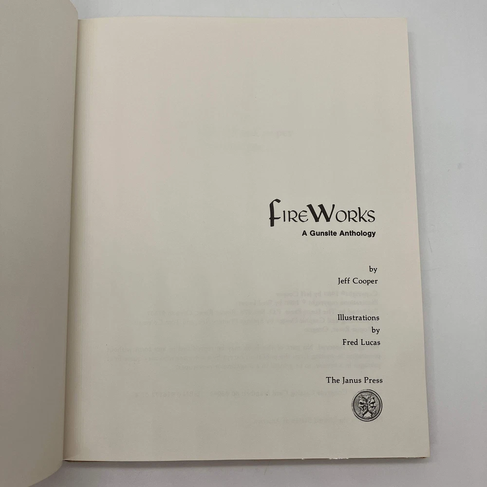 The Janus Press, 1980. Leather bound large illustrated hardcover with dust jacket of Jeff Cooper's Fireworks: A Gunsite Anthology with illustrations by Fred Lucas. "Jeff Cooper's first book since his best-selling Cooper on Handguns...will surprise and delight both the avid Cooper fan and the reader who has little or no interest in firearms, for in this collection drawn from a lifetime of observing the human condition, Cooper focuses his keen intelligence and perceptive eye on such diverse subjects as terrorism, auto racing, the tradition of violence in America and the demise of Rhodesia." Good condition. Contains a few check mark markings in pen to the interior page margins. Previous owner's name stamped to the edge of the page block. Edge and corner wear to the dust jacket. Solid book with shelf wear.