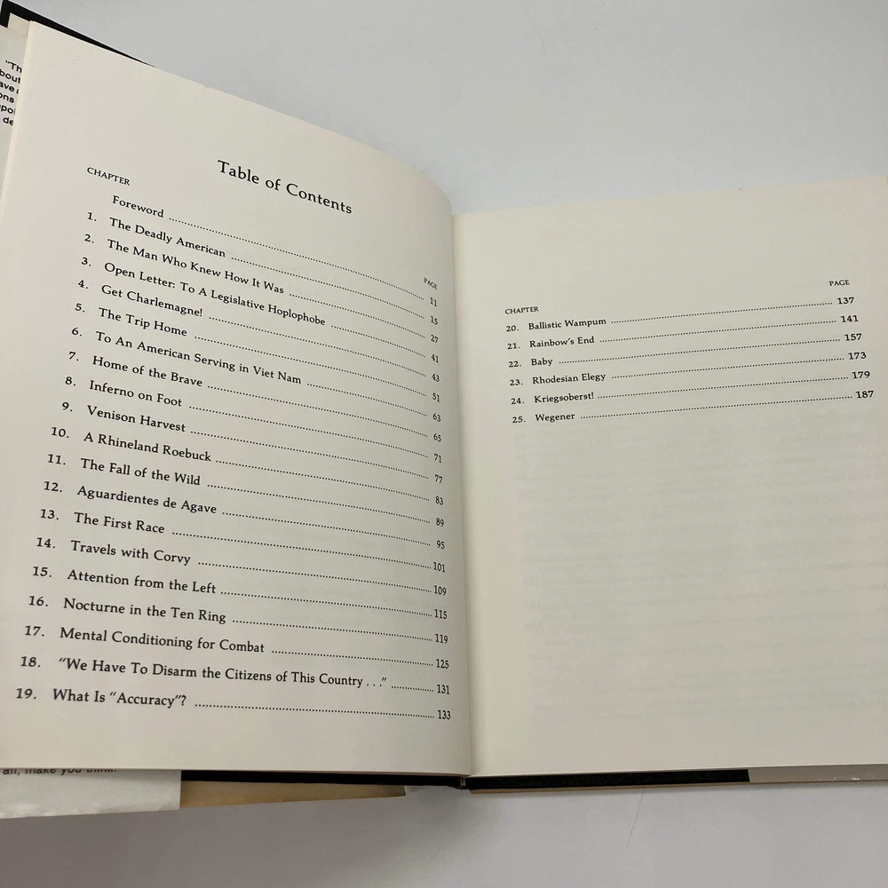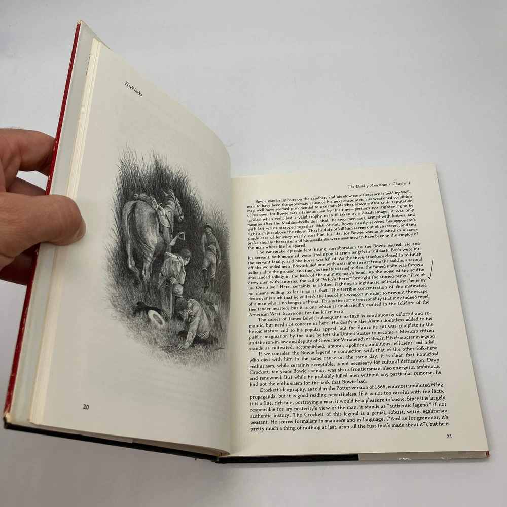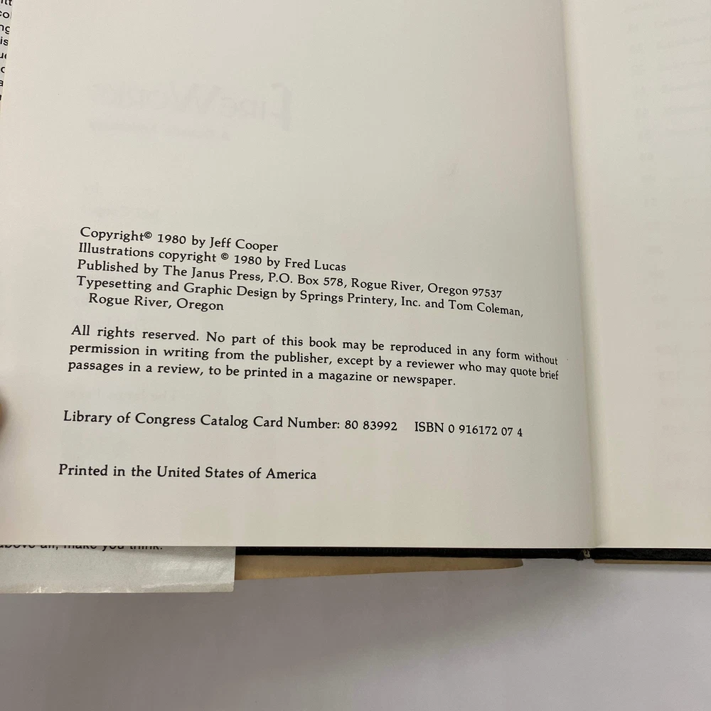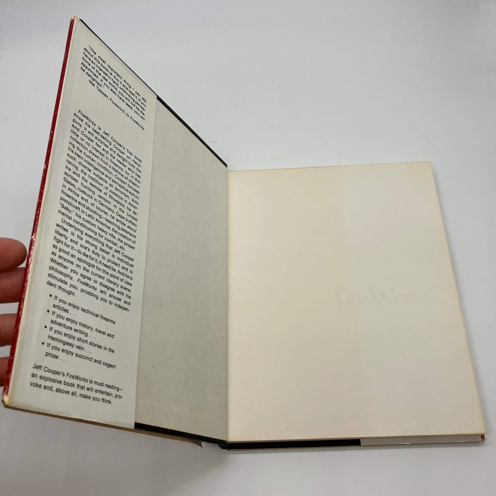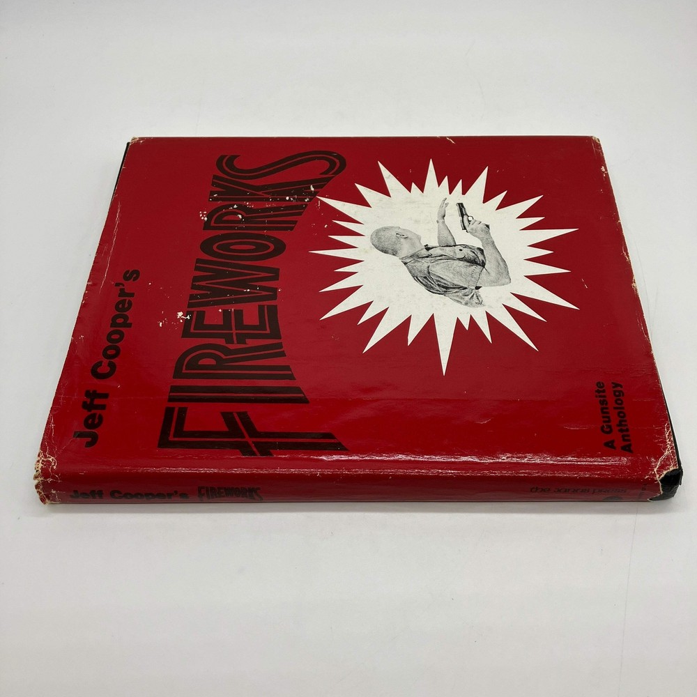 The Janus Press, 1980. Leather bound large illustrated hardcover with dust jacket of Jeff Cooper's Fireworks: A Gunsite Anthology with illustrations by Fred Lucas. "Jeff Cooper's first book since his best-selling Cooper on Handguns...will surprise and delight both the avid Cooper fan and the reader who has little or no interest in firearms, for in this collection drawn from a lifetime of observing the human condition, Cooper focuses his keen intelligence and perceptive eye on such diverse subjects as terrorism, auto racing, the tradition of violence in America and the demise of Rhodesia." Good condition. Contains a few check mark markings in pen to the interior page margins. Previous owner's name stamped to the edge of the page block. Edge and corner wear to the dust jacket. Solid book with shelf wear.