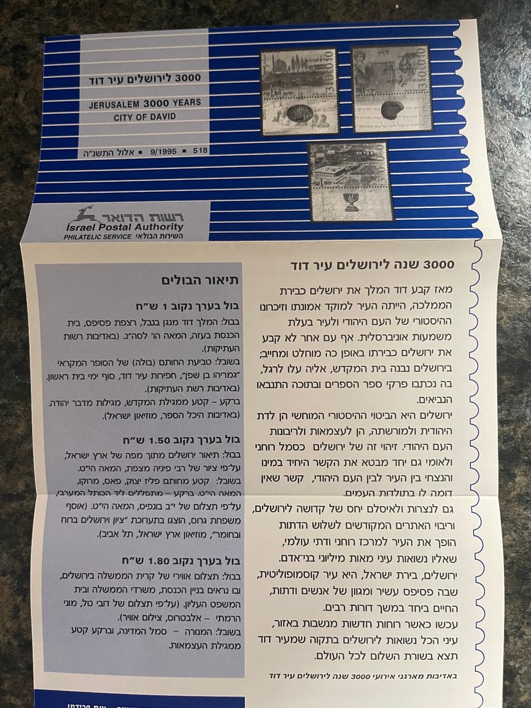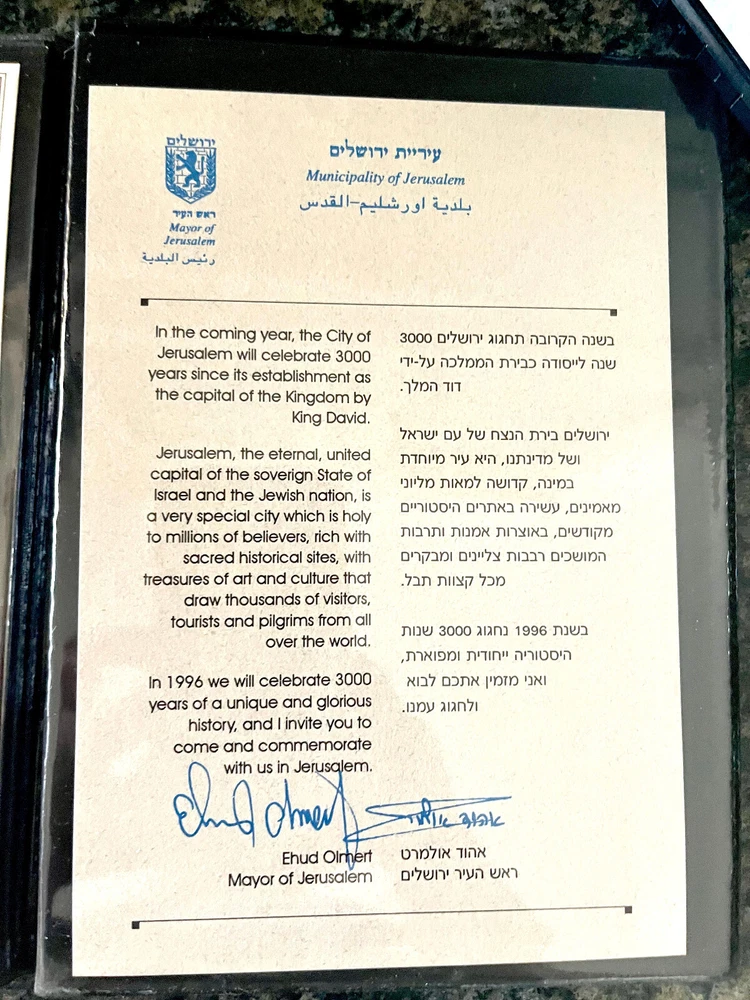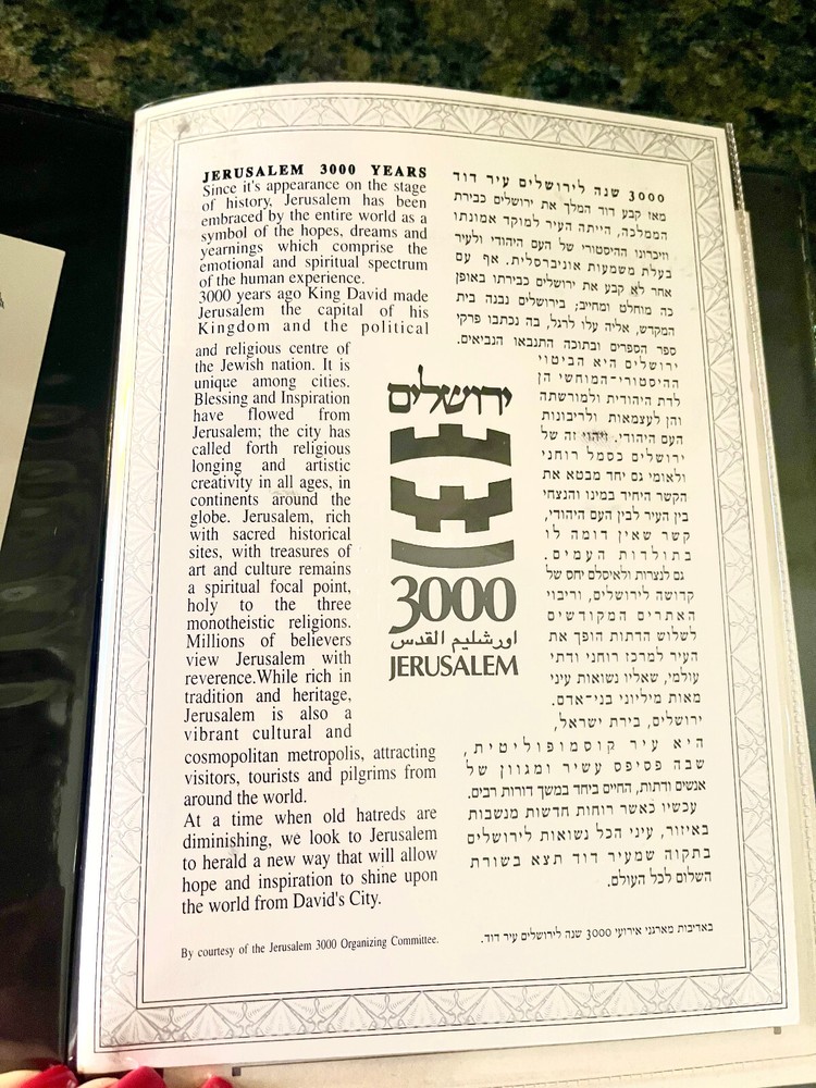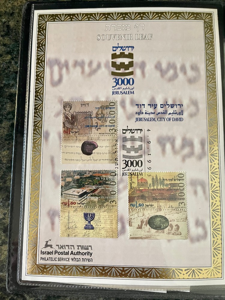 Worked for the City of Jerusalem and was given this beautiful authentic collection bound book in a beautiful black leather jacket 4 Inserts of Stamps, letters of authenticity. Signed by Jerusalem Mayor Ehud Olmert Dated 1995