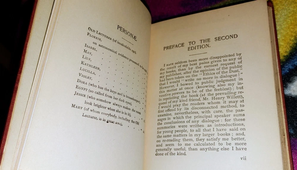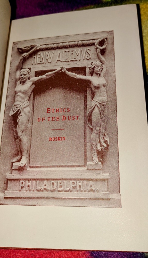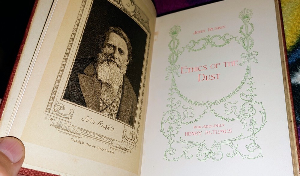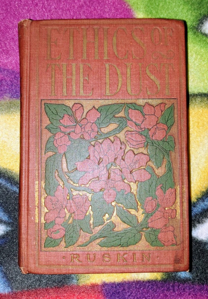 John Ruskin "Ethics of the Dust" Leather HC-Authors Preferred 2nd Edition (1899). A lovely copy of Ruskin's collection of essays. Burgundy boards with decorative raised green/burgundy flowers & leaves on the cover. (Some hints of gold left as well, but most has rubbed away.) Blocking/pages are clean, tanning commensurate with age. "Preface to the Second Edition (1877)" expands upon authors reasons for adding to/editing his original text. 1899 dating comes from the portrait of the author (c) by Henry Altemus, which makes this edition (probably) the last one published before the authors death (1900). Previous owners gift inscription dated 1900. Discoloration on back cover. Corner bump. See pics for details. Overall, a G+/VG- copy with great cover details, and as far as I can tell, the only copy of this beautiful 1899 edition being offered on the internet! MKWBOOKS-Great Auctions At Even Greater Prices!