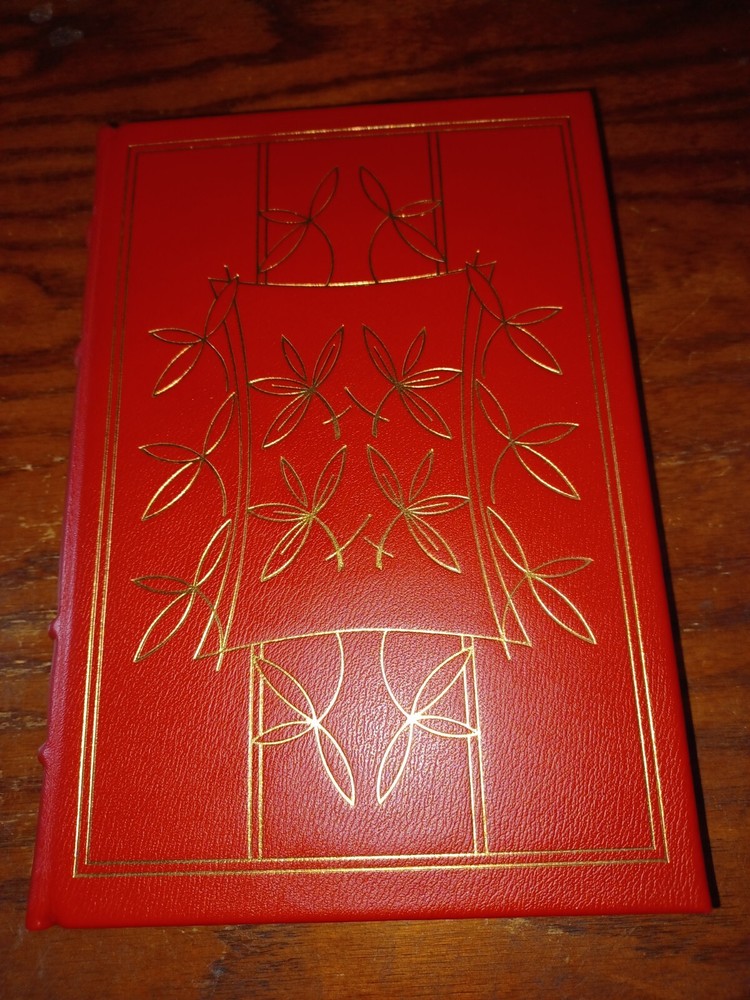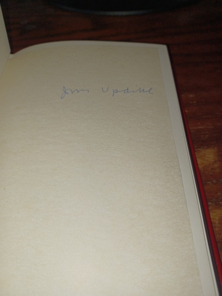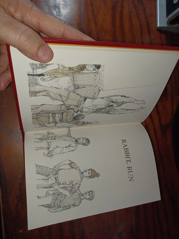No reserve. Rabbit, Run, written by John Updike. Limited edition hardback published by the Franklin Library in 1977 and signed by Updike (without presentation) on blank page overlaid with tissue guard. This is not a facsimile or printed signature. Fully leather bound with gilding to both boards and spine, which also features raised bands. Silk end pages. Gilding to all three text block edges. Book ribbon. Not an ex-library book. No additional interior markings. Apparent sunning around end page margins. Don't believe this volume has ever been read, and binding accordingly a bit stiff. S/H $7.49 media mail in bubble pack envelope; $9.99 in box.