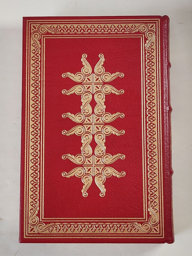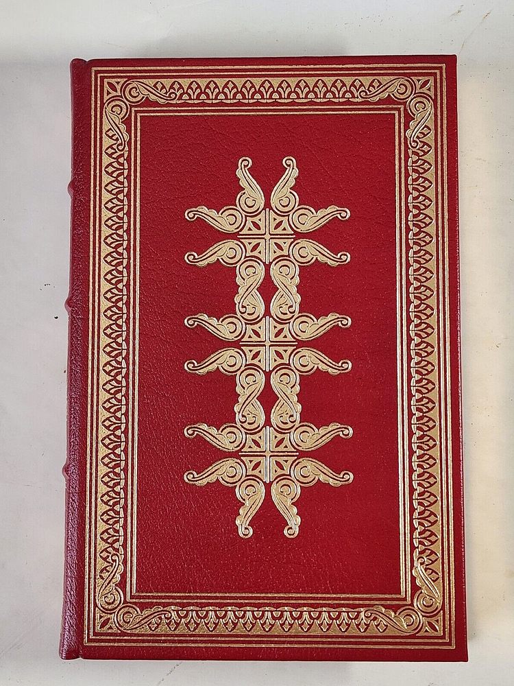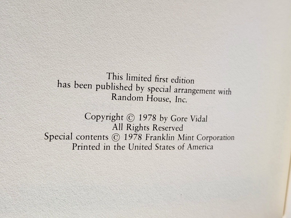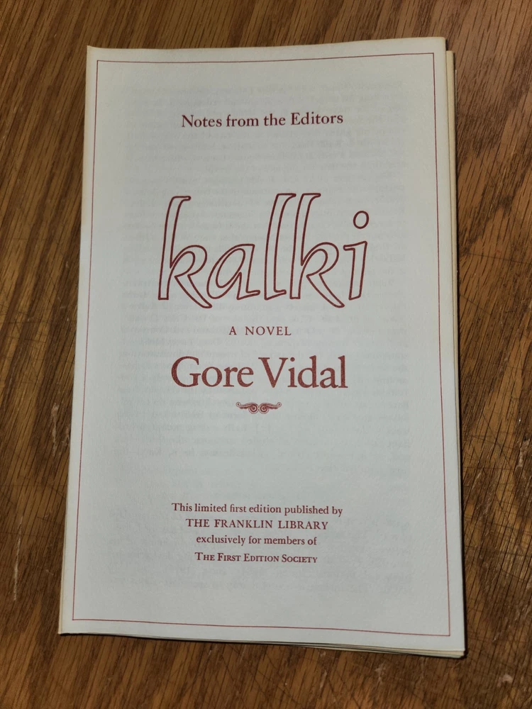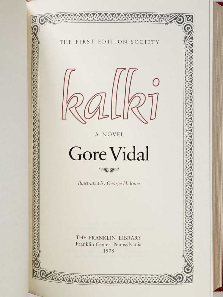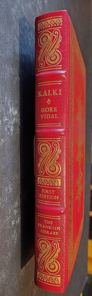 From the Franklin Library Collection. To satisfy a public that longs for a savior, Vidal’s eponymous hero of Kalki, born and bred in America’s Midwest, establishes himself in Nepal, puts out the word that he is the last incarnation of the god Vishnu, and predicts an imminent apocalypse meant to cleanse the planet. Kalki: by,Gore Vidal. Franklin Library Random House, Pub. Ltd Edition. 1st Edition. Leather. 1978 Leather Bound Gilt page edges Silk Endpapers Raised Bands Satin Bookmark Ribbon Accented in 22kt gold Limited Edition First Edition Society Comes with “Notes from The Editors” Booklet. Terminology that may be used in this description: Bookplate: Highly sought after by some collectors, a book plate is an inscribed or decorative device that identifies the owner, or former owner, of a book. Most often bookplates are affixed to the endpaper of a book. Bump: Indicates that the affected part of the book has been impacted in such a way so as to cause a flattening, indention, or light bending. Deckle Edge: Deckle edge is the feathered edge of a page. Traditionally and historically, this was a side effect of the process of making paper. Dust Jacket: Sometimes used as another term for dust jacket, a protective and often decorative wrapper, usually made of paper which wraps around the binding of a book Ex-library: A former library book, generally containing library acquisition and ownership stamped Markings, and other typical indications of the library's use. Foxing: Or, Foxed is the age related browning, or brown-yellowish spots, that can occur to book paper over time. When this aging process happens to the paper in a book it is referred to as "foxed". Remainder Mark: A remainder marked book is just that - a mark to the page edges of a book. This mark is placed on the page edges by a publisher as books are returned from bookstores or sold to discounters. Rubbing: Abrasion or wear to the surface. Usually used in reference to a book's boards or dust-jacket. Shelf Wear: (shelving wear) describes damage caused over time to a book by placing and removing a book from a shelf. Soiled: Generally, refers to minor discoloration or staining.