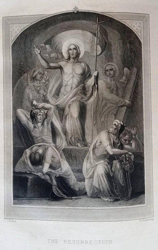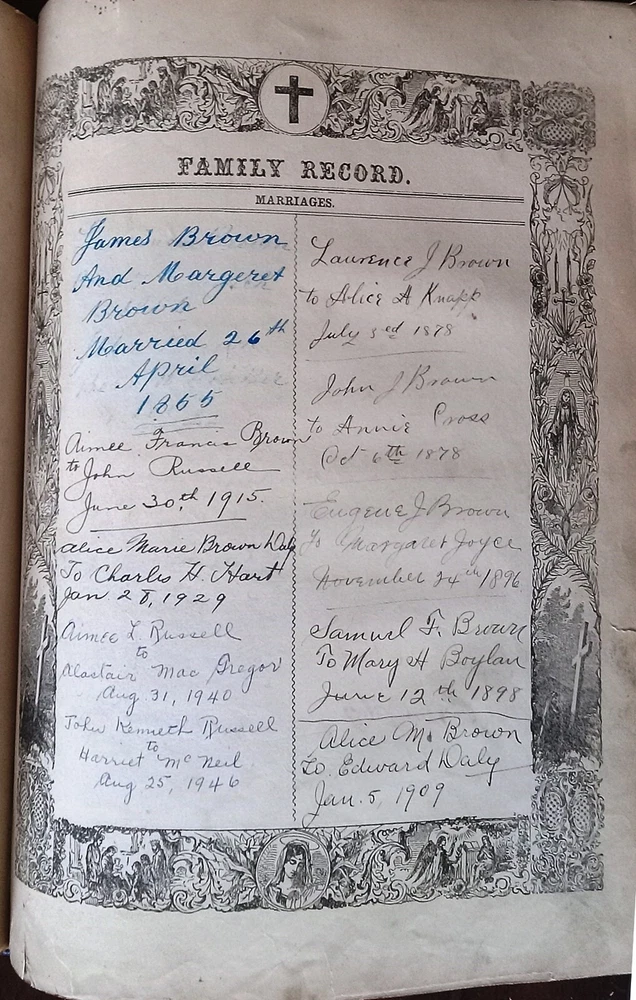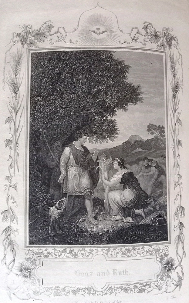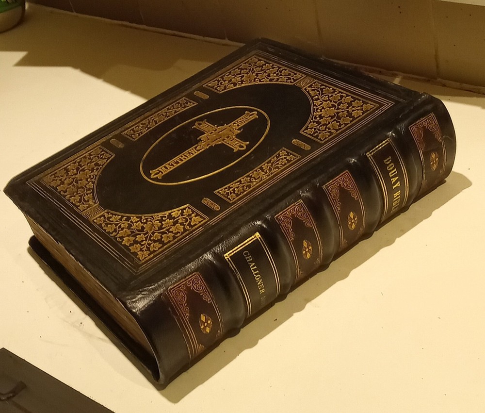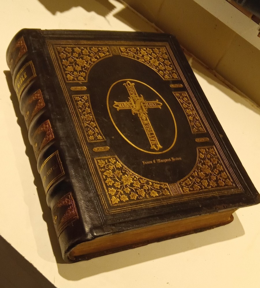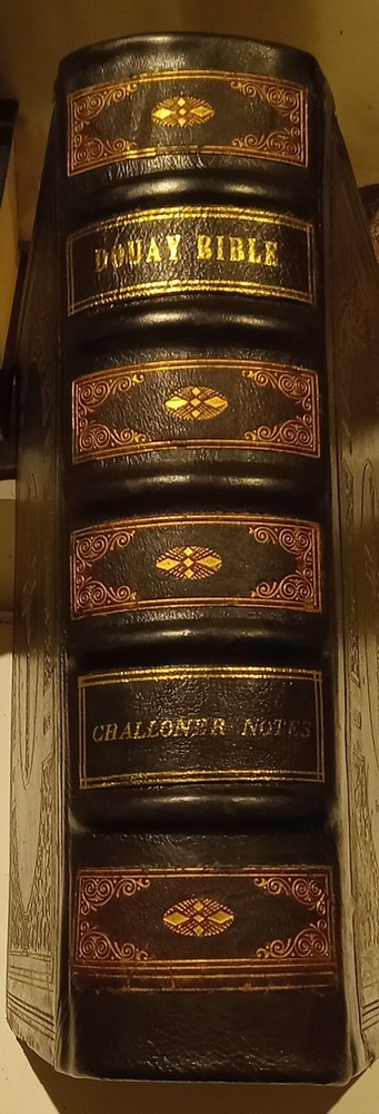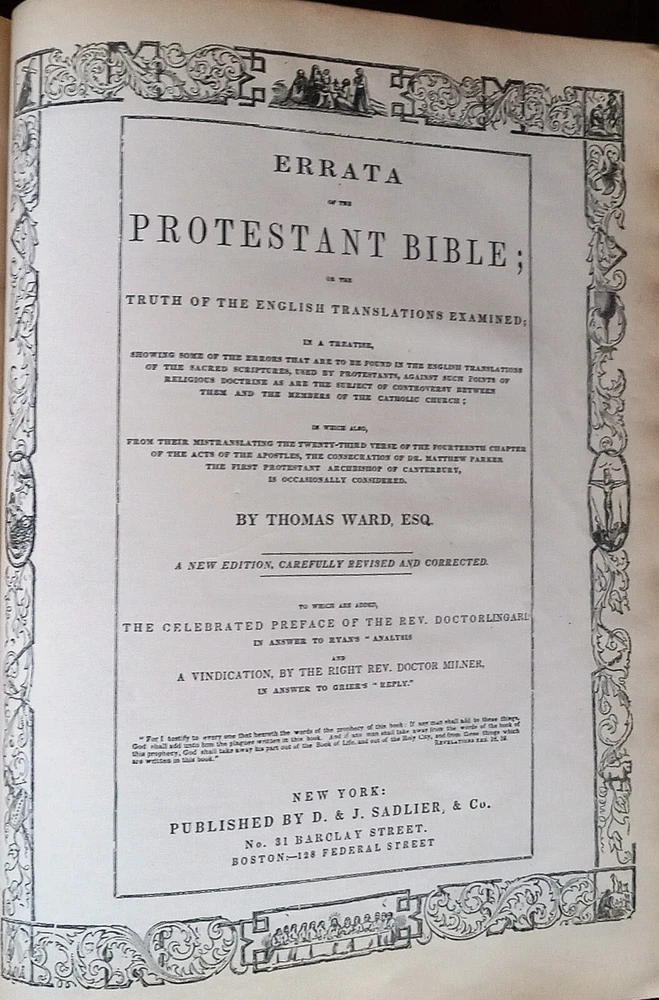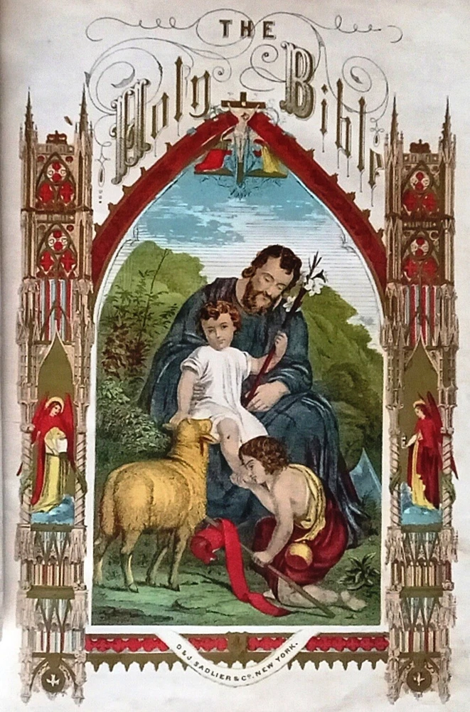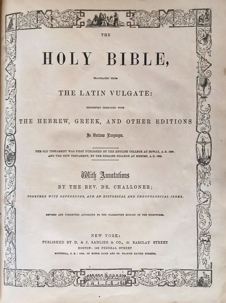 The / Holy Bible, /Translated from / the Latin Vulgate: / Diligently Compared with / the Hebrew, Greek and Other Editions / in Various Languages. / The Old Testament Was First Published at Doway A.D. 1609: / and the New Testament, by the English College at Rheims, A.D. 1582. / With Annotations / by the Rev. Dr. Challoner; / together with References, and an Historical and Chronological Index. / Revised and Corrected according to the Clementine Edition of the Scriptures. / New York: / Published by D. & J. Sadlier & Co., 31 Barclay Street / Boston: 128 Federal Street / Montreal, C.E.; Cor. Of Notre Dame and St. Francis Xavier Streets [ca. 1874]. Large imperial quarto (13’ x 10”) Family Bible with Ward’s Errata of the Protestant Bible included at the end. Fine binding in full leather. Original covers with ornate gilt tooling. Later matching spine in six gilt panels offset by raised bands. Extra illustrated edition: engraved frontispiece and extra illuminated title to Old Testament, two engraved frontispieces to New Testament, plus 38 additional full page engraved plates. All pages surrounded by ornamental border. All edges gilt. Family pages filled in. Otherwise, no writing or underlining. Corners lightly bumped. Leather loss at extremities. Soiling to endpapers and a few small marginal tears not affecting text. Interior shows signs of age with browning and occasional spotting. 793; 228; & 118 pp. including tables. Large, heavy book.