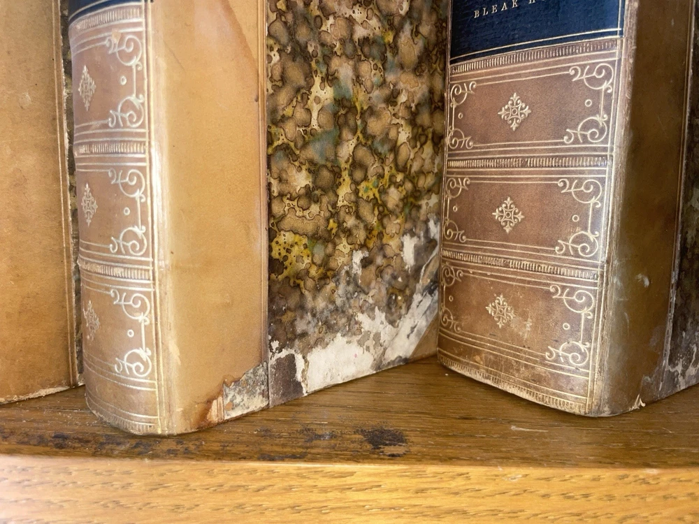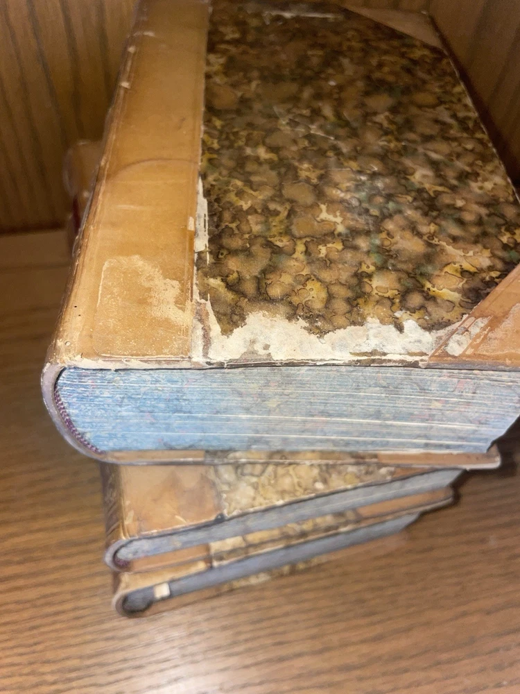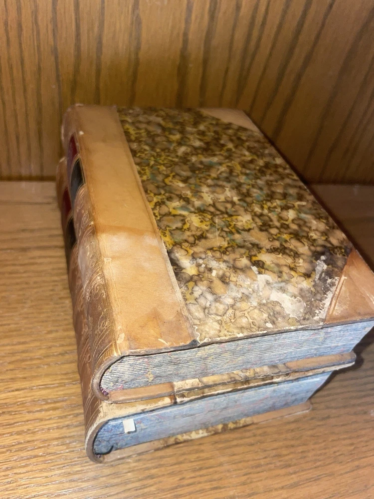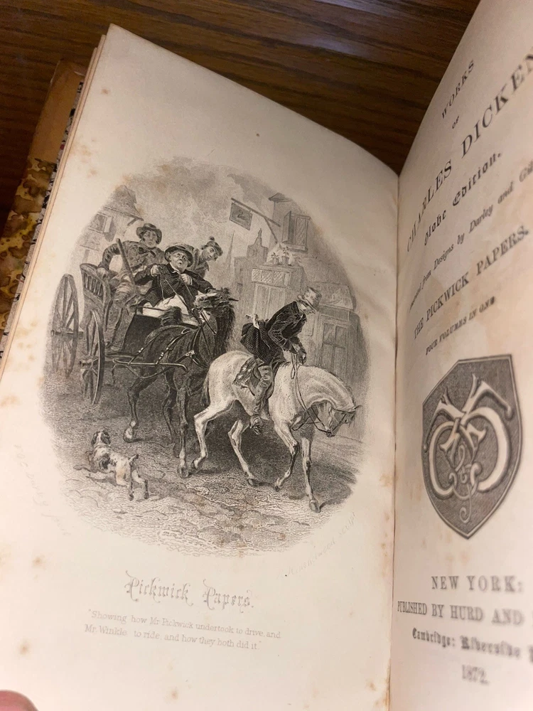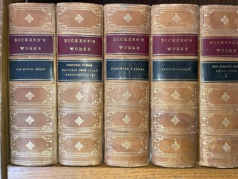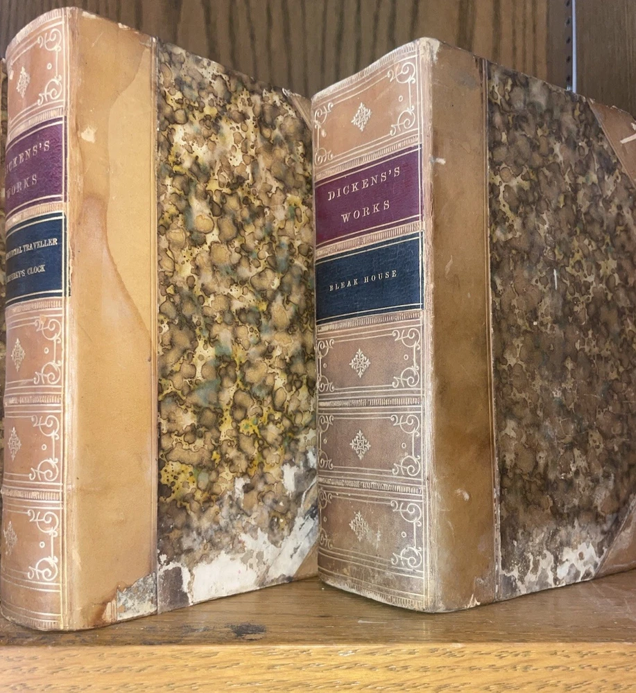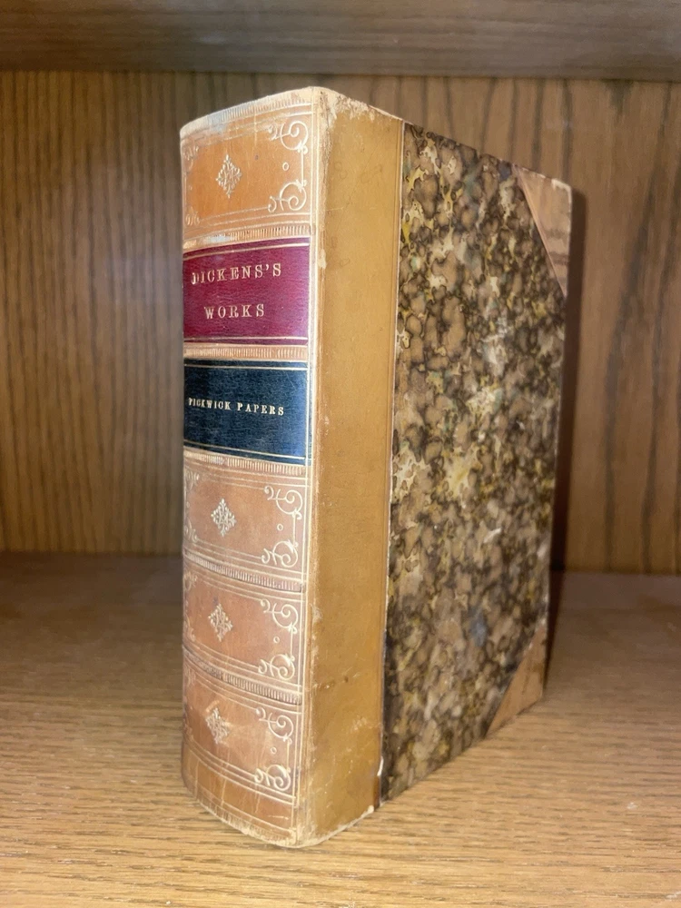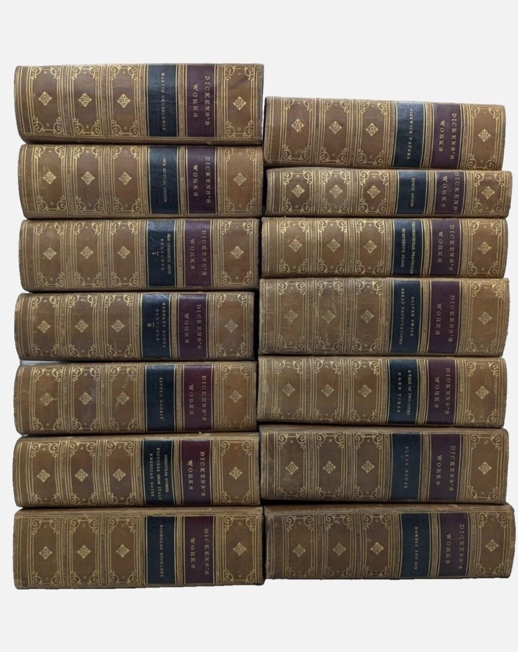 Complete Works of Charles Dickens. Complete in 14 Volumes. Printed in 1870 to 1872. The first collected edition was printed in 1870. This set is as early as possible, without being the first collected edition. The set is complete with all of the works of Charles Dickens. This set has all the titles that are found in every other set. This set is bound into 14 volumes. The Sketches volumes are subdivided into Part One and Part Two, and bound into the other books, thereby reducing the volume count from 15 volumes, to 14 volumes. Bound in the original leather bindings. The bindings are original. Quality rag paper. The paper is high quality and low acid content. The paper is not fragile or brittle as is common in later Victorian printings. Steel engraved frontisplates. Set is in very good condition overall. The leather is supple. The external hinges are all sound There is internal and separation along the paper on the inside of approximately five volumes, showing some separation from the text block. This may be bothersome. Some edge rubbing and other external wear. Set has some evidence of water exposure, and some tide marks mostly external. There is some external damage due to previous water exposure as shown in the pictures, this may be bothersome. Aside from these condition flaws this is an exceptional Victorian set of Dickens. Overall an exceptional antiquarian set of Dickens in leather. The main condition flaws are some internal separation of the bindings from the text block, and there’s some evidence of water exposure, which may be bothersome, otherwise this is an exceptional set of Dickens. The bindings are original. All external hinges are sound and the leather supple. There is internal hinge separation along the internal paper with the binding separating from the text block in some volumes. The external hinges themselves are sound. Quality paper can be read without damage. Globe Edition Printings range from 1870 - 1872 as it took 2 years to publish the set. Beautiful genuine leather and marble edge bindings on all volumes. Books have wear specifically on front and rear covers, however nothing unexpected for being over 150 years old. The spines however are in excellent condition with no sunfading. No loose or missing pages. These Globe Editions were published in various cost levels, with these leather editions being perhaps the most expensive bindings offered by the publisher. Full marbling on all edges, very nicely tooled leather with gold details, etc. These measure 7 inches tall. This set takes up approximately 28 inches of shelf space. This set is complete with all Charles Dickens works. Works include: Little Dorrit Christmas Stories Pictures from Italy American Notes A Tale of Two Cities Hard Times Old Curiosity Shop Sketches (1 and 2) (subdivided and bound into two other volumes) Bleak House Martin Chuzzlewit Nicholas Nickelby Our Mutual Friend Dombey and Son Barnaby Rudge Pickwick Papers Edwin Drood Uncommercial Traveler Humphrey's Clock Oliver Twist Great Expectations Quality paper. Paper is fresh. Leather supple. Very good overall, some internal separation and some water exposure to some volumes. Some generalized abrasion. All external hinges sound. Very good overall. Good only to some areas. Still an exceptional Victorian set of Charles Dickens in the original bindings. This will be well protected for shipping. Please see my other listings for similar books. 2025.05