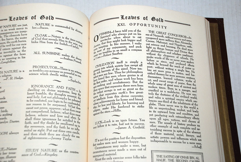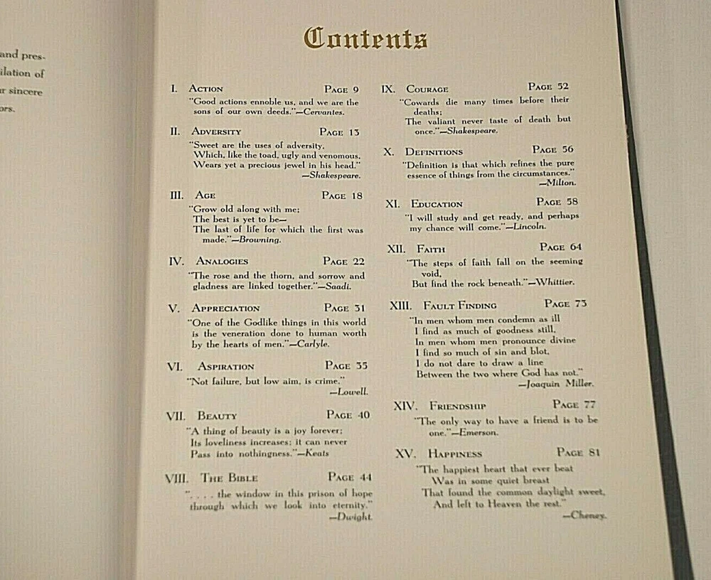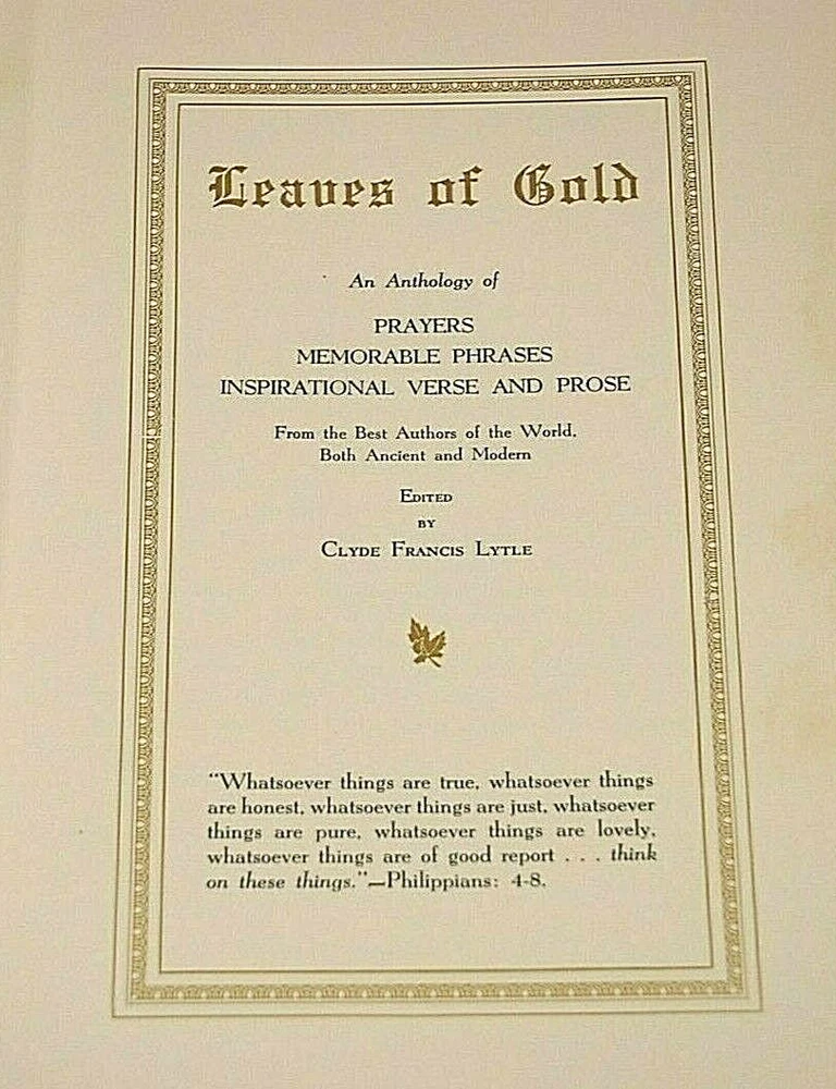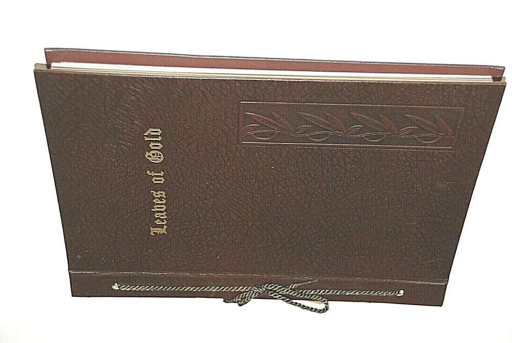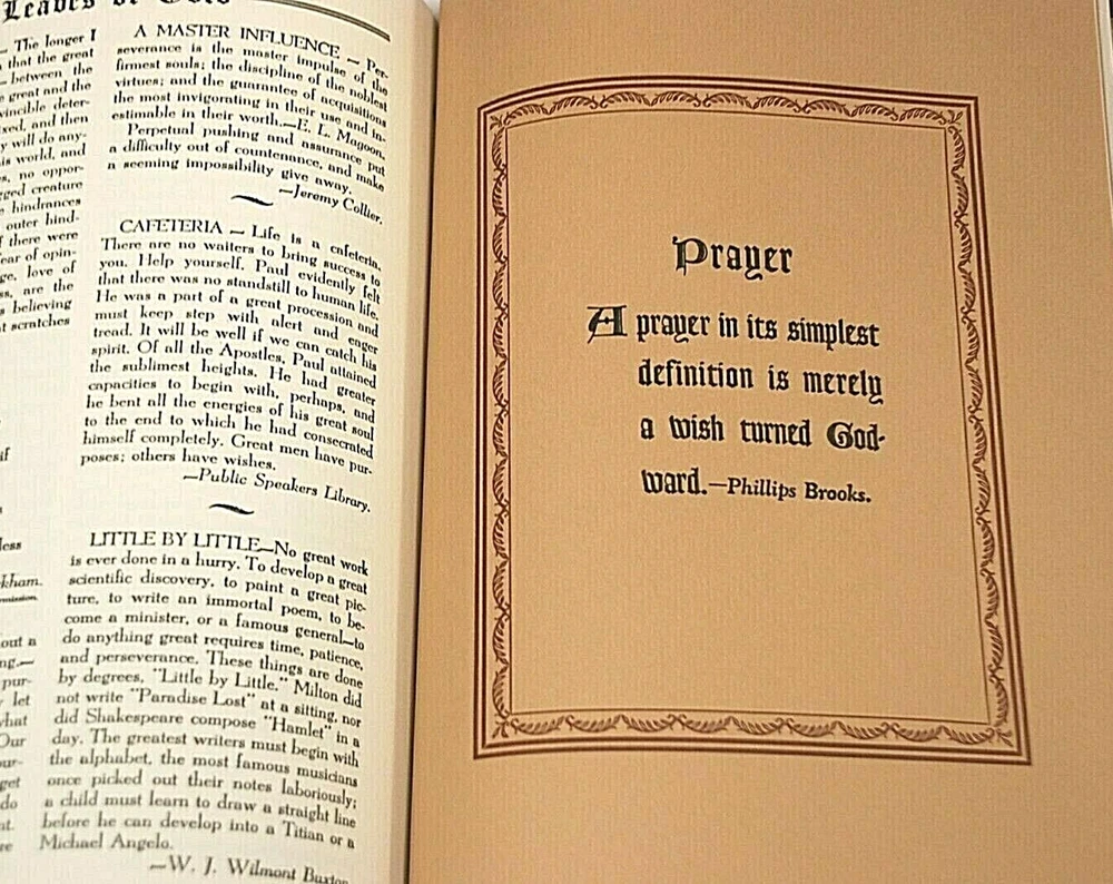 Vintage LEAVES OF GOLD Anthology of Prayers Verses Inspirational Phrases Prose 1948 Christian. Leather hardcover. Leaves of Gold is a timeless collection that captures the essence of spiritual reflection and inspiration. This vintage anthology compiles a rich tapestry of prayers, verses, and thought-provoking phrases that have been cherished for generations. With its eloquent language and profound wisdom, it serves as a source of comfort and guidance for anyone seeking solace and strength. The anthology features a harmonious blend of classical and contemporary works, offering a diverse array of spiritual insights that resonate with the heart and mind. Whether you're seeking a moment of quiet meditation or words of encouragement in times of need, Leaves of Gold provides a treasured source of wisdom to uplift and inspire. This vintage edition is not just a book—it's a legacy, a beautifully bound collection of heartfelt expressions meant to nourish the soul and ignite the spirit. Perfect for collectors, those seeking spiritual growth, or anyone who appreciates the beauty of poetic and prayerful writing, Leaves of Gold continues to shine as a beacon of light in the ever-evolving journey of life. It's in very nice pre owned condition with no ripped pages. It looks like it hasn't been read through very often. (Please see photo) It's been sitting on a shelf in a smoke free home for many years.