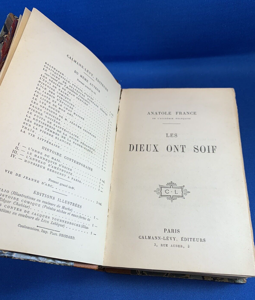 For your consideration....LES DIEUX ONT SOIF (The Gods are Thirsty). Leather Bound Hardcover. Published by Calmann-Levy Publishers, Paris, France. 1912. 360 pages. Written in French. The book is in good condition with secure spine and binding. Title on outside spine is blocked out. Marbling to outside of covers. The first few pages are loose, but attached. Includes a cloth bookmark. A good looking book for your collection! Please see photos for details. Shipping via Media Mail in U.S. International shipping via International First Class, as calculated by eBay. Please view my other items for combined, discounted shipping. Thanks for looking!