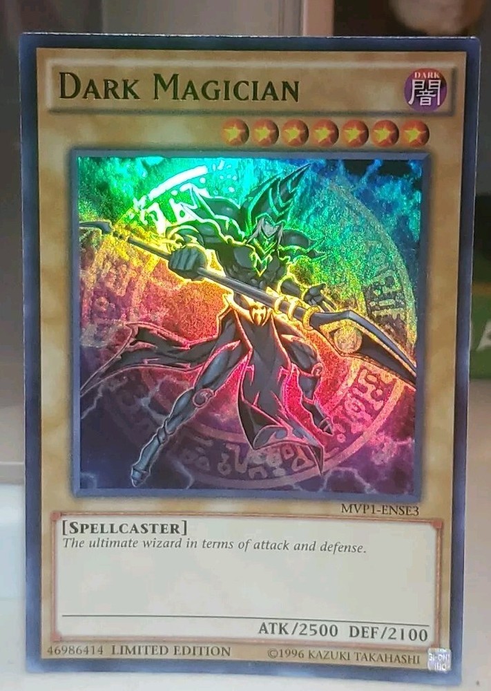 This rare and limited edition Dark Magician card from the Yu-Gi-Oh! TCG features a stunning holo finish that is sure to impress any collector. With its ultra-rare status, this card is a must-have for any serious player or fan of the game. The card is manufactured by Konami and is part of the MVP1-ENSE3 series. Its attributes include the color darkness, and it is categorized under Toys & Hobbies, Collectible Card Games, and CCG Individual Cards. Don't miss your chance to own this amazing card!