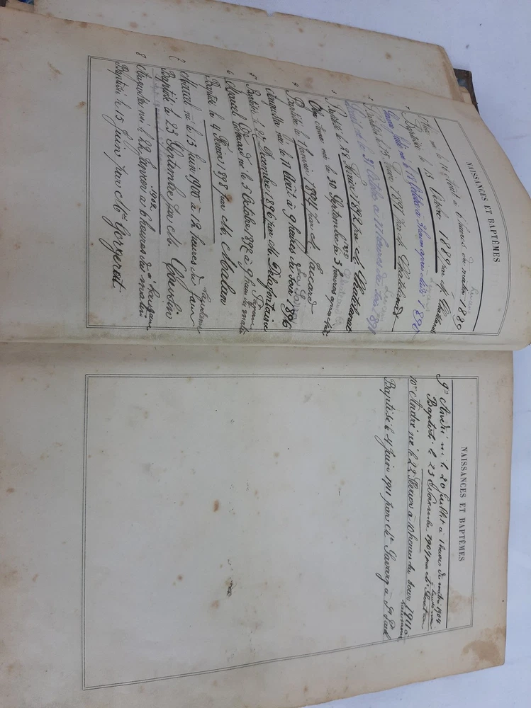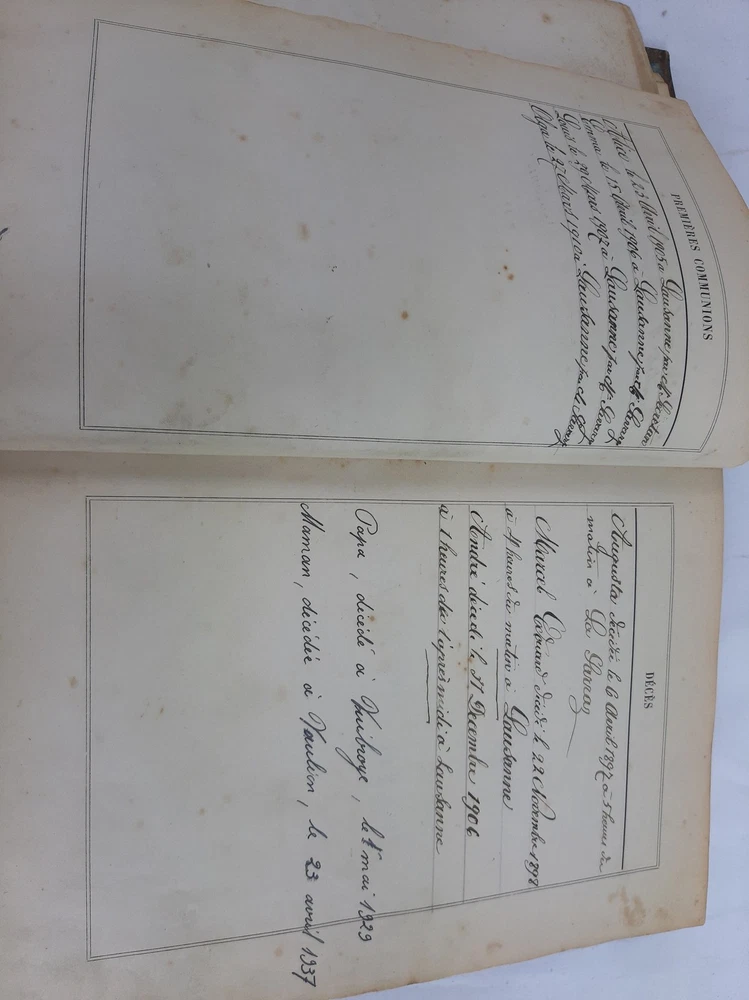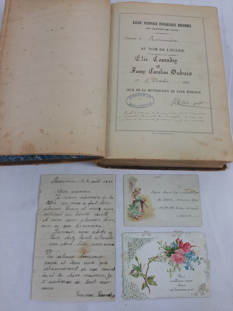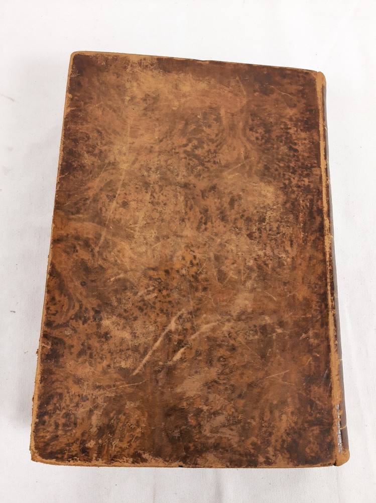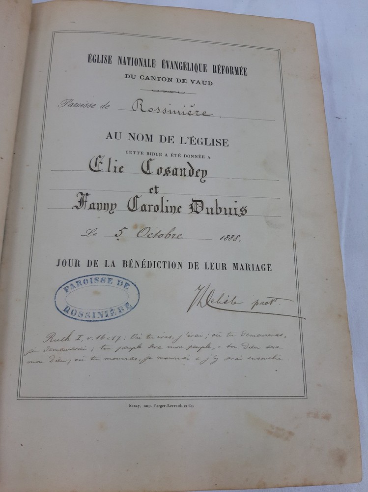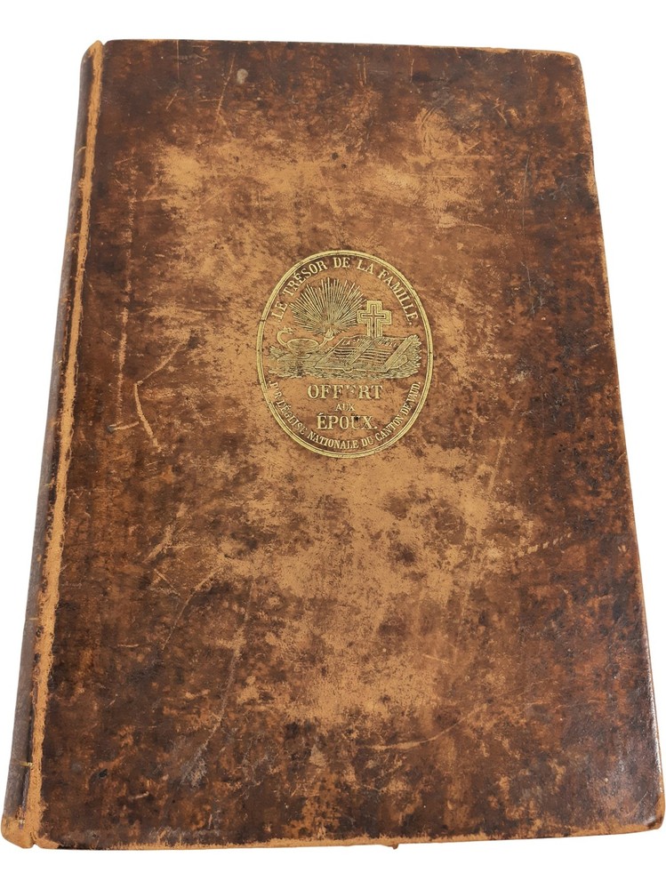Description: Leather bound religious text with gold embossed design on cover. Includes records of marriages, baptisms, and deaths. Published by Impr. Berger-Levrault et Cie. Condition: Used - Good. The book shows signs of age-related wear with scuffs on the cover and edges. Please see photos.