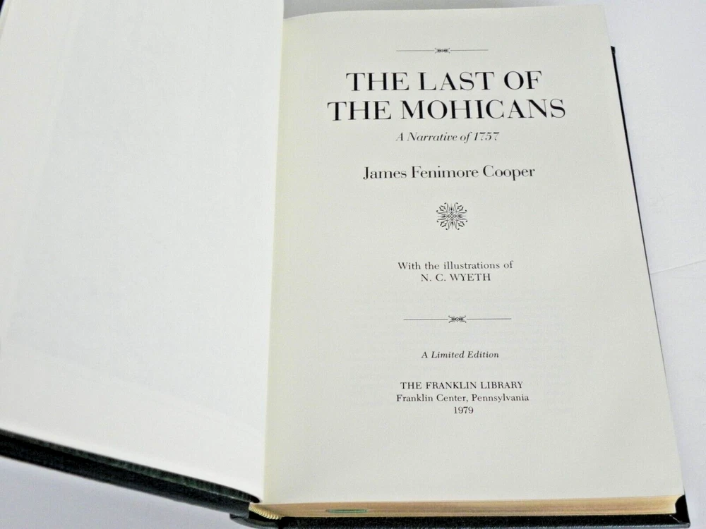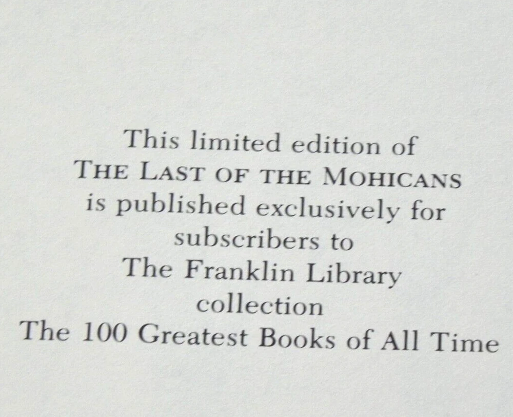 This stunning Franklin Library edition of *Last of the Mohicans* is a true collector's gem. The genuine leather binding, gilt edges, and raised spine bands give it a luxurious feel, while the moiré endpapers and ribbon bookmark add elegance. It looks practically untouched—like new—with only slight fading on the endpaper edges. Perfect for fans of classic literature or collectors of fine editions, this book is a beautiful display piece and a pleasure to hold. The craftsmanship is outstanding, making it a worthy addition to any library. Highly recommended!