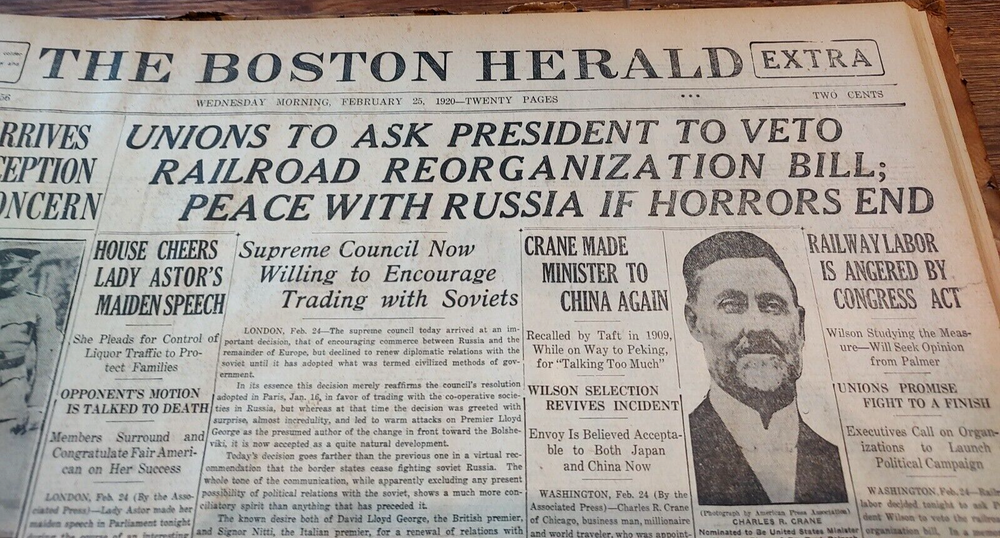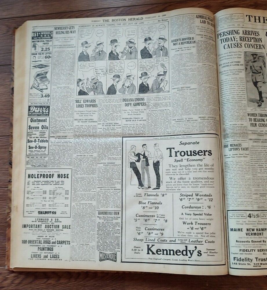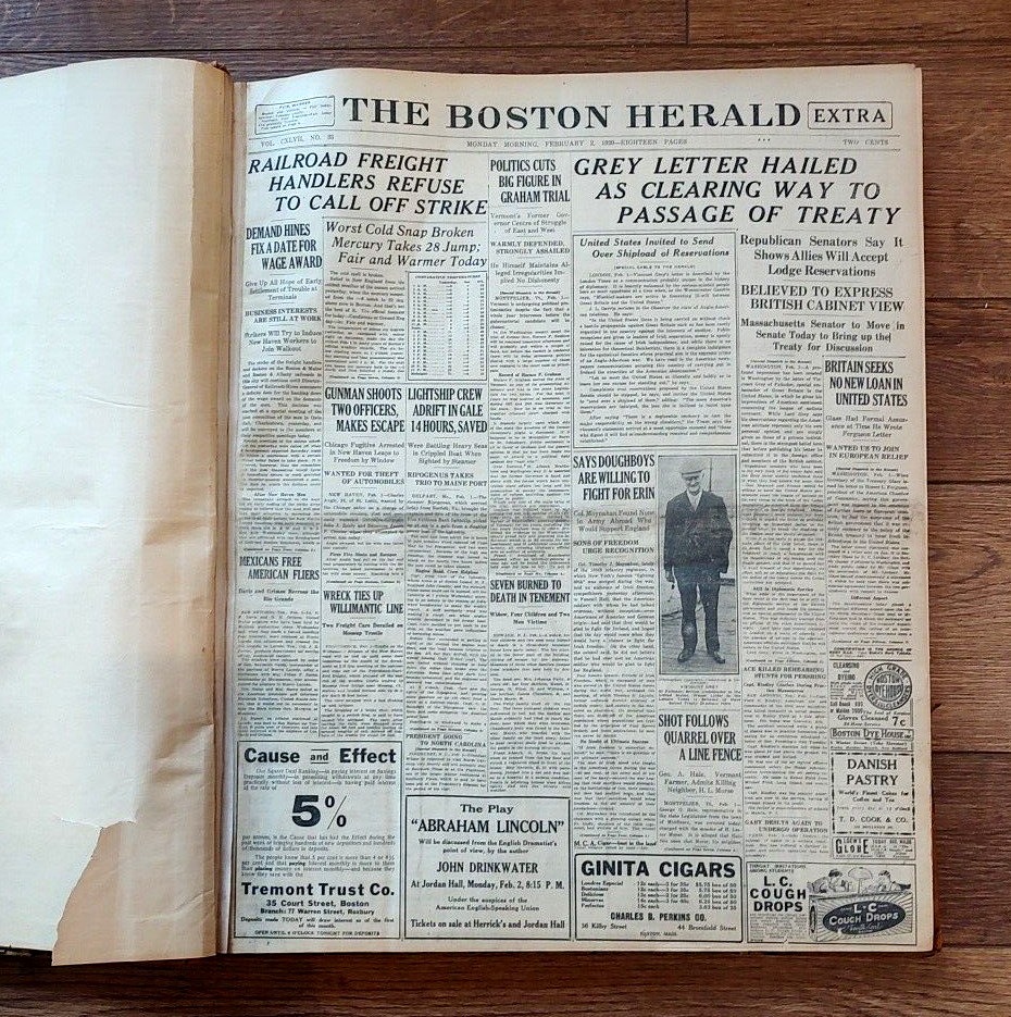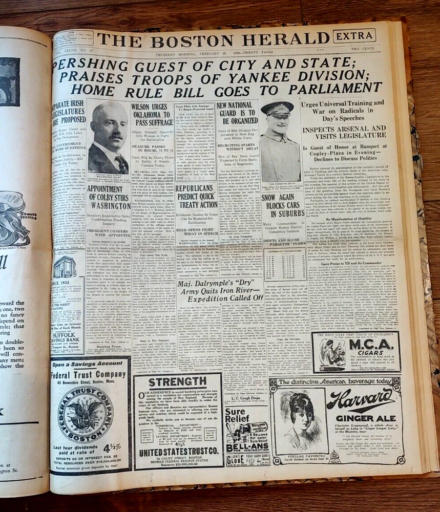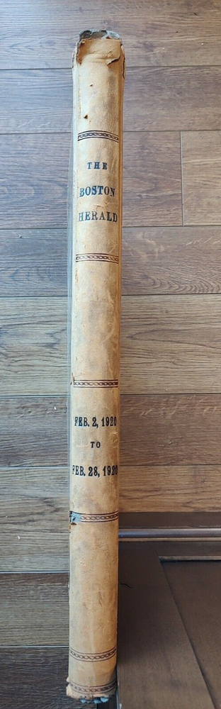 Leather Bound Boston Herald Newspapers Feb 2-28 1920. No Sunday issues, weekdays only. 103 years old!! Post World War 1 issues. Almost all of the pages are intact. A few have short tears on the edges. found 2 articles that were cut out of newspaper. Dimensions: 23 x 19 x 2. Fascinating! See pictures.