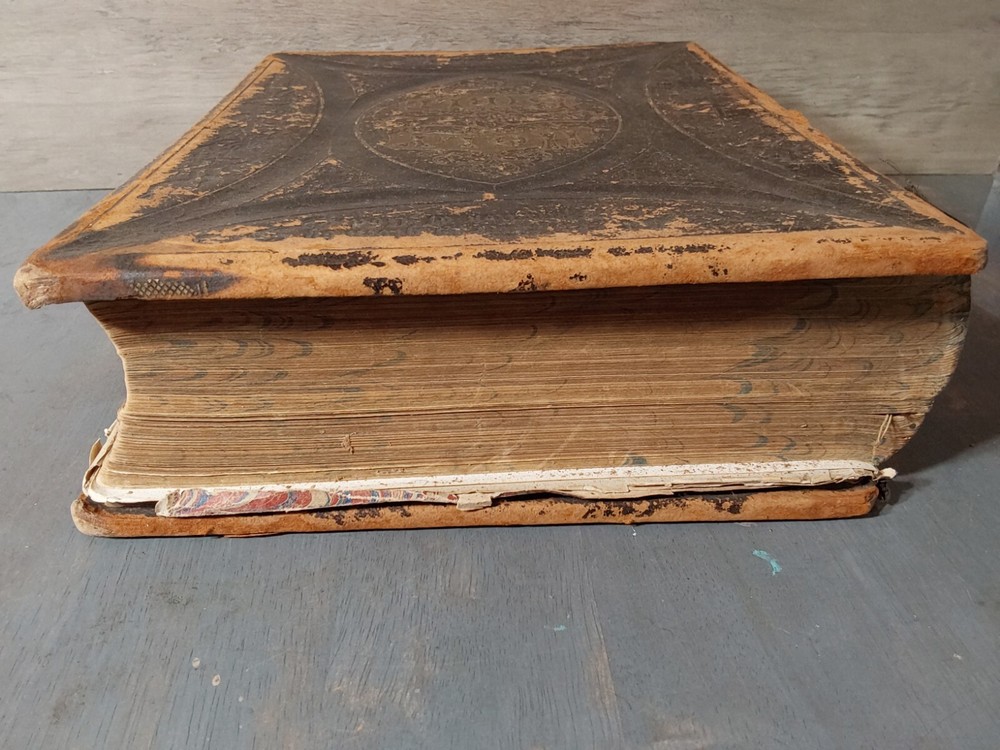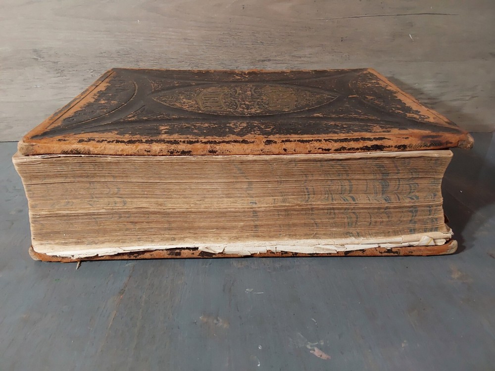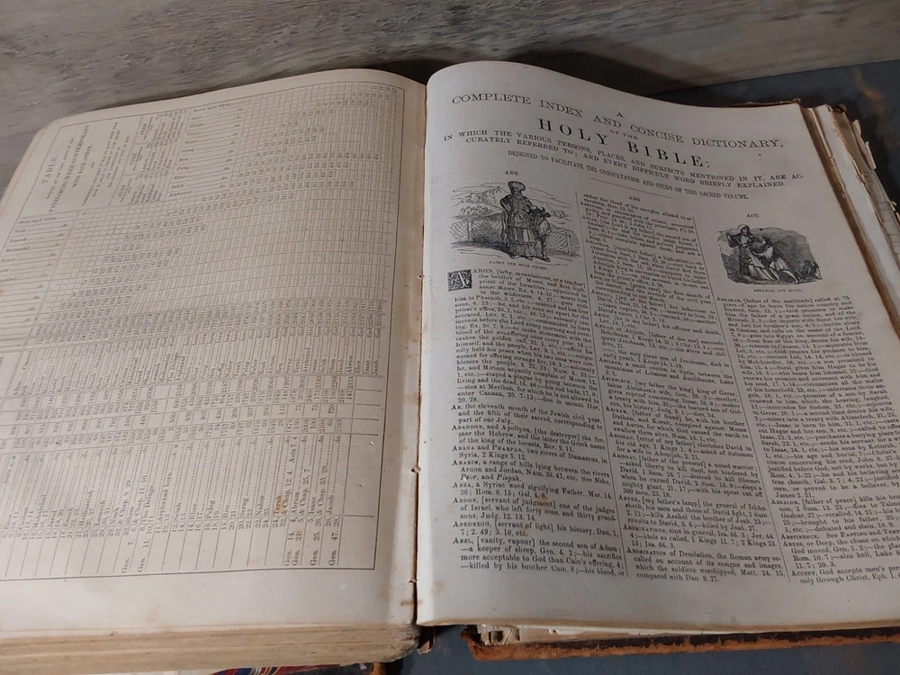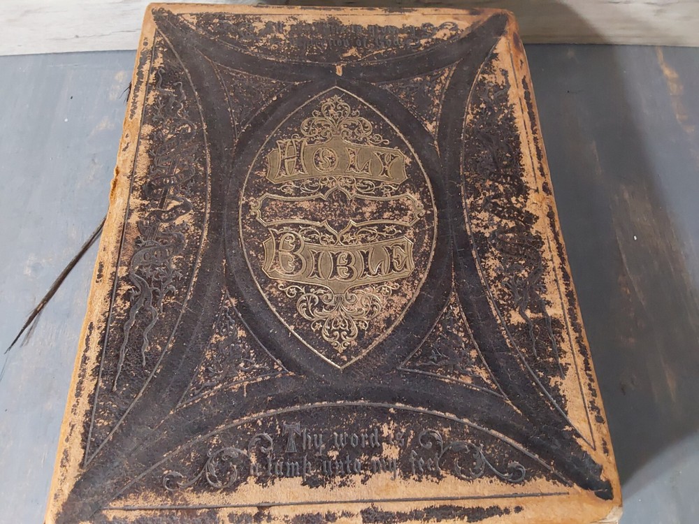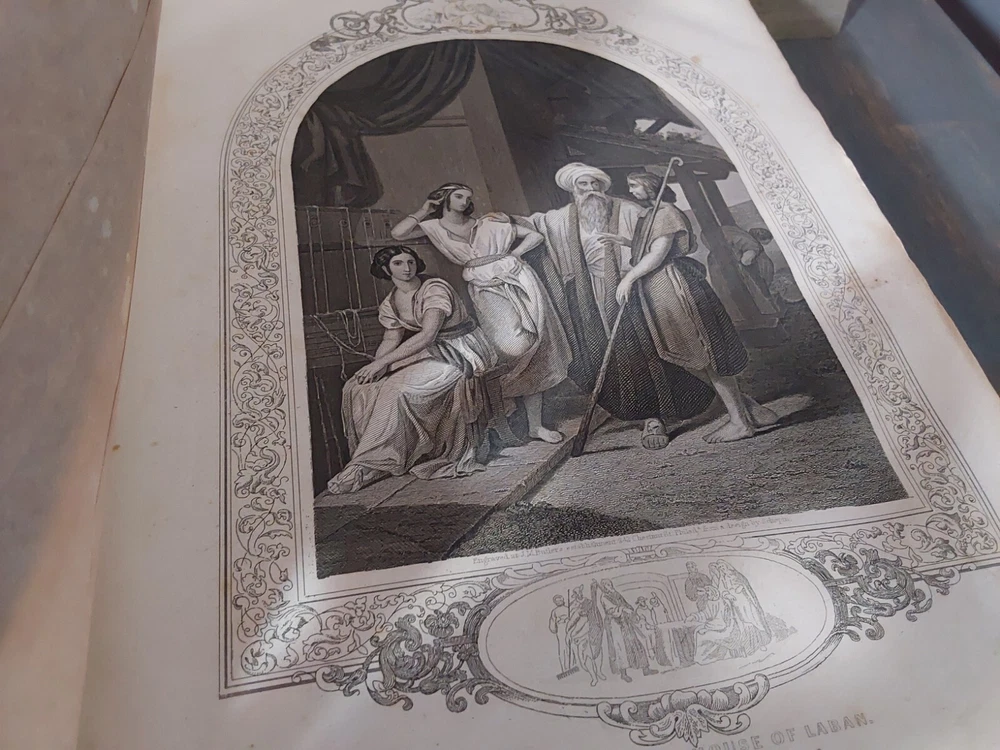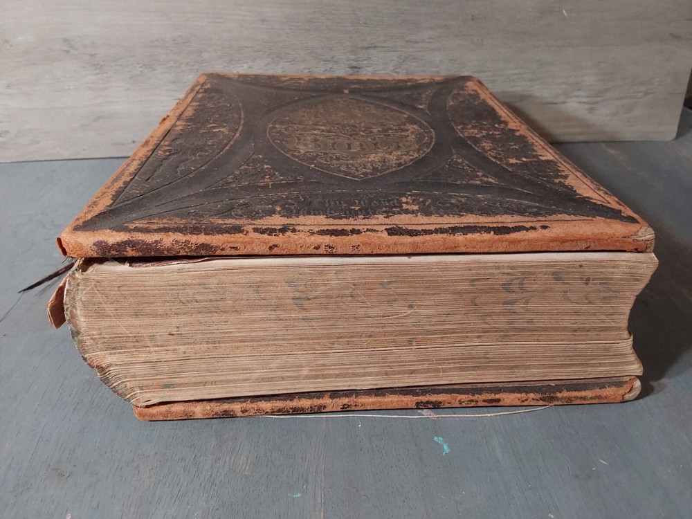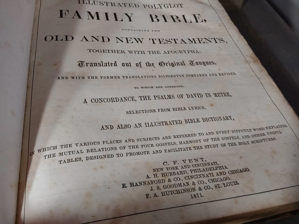 Leather Bound Family Bible 1871 Illustrated Polyglot Old/New Testaments HC main book is still bound to the spine top cover is detached and 1st page pages are marked with old spots does have that old book musty smell to it There are of family photos in the back in leaving them in there - I believe if it's in the book it should stay with the book